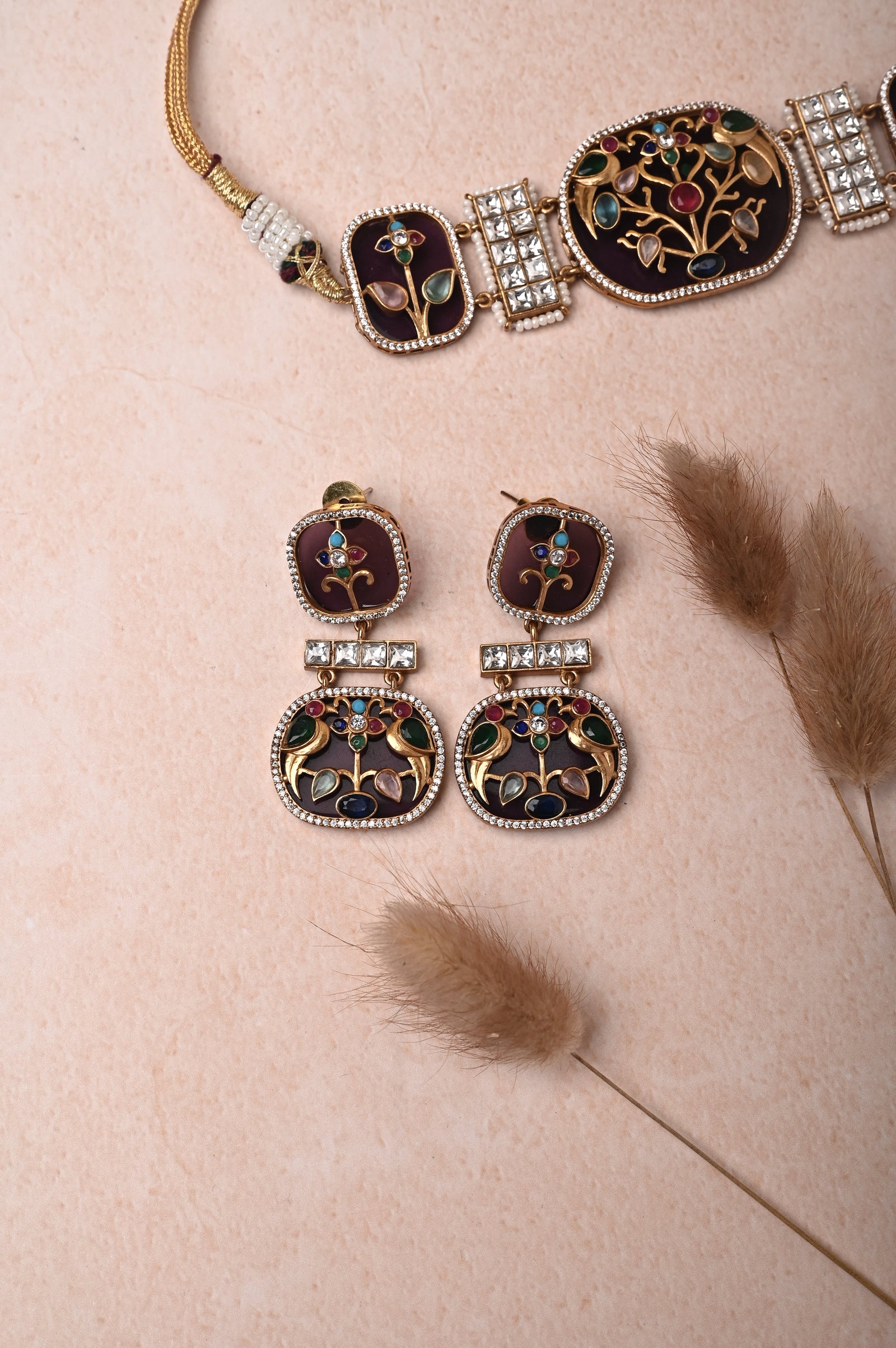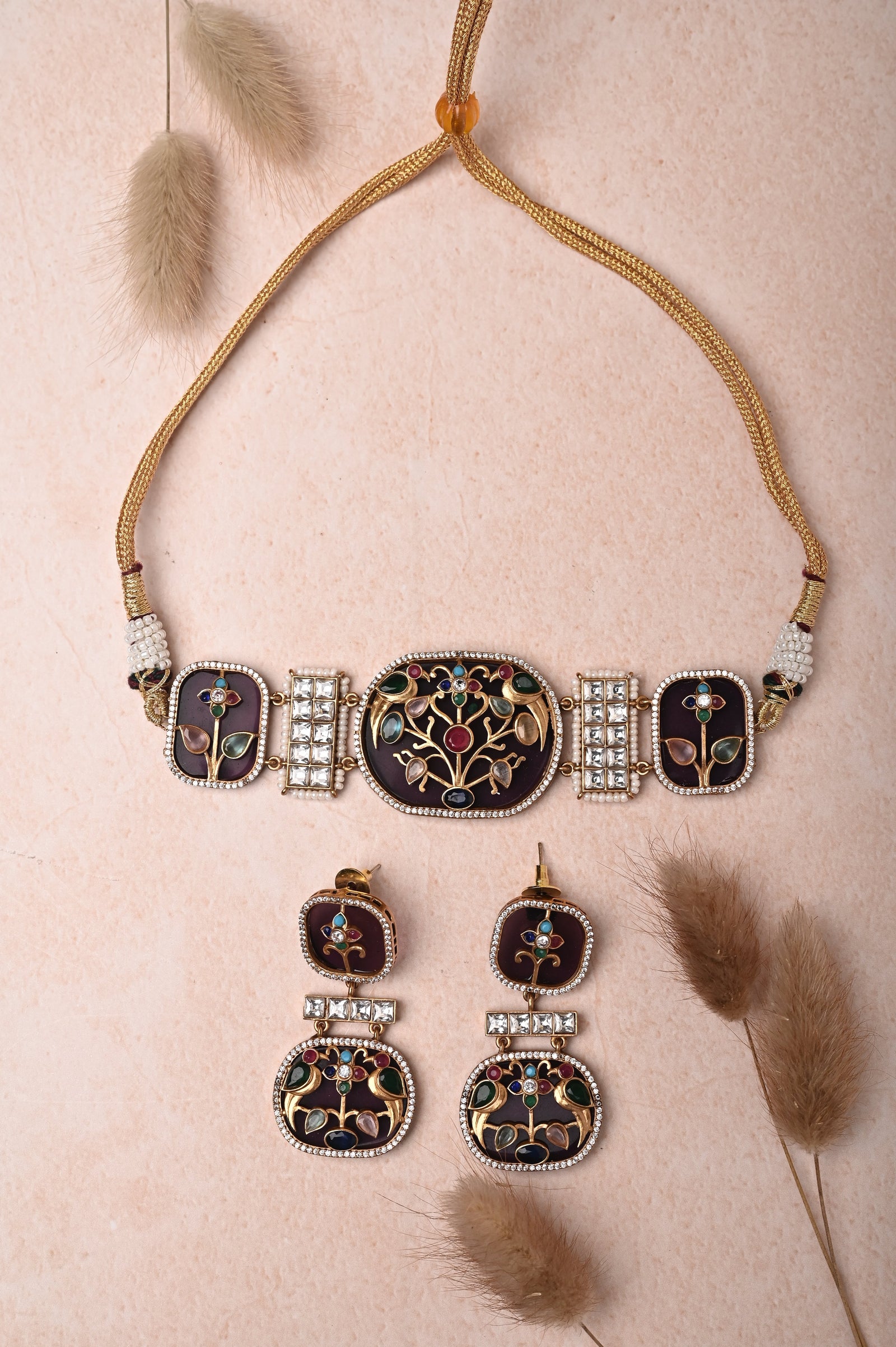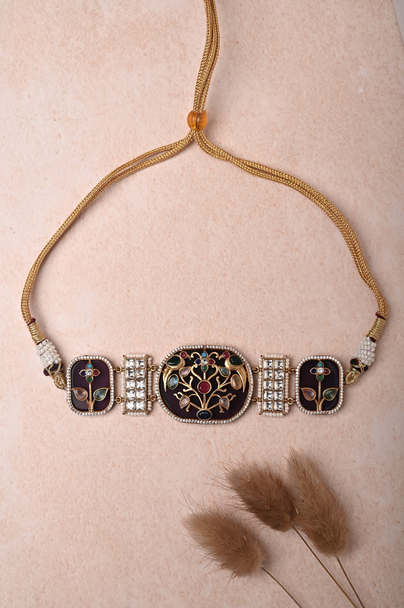 Sprinkle some sophistication into your next outfit? Elevate your fashion game with our fancy golden metal statement bridal choker set! Adorned with stunning Monalisa gems and sparkling AD stones, this set is lightweight and ultra-stylish. It sits perfectly on your neckline, ensuring all eyes are on you at any occasion. And guess what? It even comes with matching chunky stud-style jhumkas to round out your fabulous look. The penny is kept aside to make you understand the real size of the object.