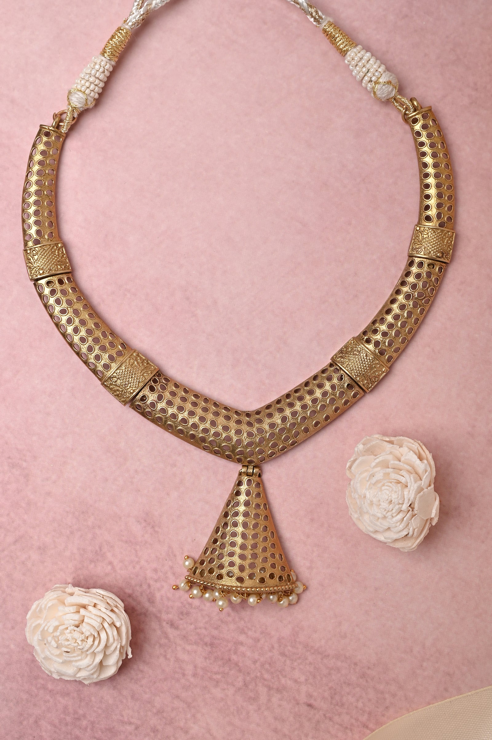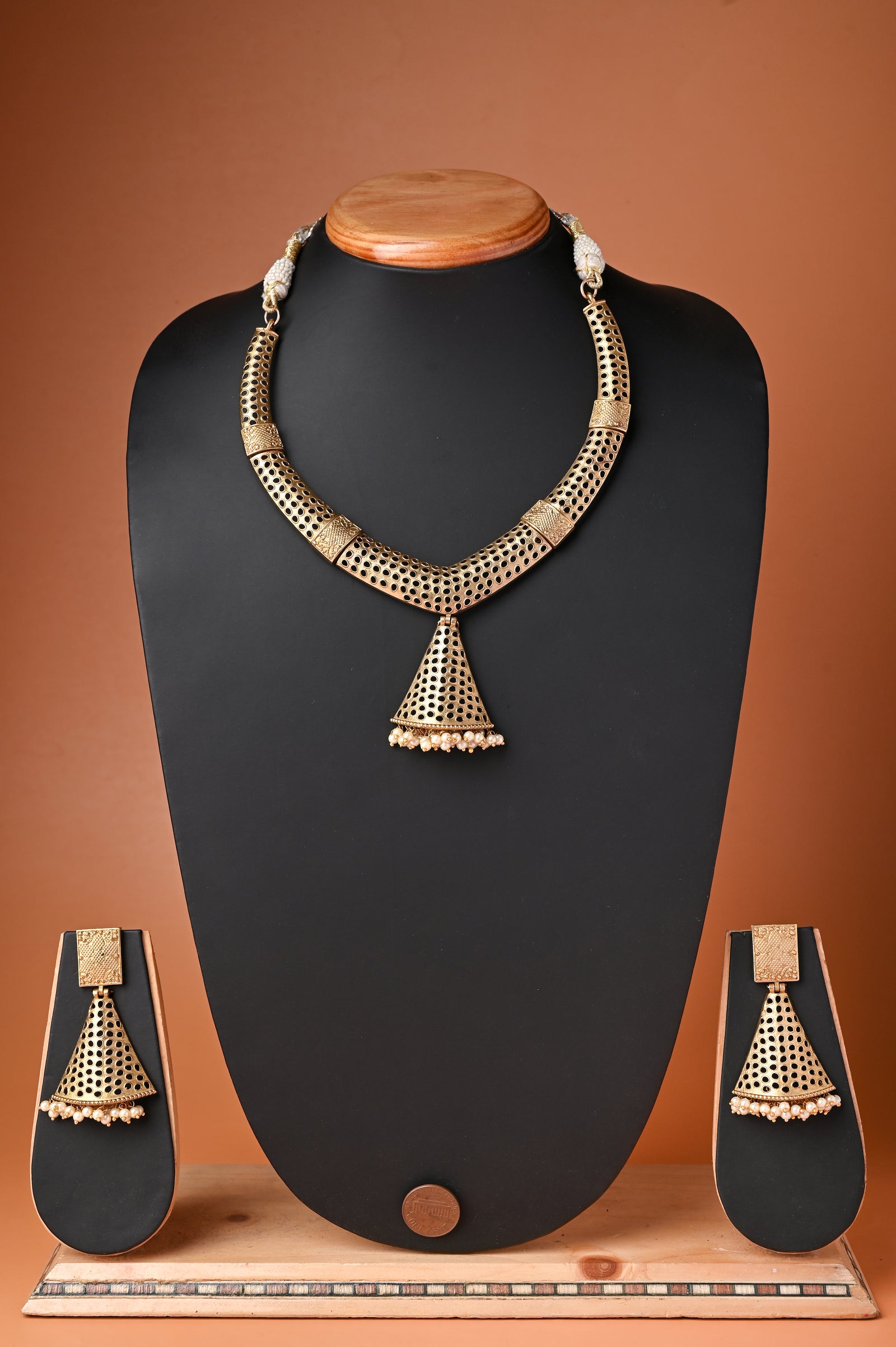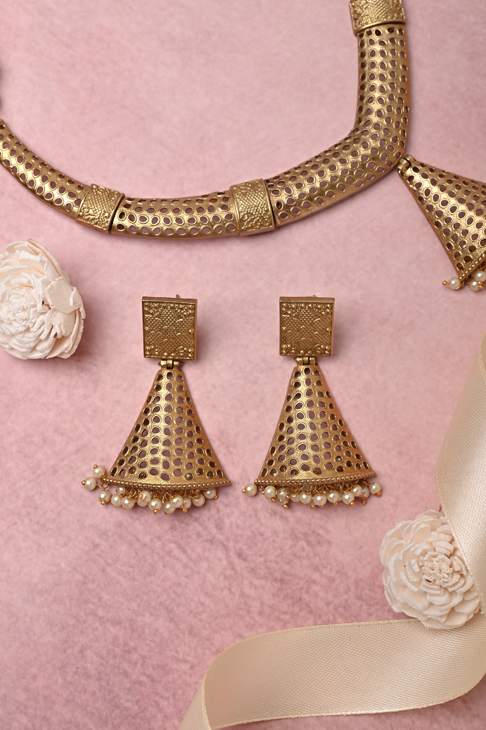 Rock this golden necklace set in a hansuli style with a perforated design that gives it a chic collar look. Complete with a dangling triangle pendant and matching jhumkas, this set is sure to catch your attention. Perfect for adding a touch of elegance to any outfit! The penny is kept by the side to help you understand the size of the product.