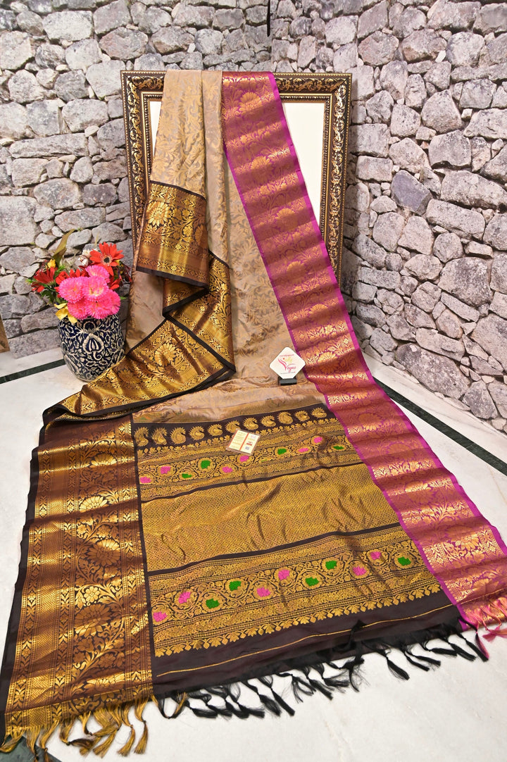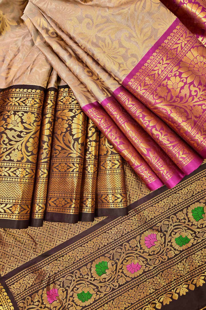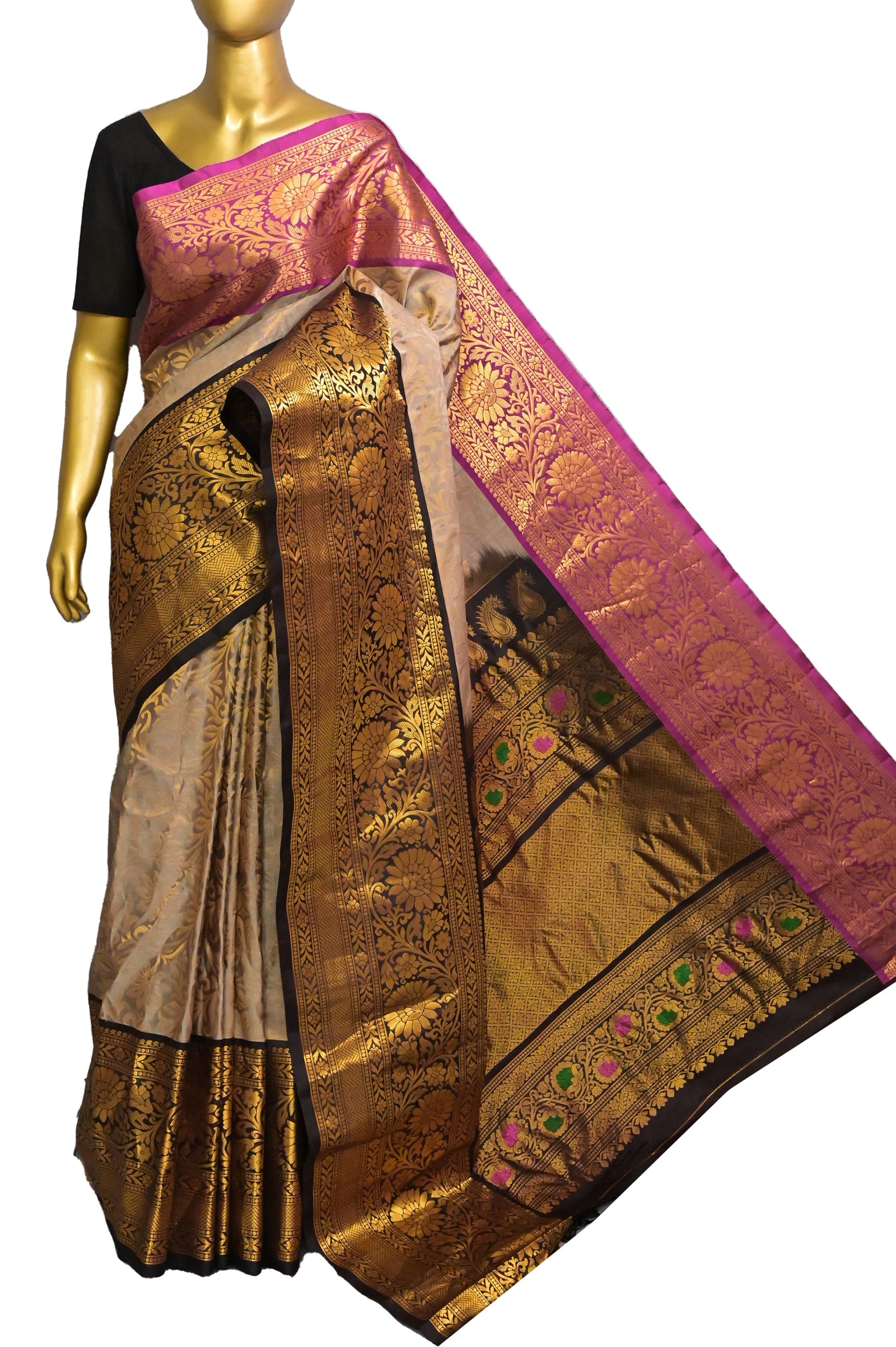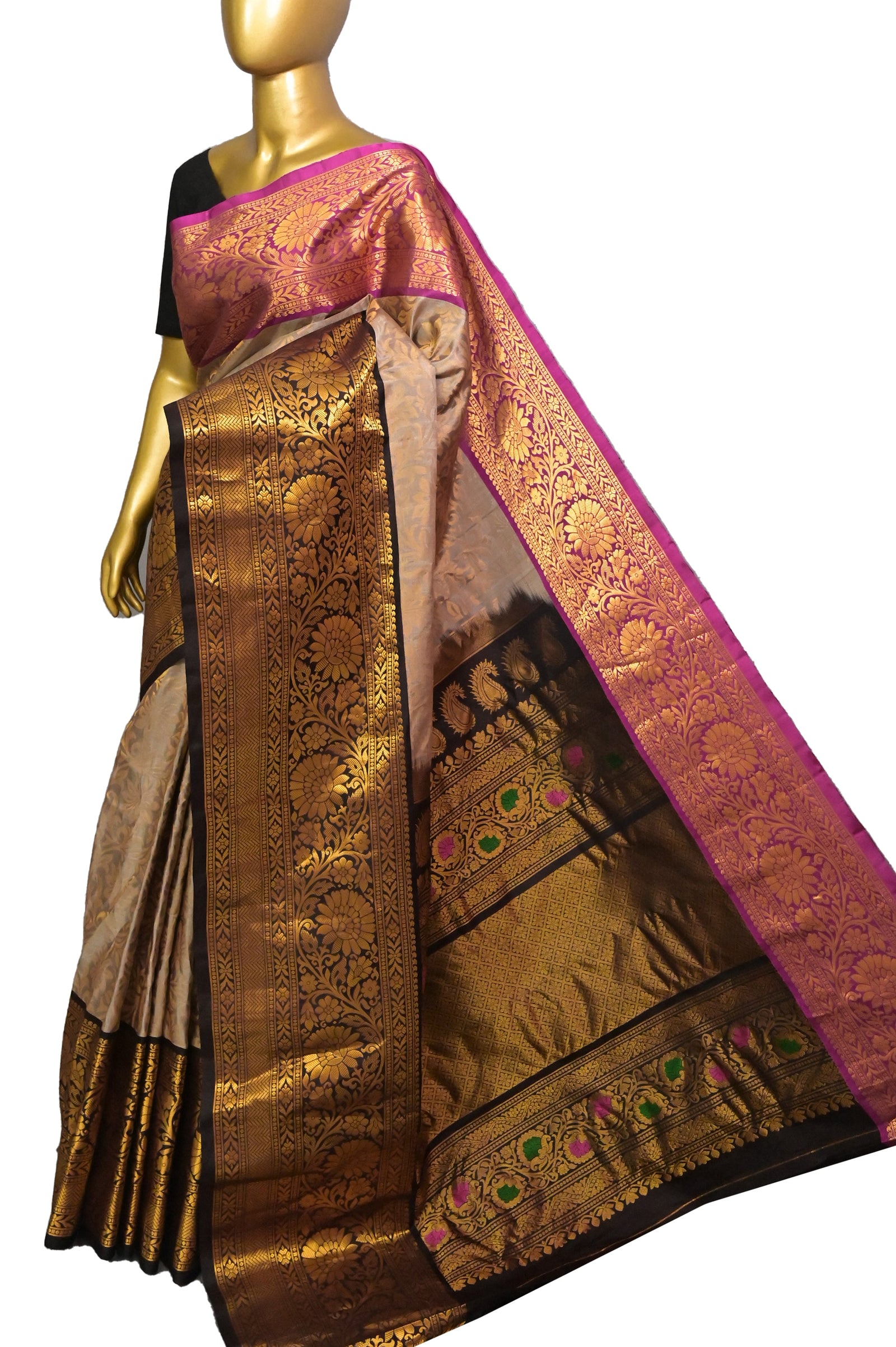 This pure Gadwal saree in an elegant soft gray color features intricate allover floral brocade weaving. The broad Ganga Jamuna border in contrasting black and raspberry adds a striking touch. Paired with a contrasting blouse piece.