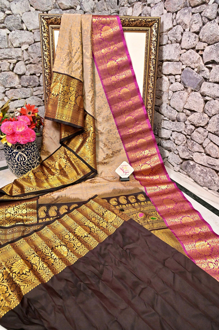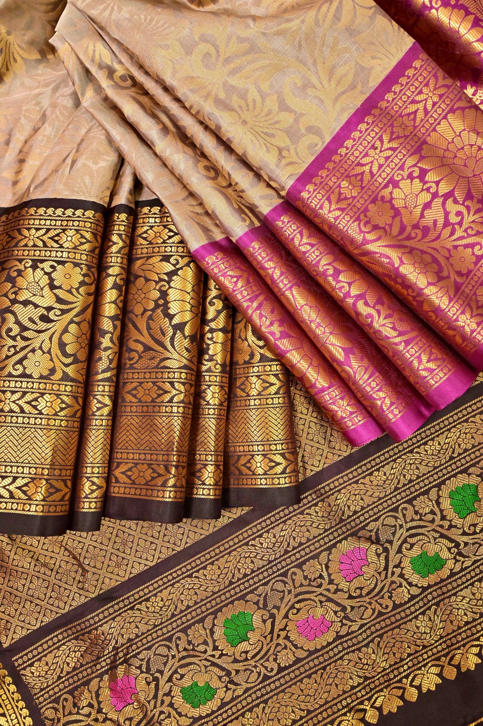 - Technique: Amazing traditional antique zari weaving on the pallu and the border, meenakari work on pallu, with allover body floral brocade weaving
