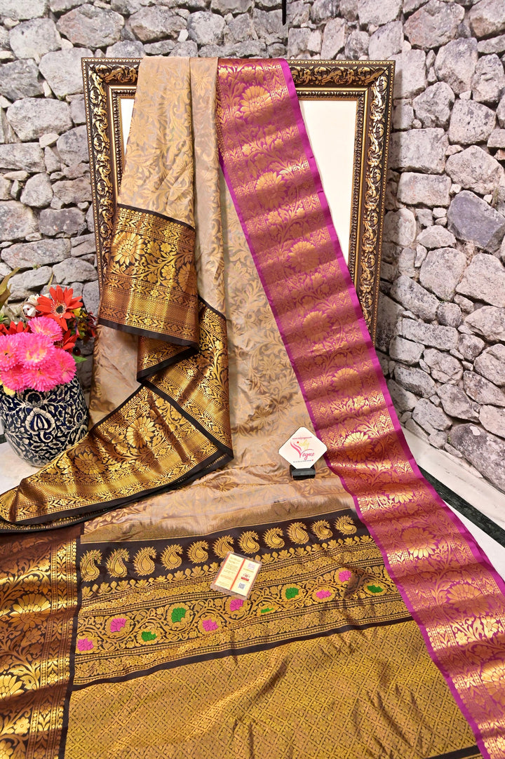 Graceful Gray Brocade Gadwal Saree with Ganga Jamuna Border