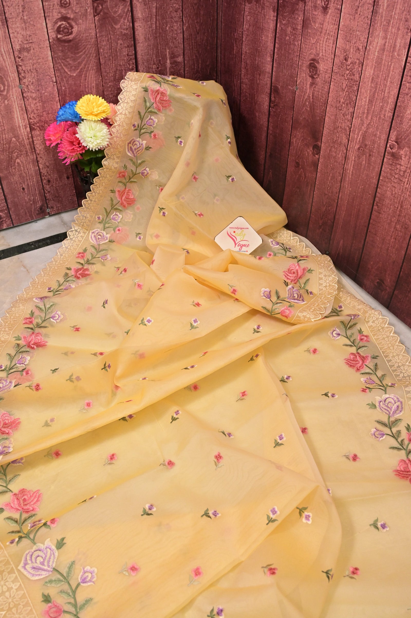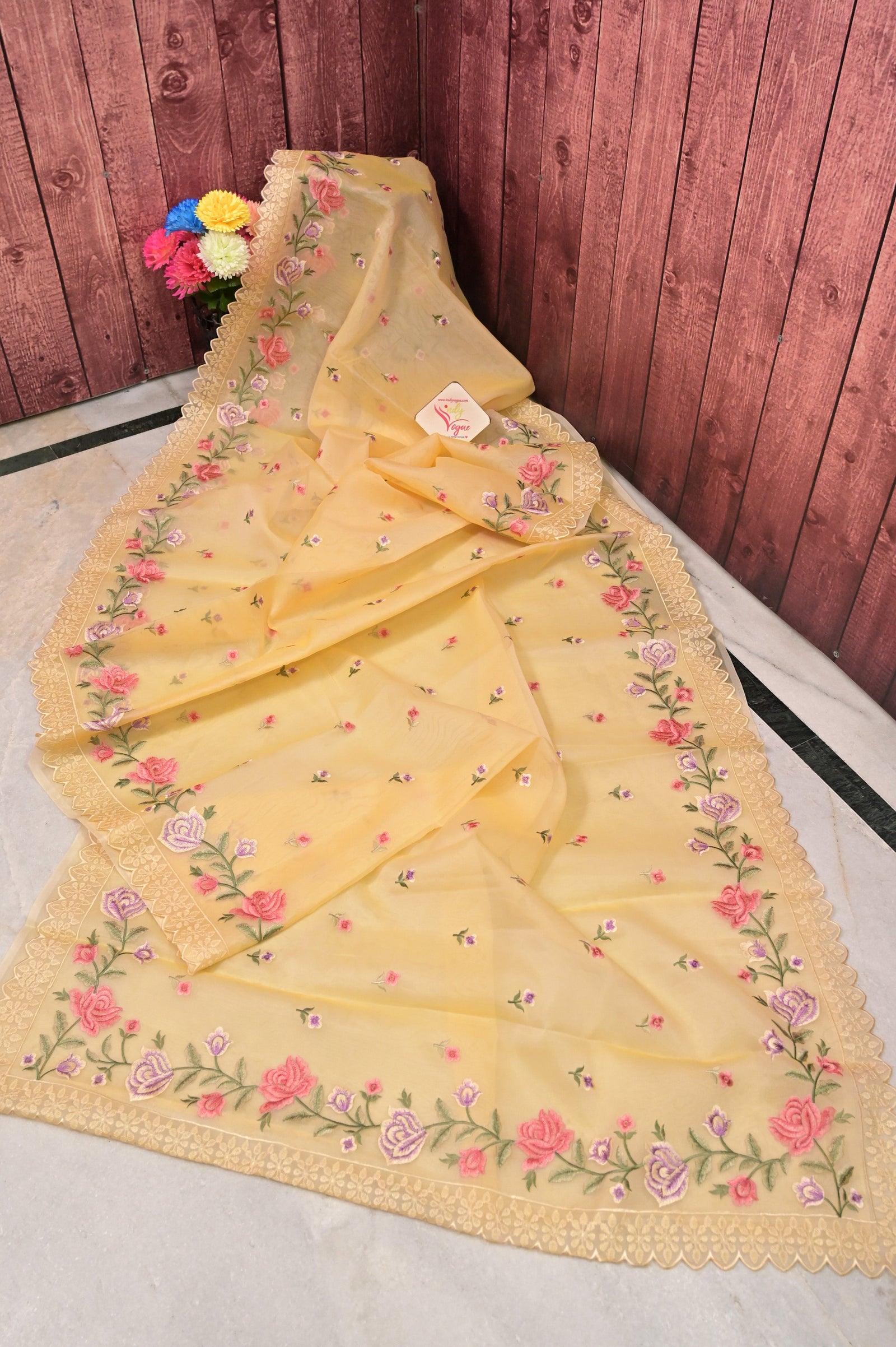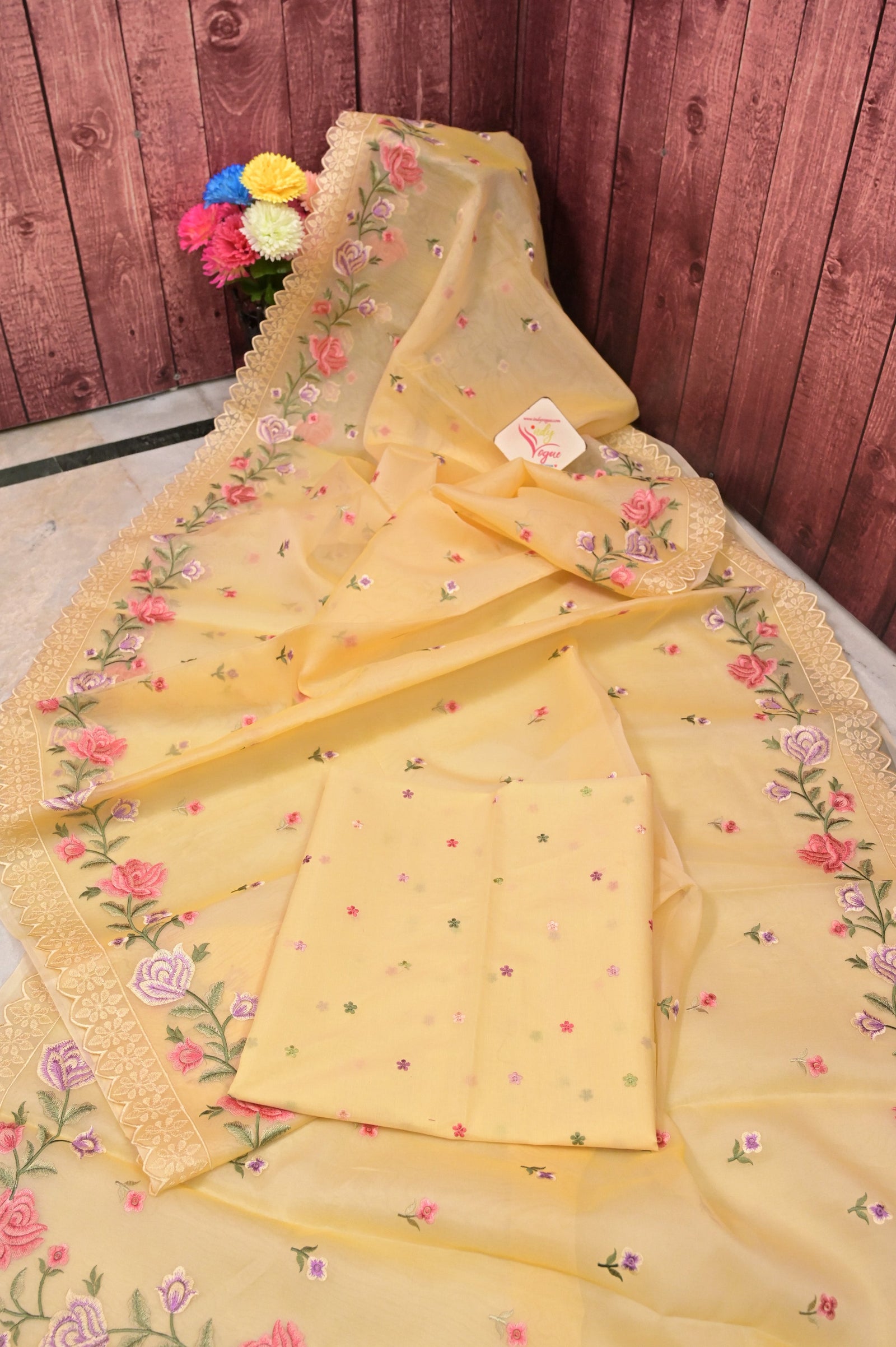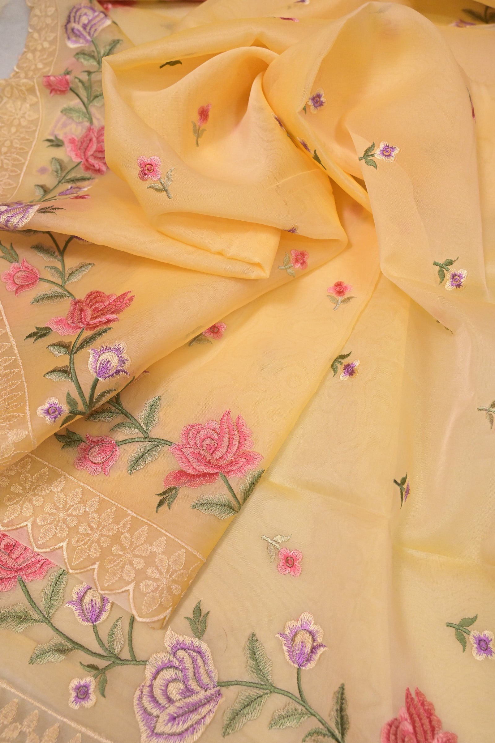 This elegant light apricot yellow organza saree features intricate multicolor floral embroidery with resham butis throughout the body. The scalloped borders add a delicate and refined finish. Paired with a matching blouse piece, this saree is perfect for daytime festivities and celebrations.