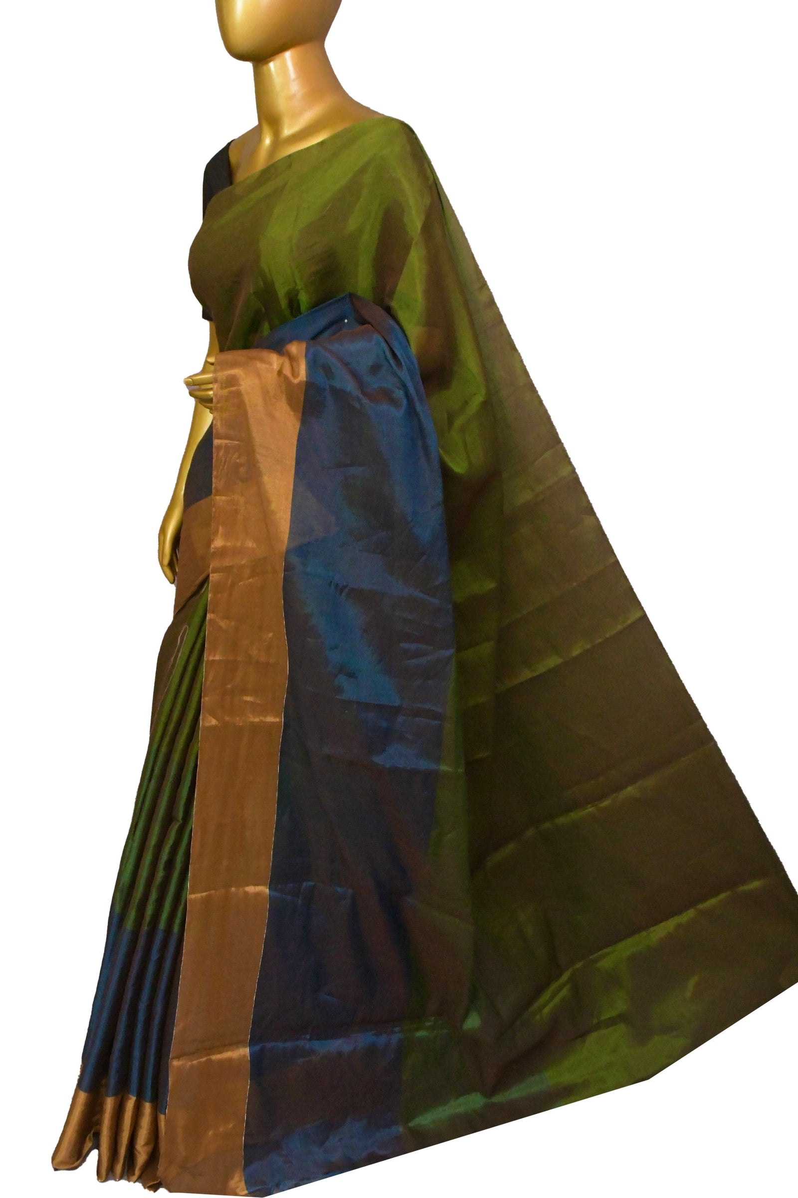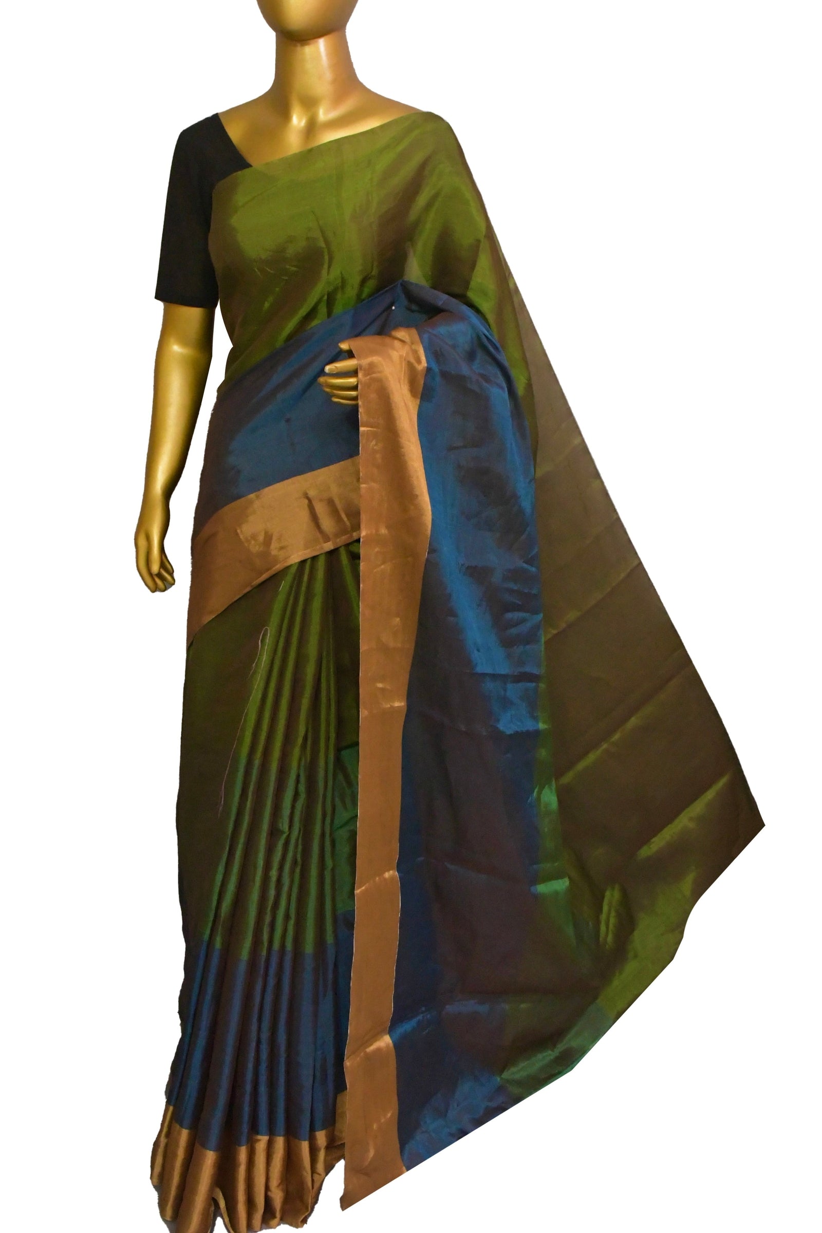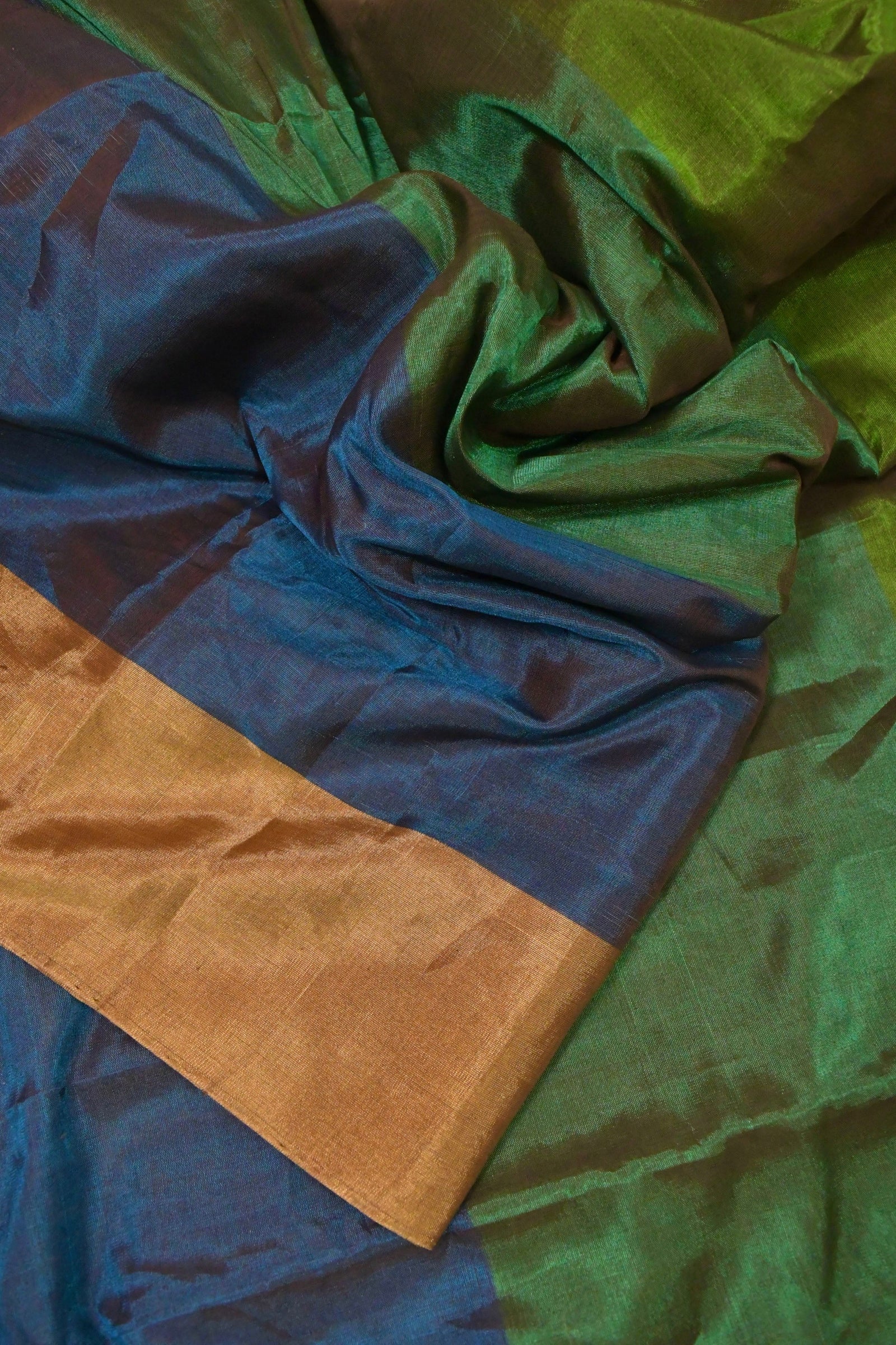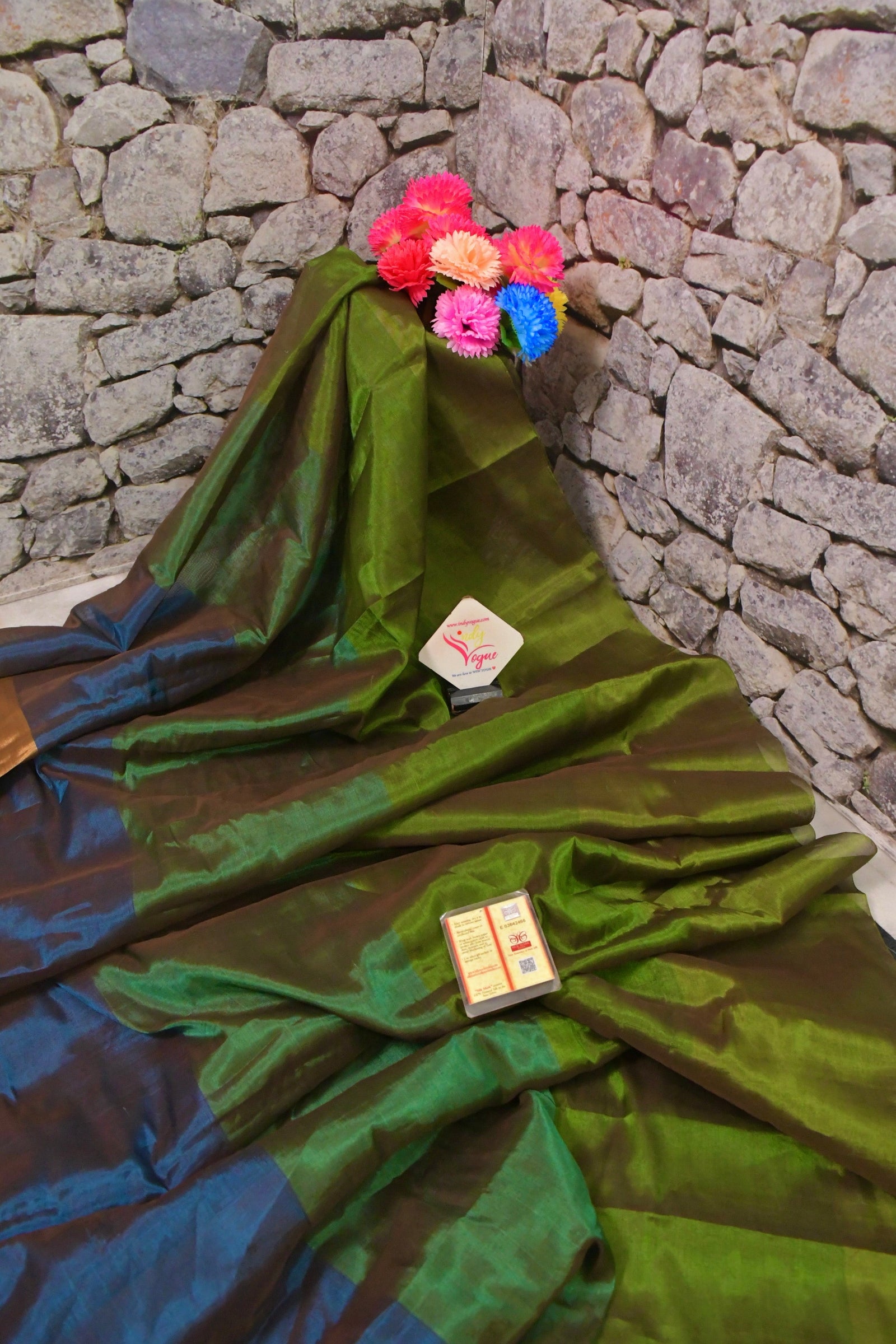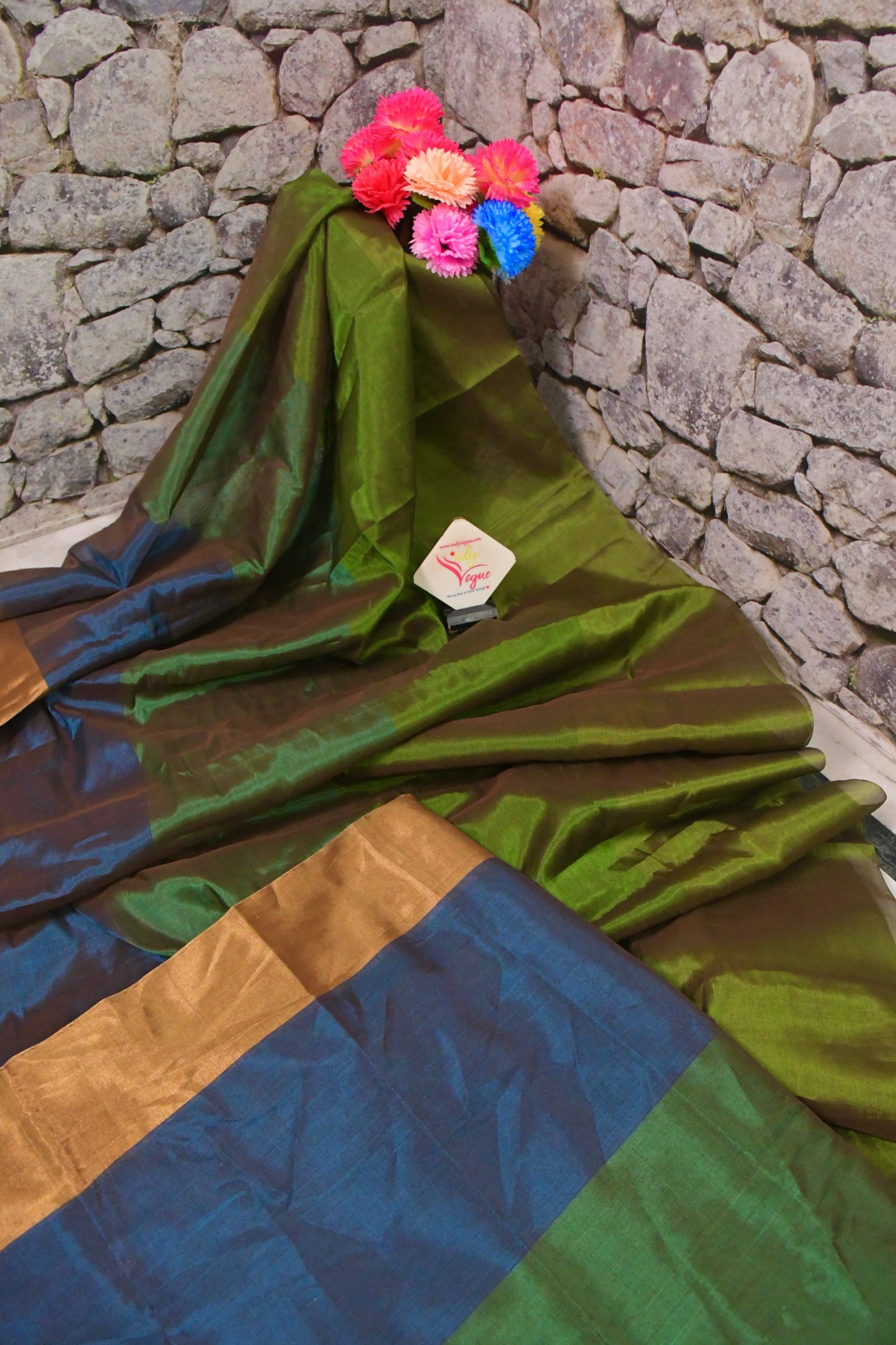 Green and Blue Color Dual Tone Pure Tissue Chanderi Banarasi Saree with Golden Border
