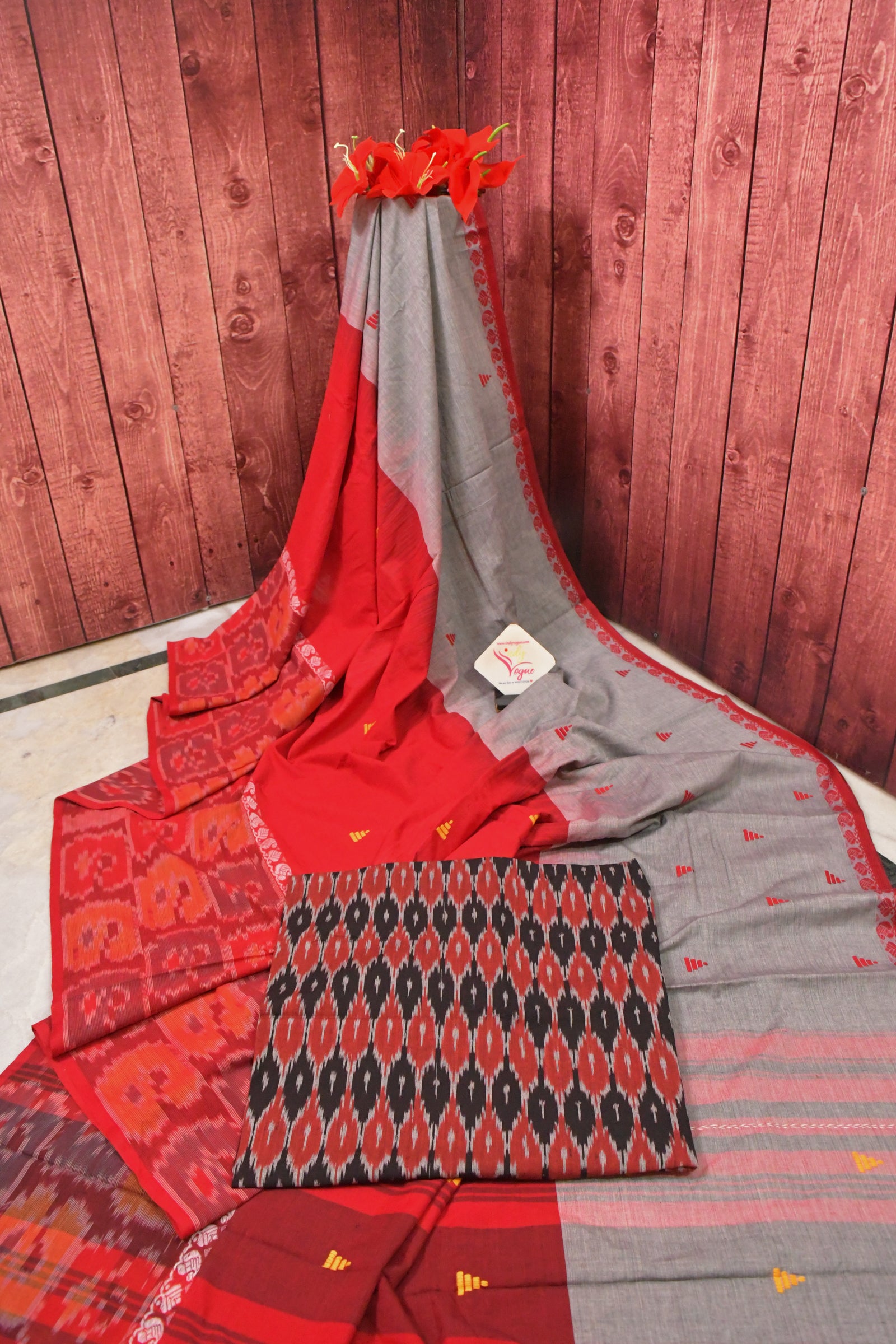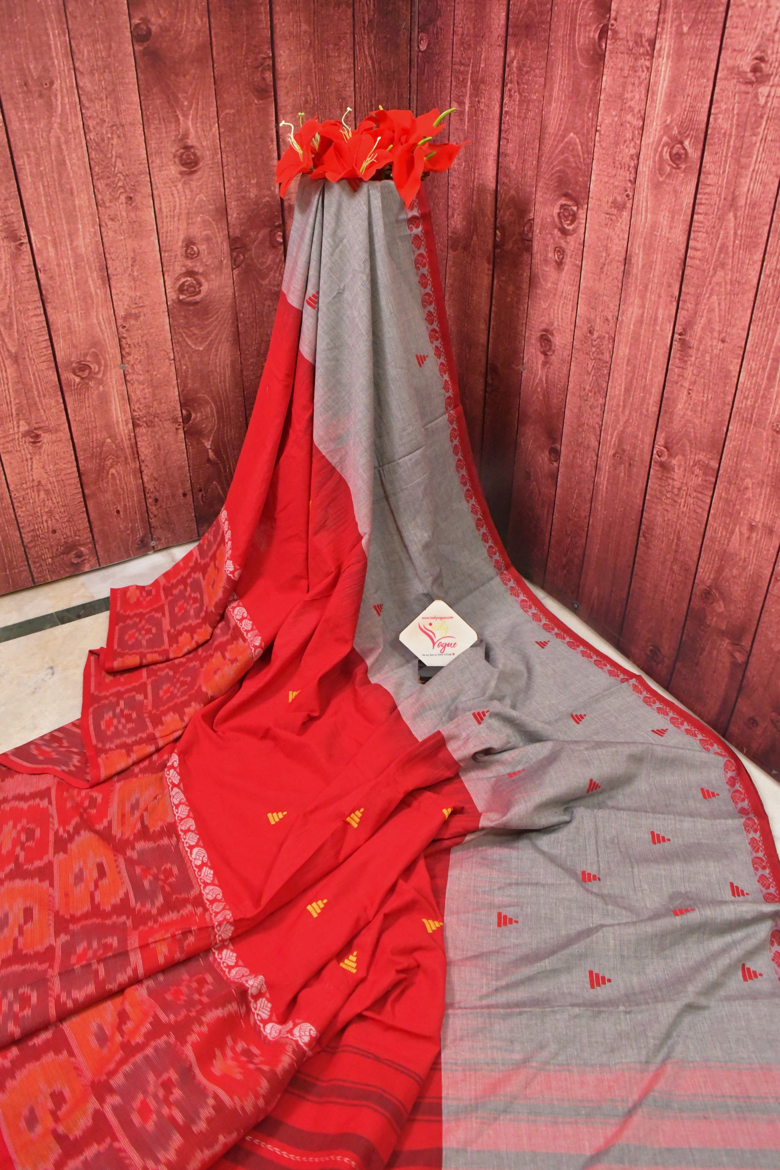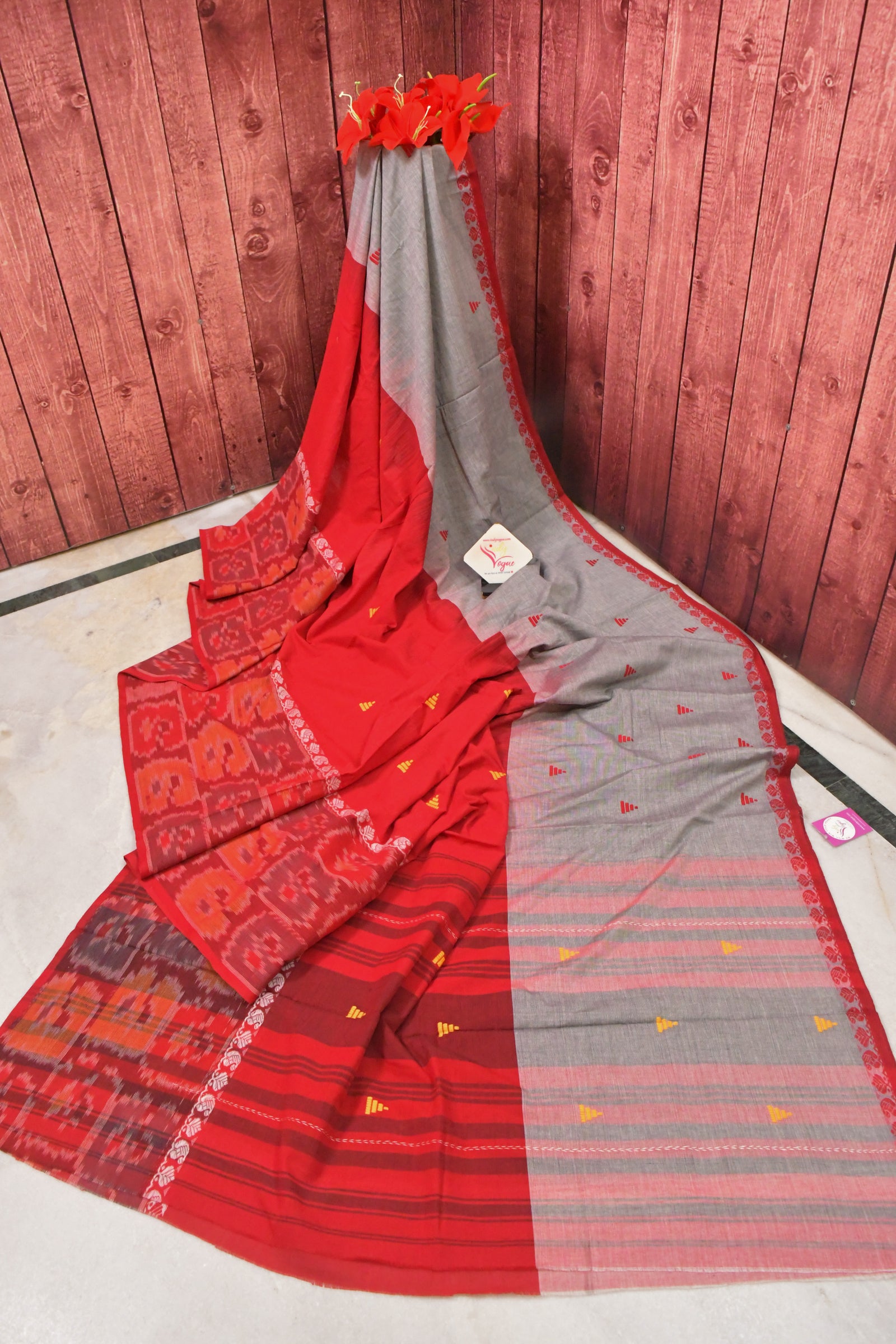 Grey and Red Color Dhaniakhali Tant Pure Bengal Cotton Saree with Ikat Skirt Border