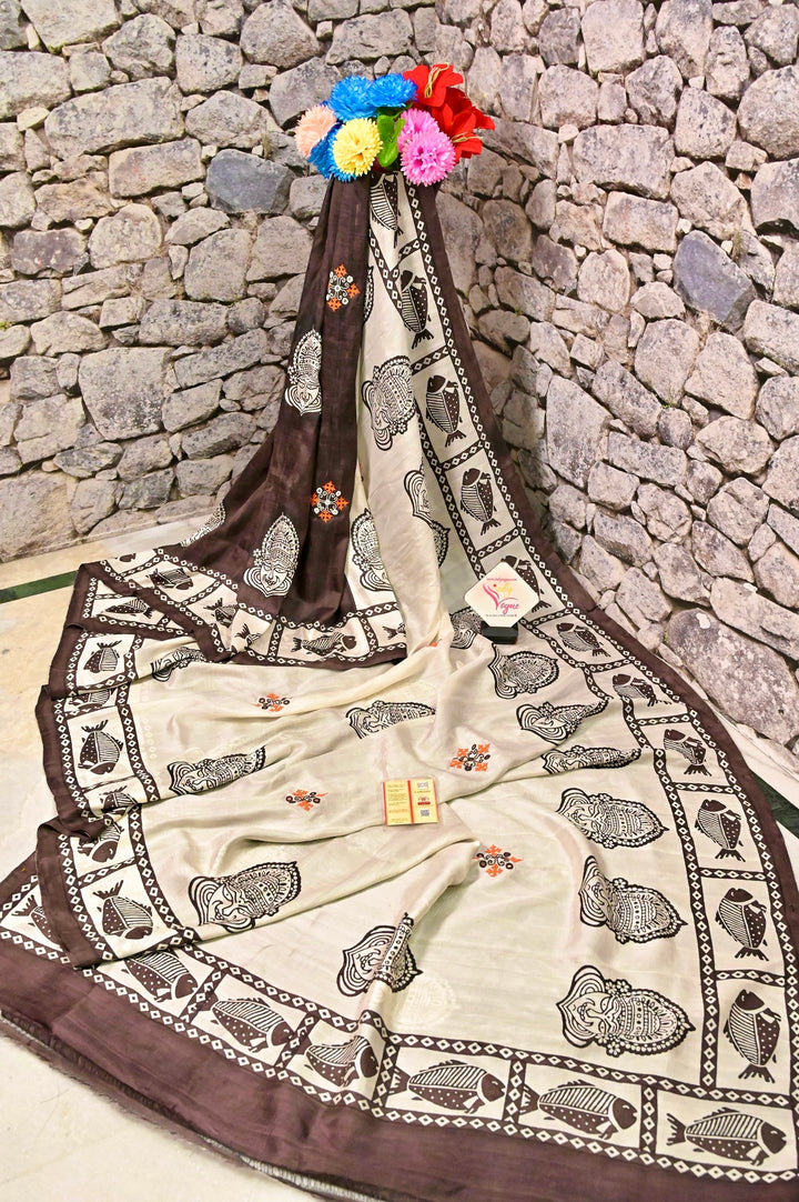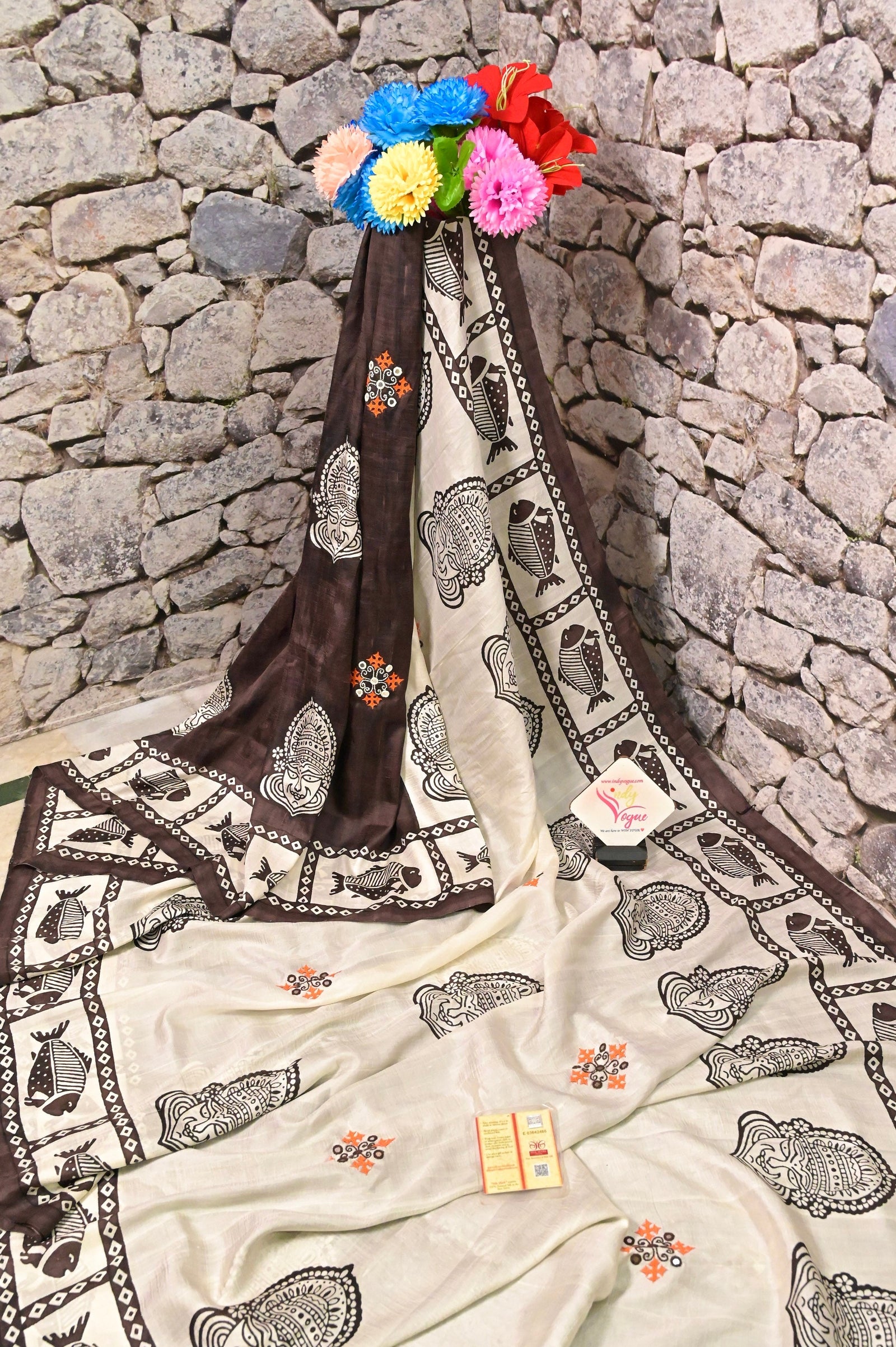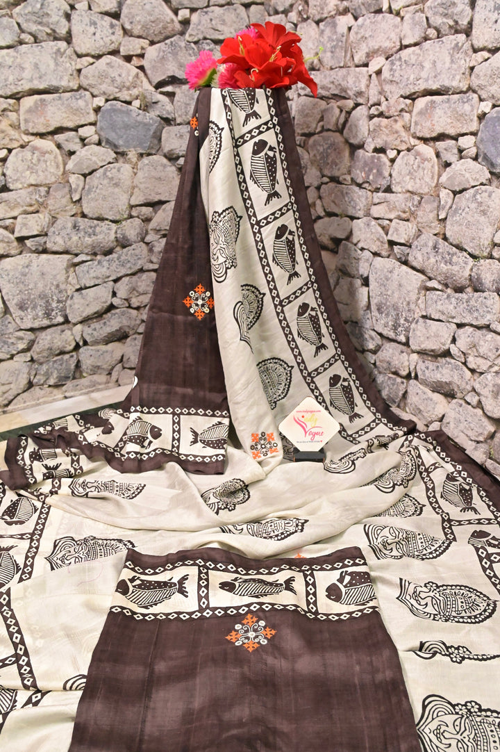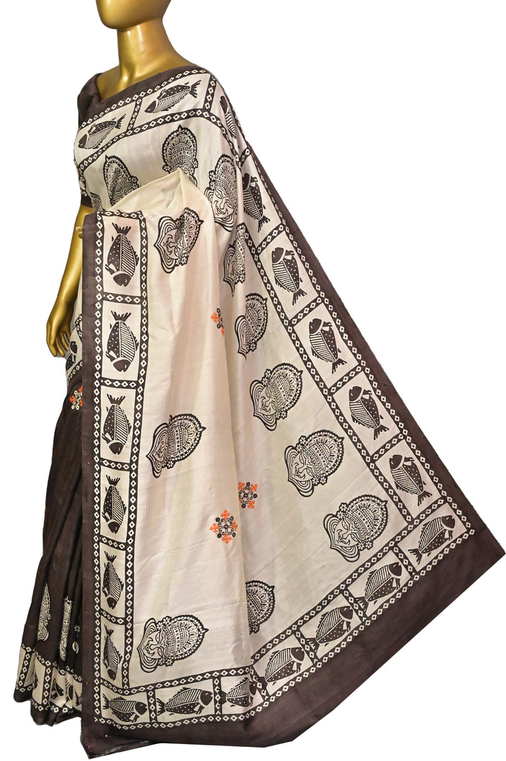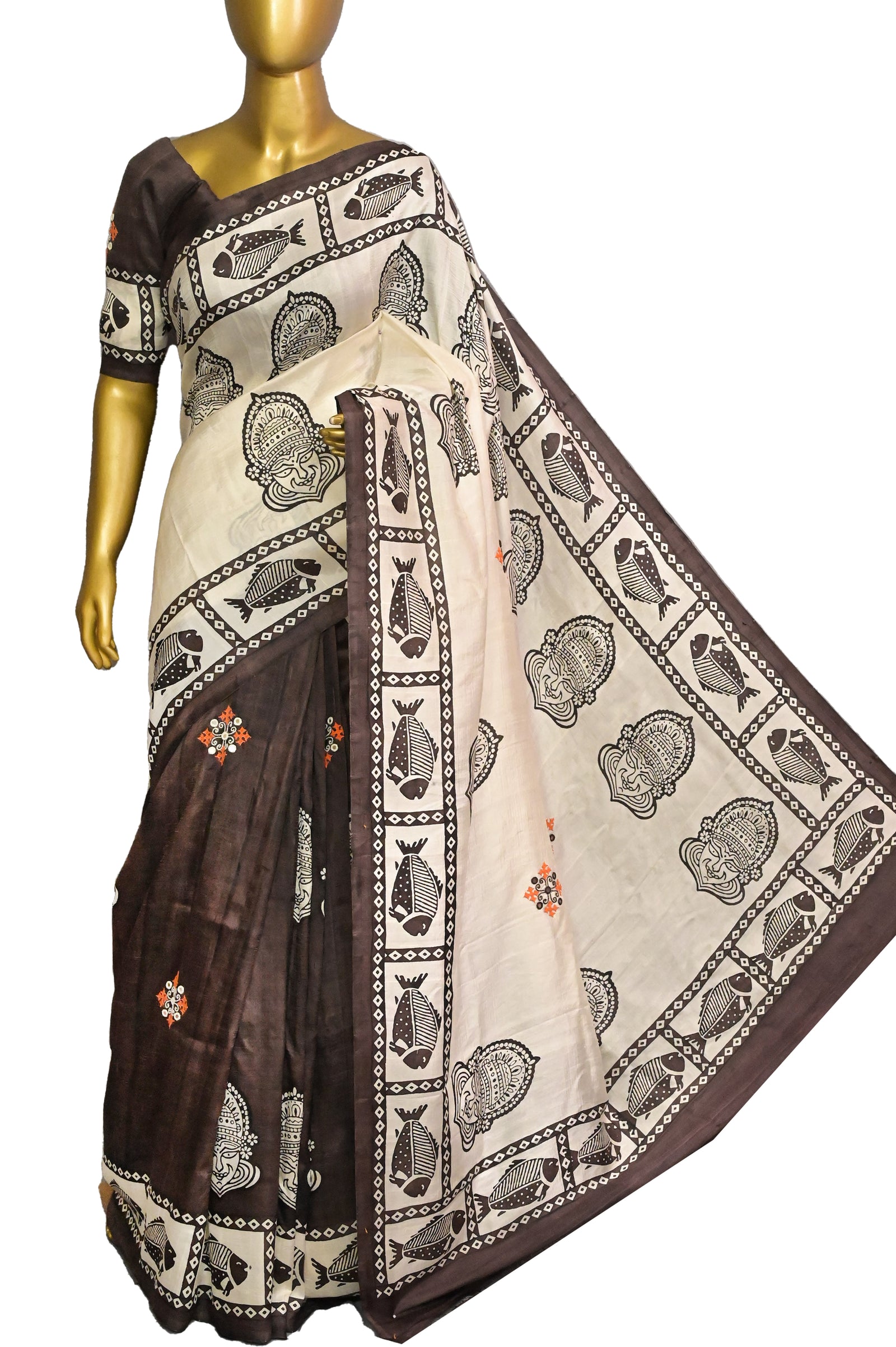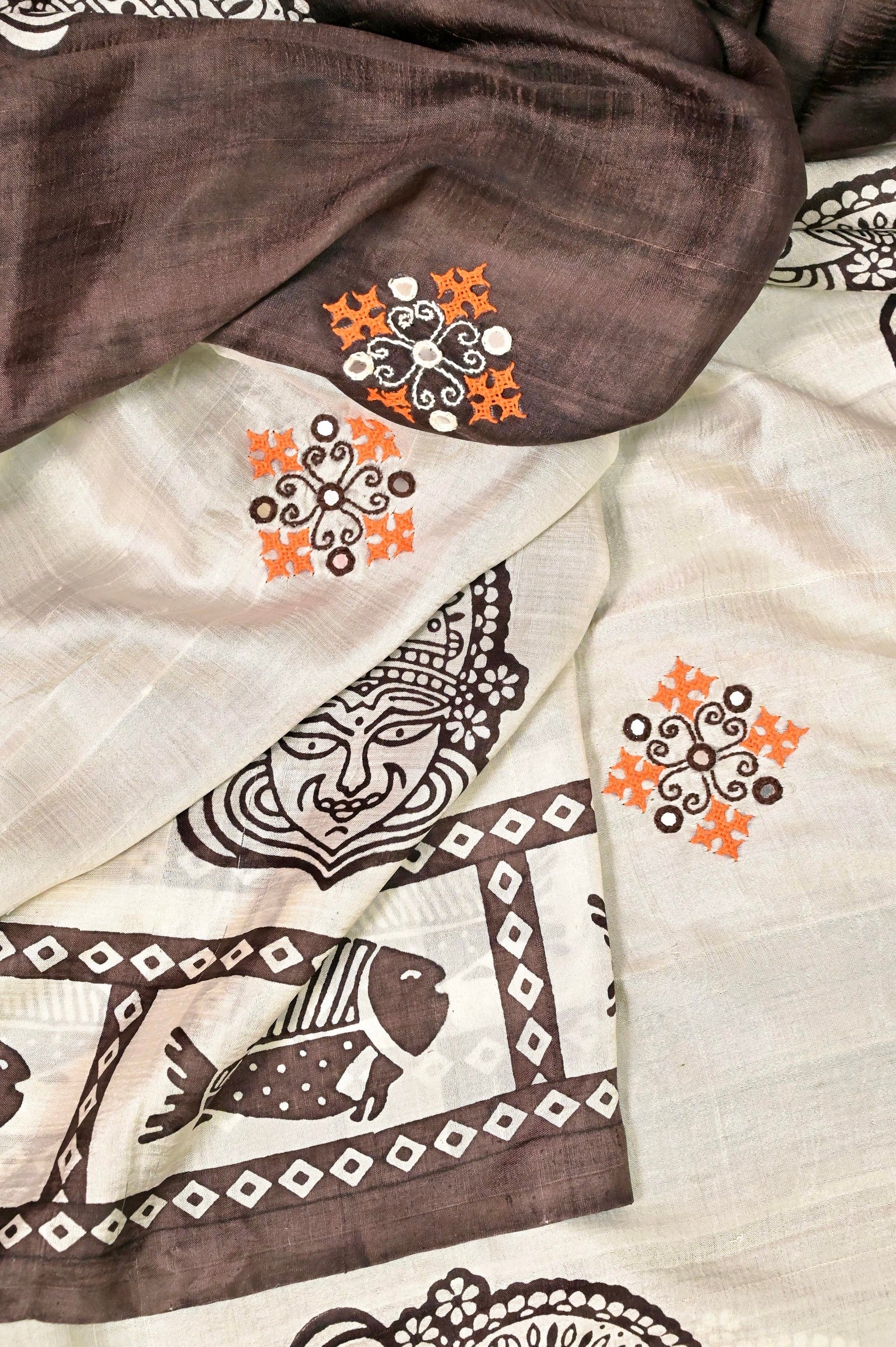 Half and Half Style Bishnupuri Silk Saree in Offwhite and Brown Color with Block Print and Hand Embroidery Work