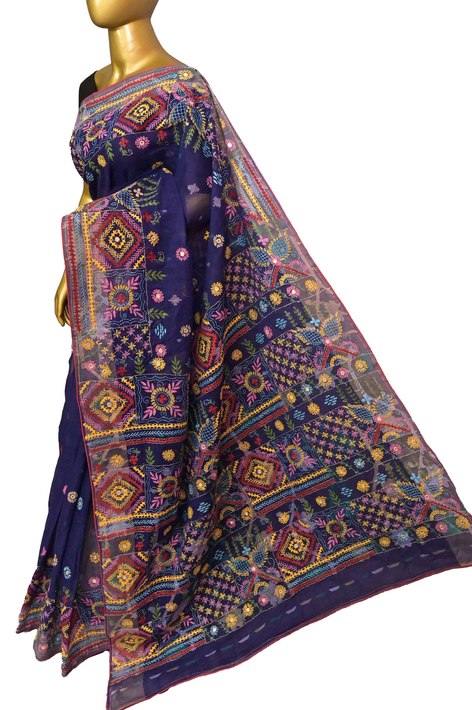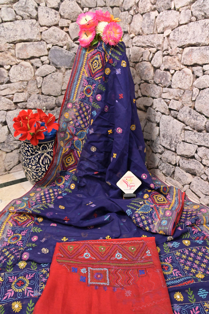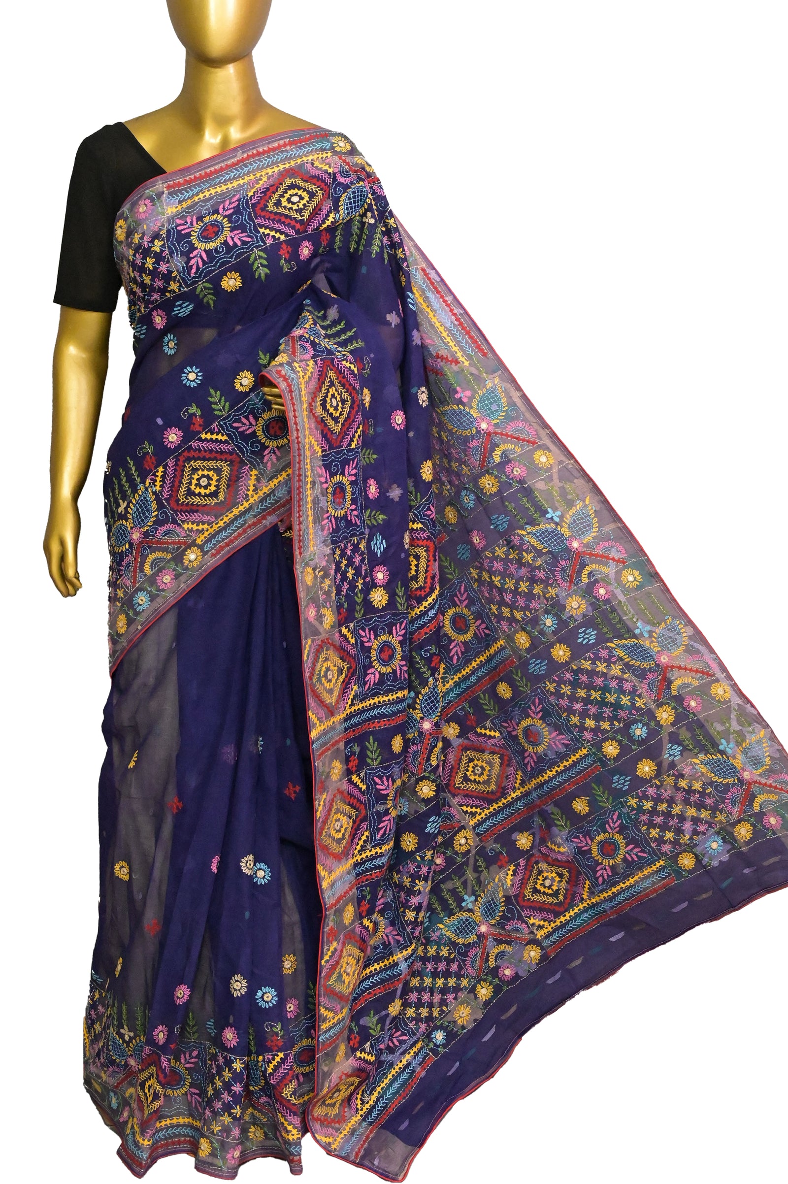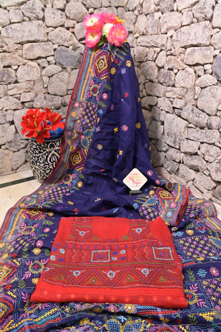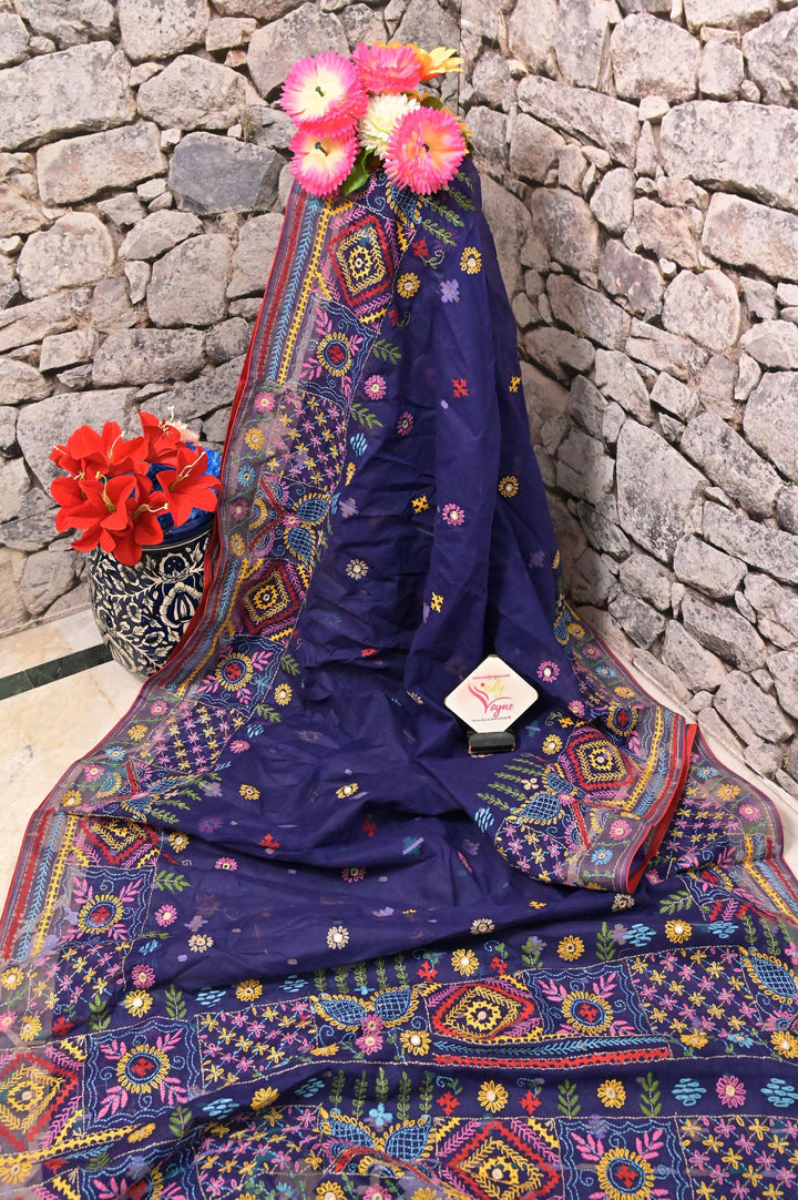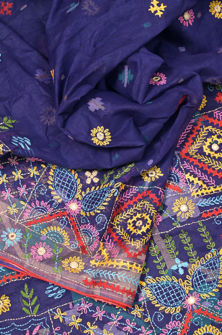 Handloom Cotton Jamdani Saree in Deep Navy Blue Color with Hand Lambani Embroidery and Piping Work