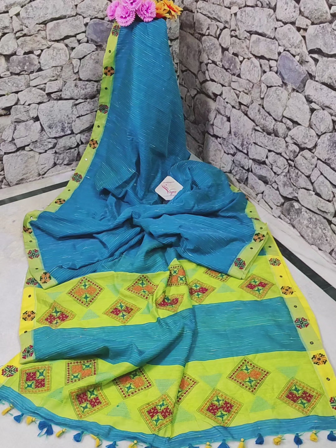 Handloom Saree in Rama Blue and Green Color with Allover Ghicha Weaving and Gujarati Mirror Work with Kantha Stitch