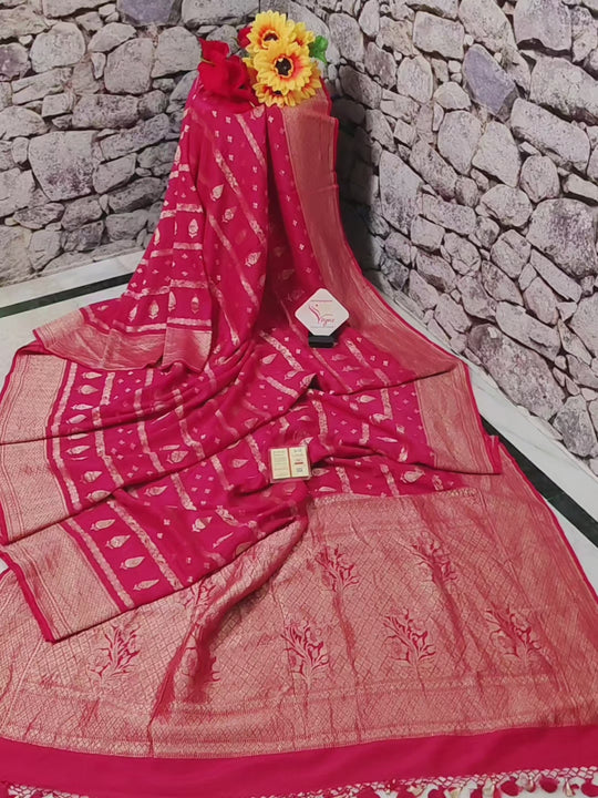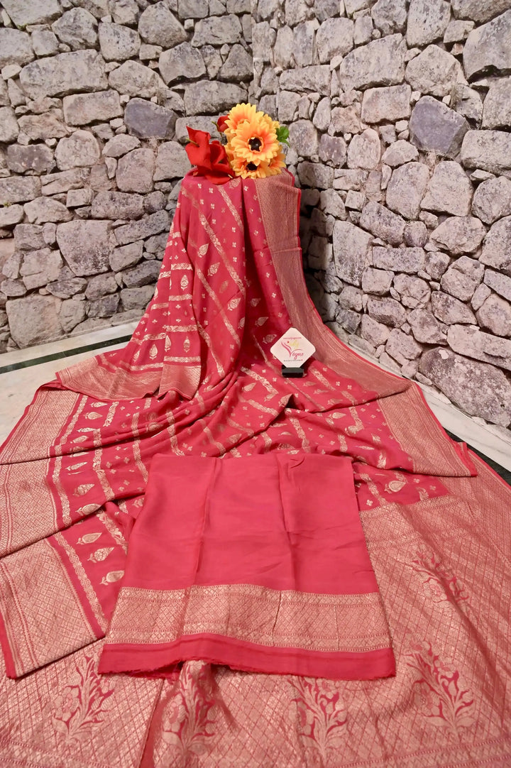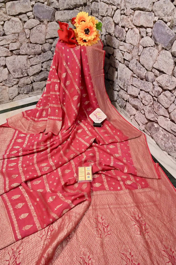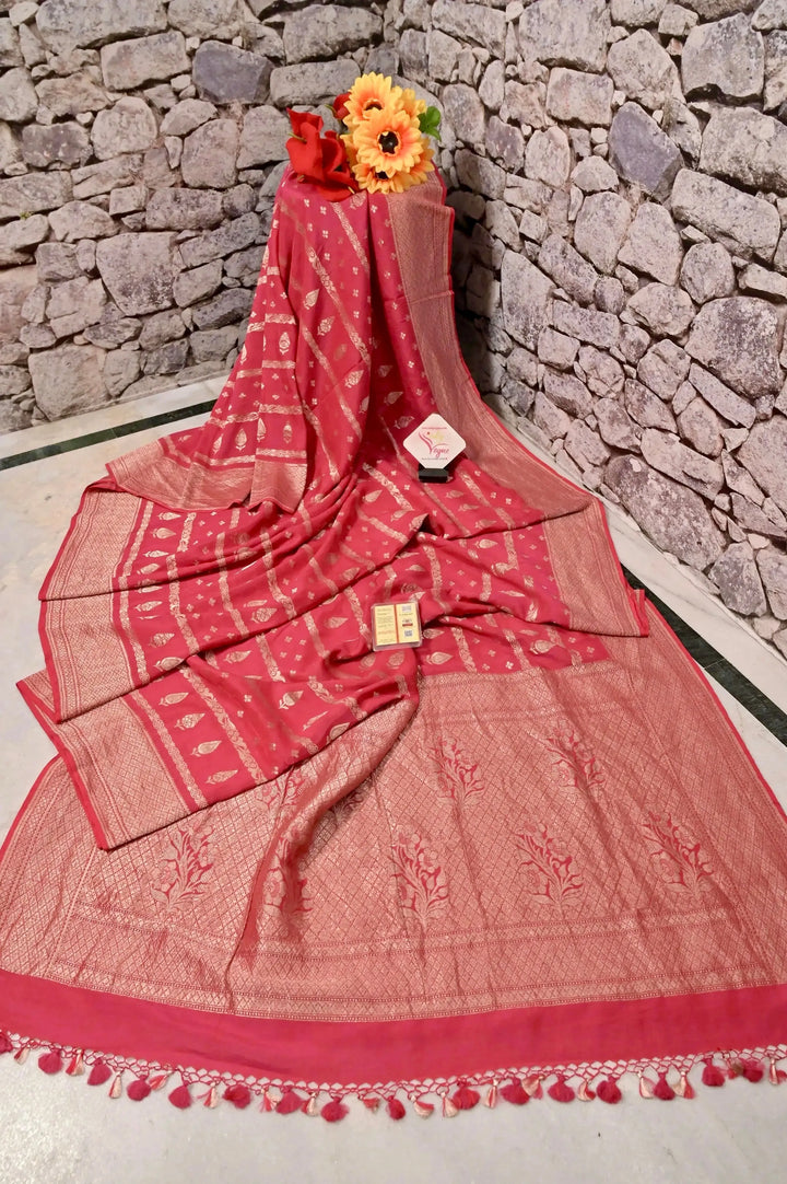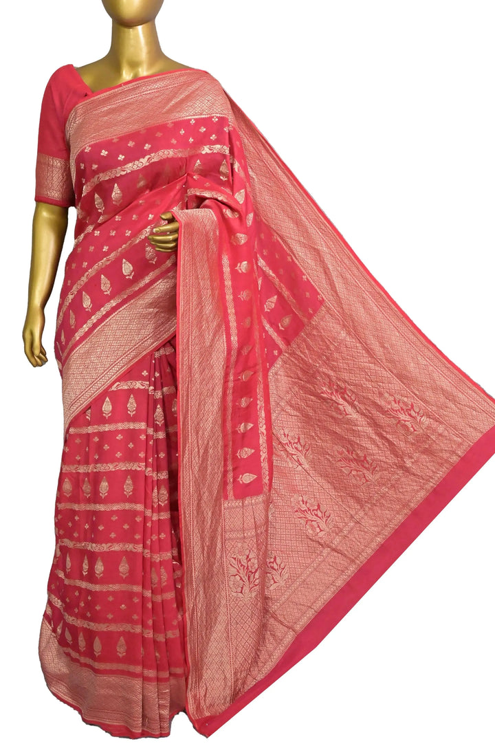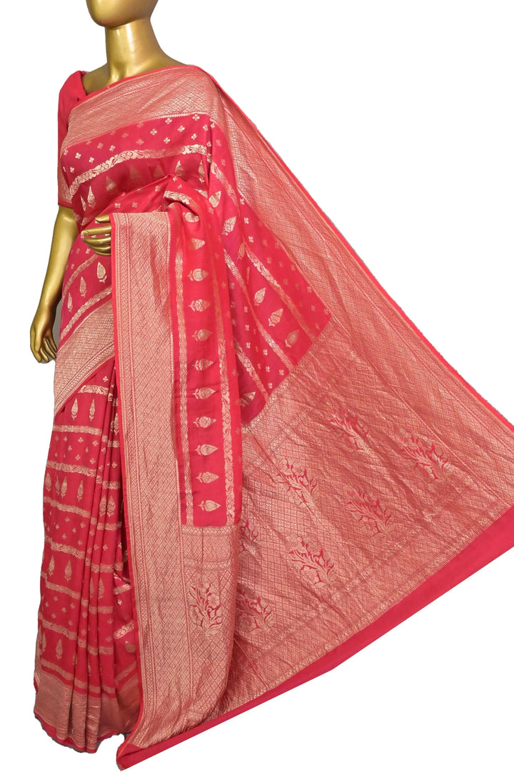 Hibiscus Red Color Pure Chiffon Muga Banarasi with Allover Zari Weaving