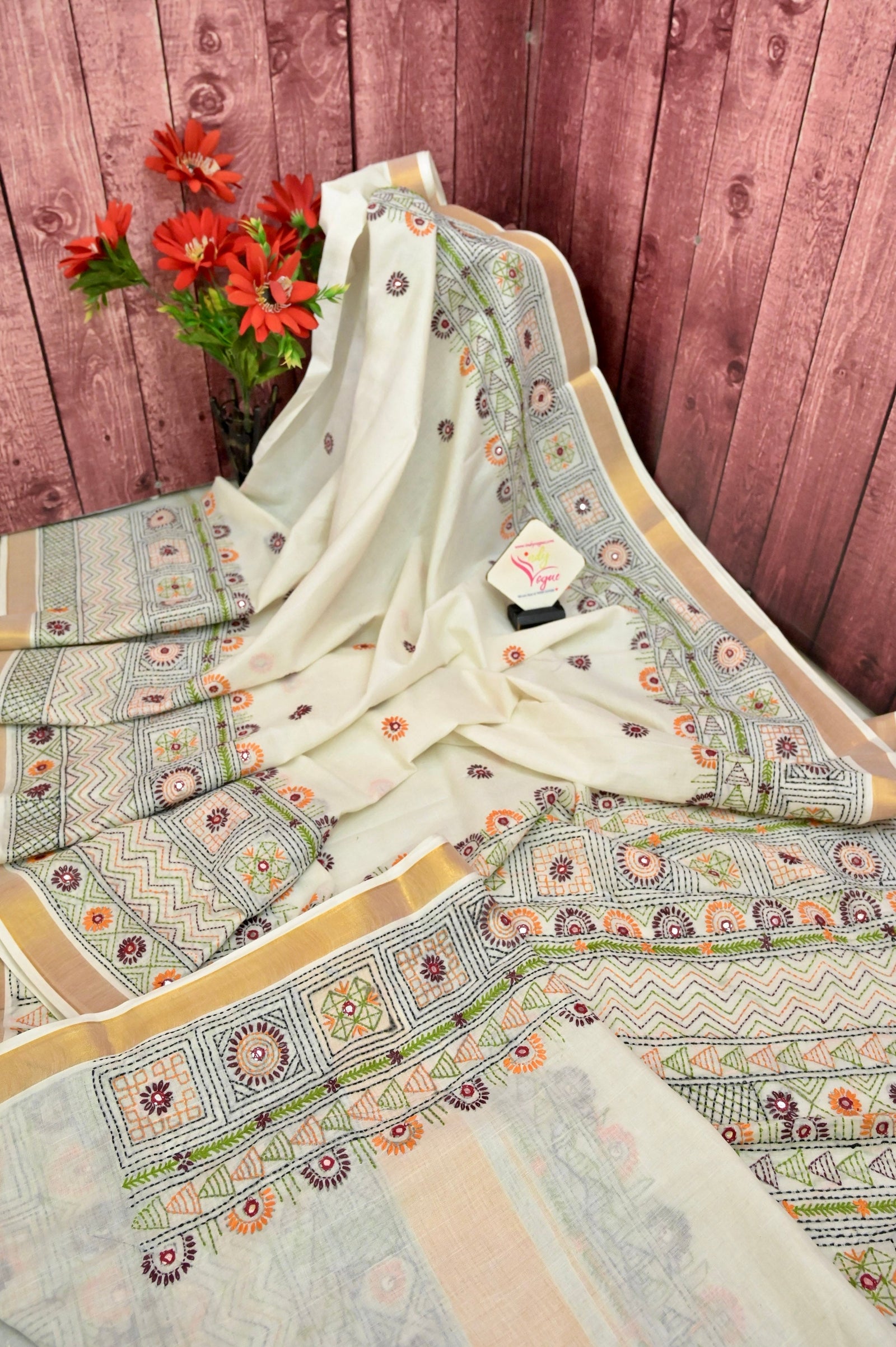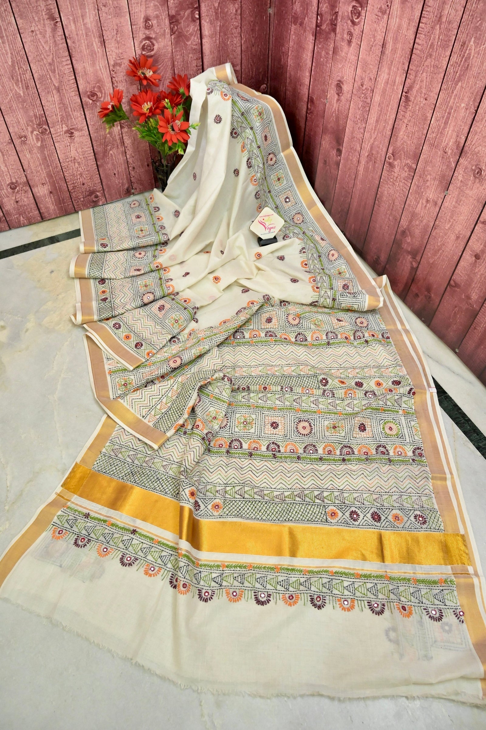 Bring home an enriching variety of pure cotton handloom sarees like this Kerala Cotton with a piping zari border with amazing hand lambani embroidery on the body and the pallu makes the saree a contemplating one. The saree has a piping border all over to give it a firm look.