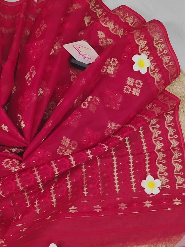 Jamdani Saree in Apple Red Color with Allover Self Jamdani Weaving in Red and Golden with Pre Stitched Blouse