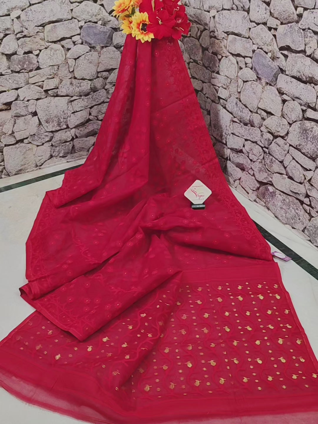 Make a statement with this lively Dark Red Jamdani Saree that mirrors your spirited energy! Expertly handwoven, it showcases intricate self-weaving Jamdani designs across the body, pallu, and border, turning every detail into art.