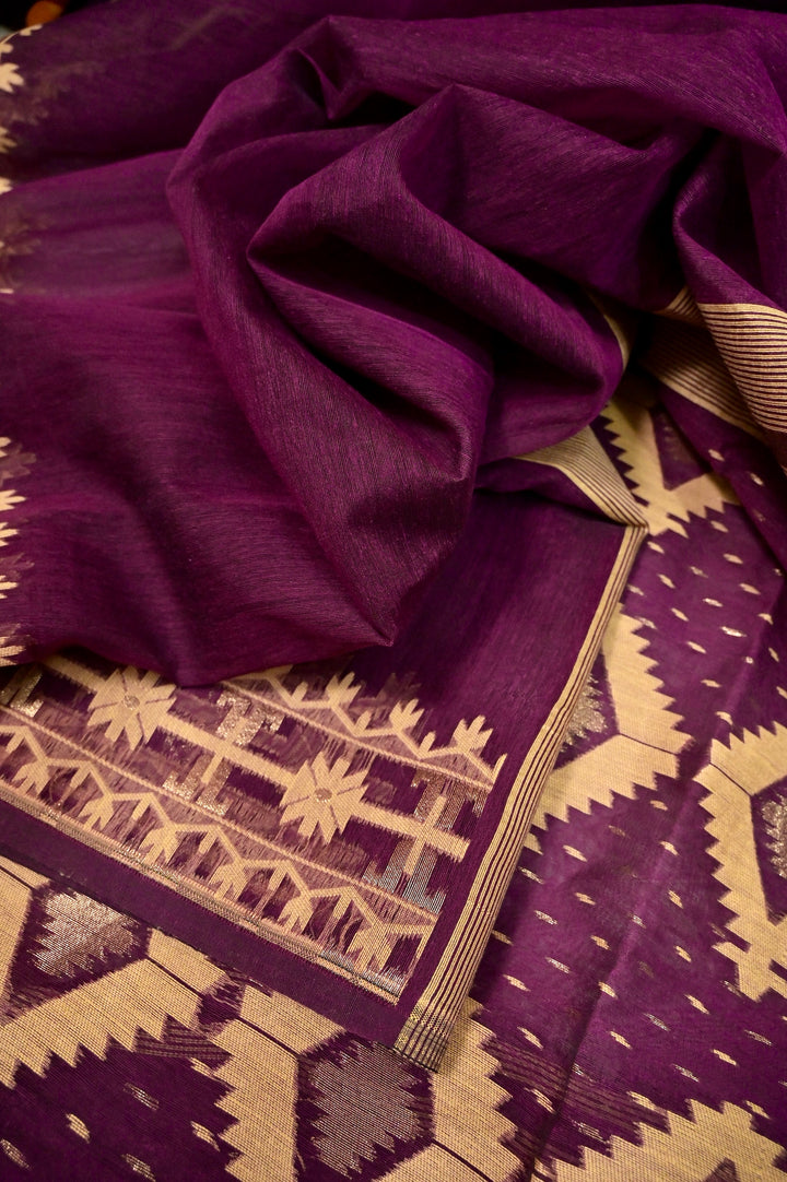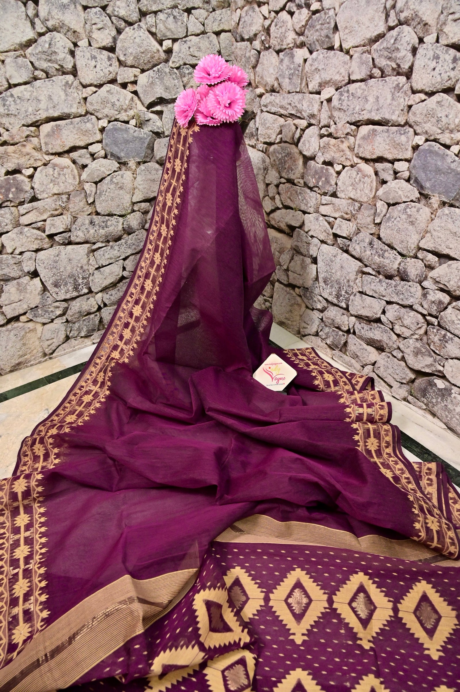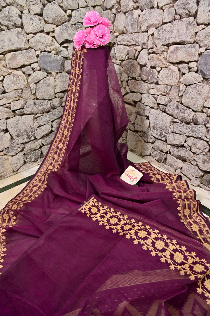 Jamdani Saree in Dark Wine Color with Jamdani Weaving Pallu and Border