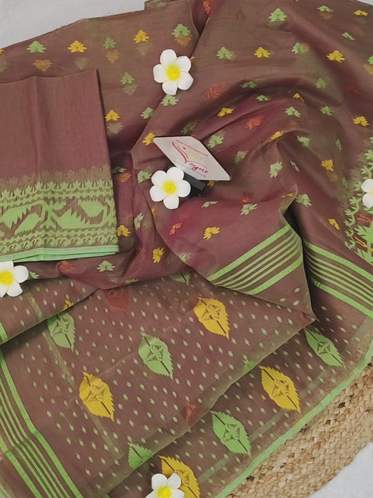 Discover the magic of traditional craftsmanship meets modern flair in this captivating Jamdani Saree. Vibrant green and magenta dual-tones intertwine through delicate, all-over jamdani weaving, creating a mesmerizing visual feast.