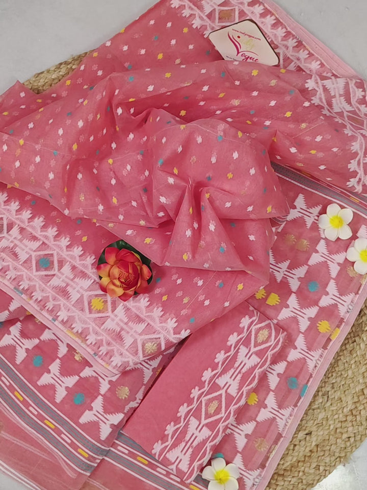 Jamdani Saree in Peach Color with Allover Jamdani Weaving in Multicolored Buti Work with Pre Stitched Blouse