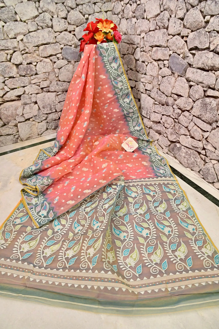 - Allover Jamdani's work covers the entire saree and comes with a contrasting color, self Jamdani weaving