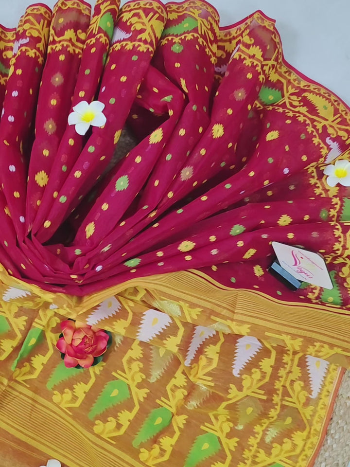 Discover the magic of traditional artistry reimagined in this captivating Jamdani Saree, where red and yellow hues dual tone shade in perfect harmony.