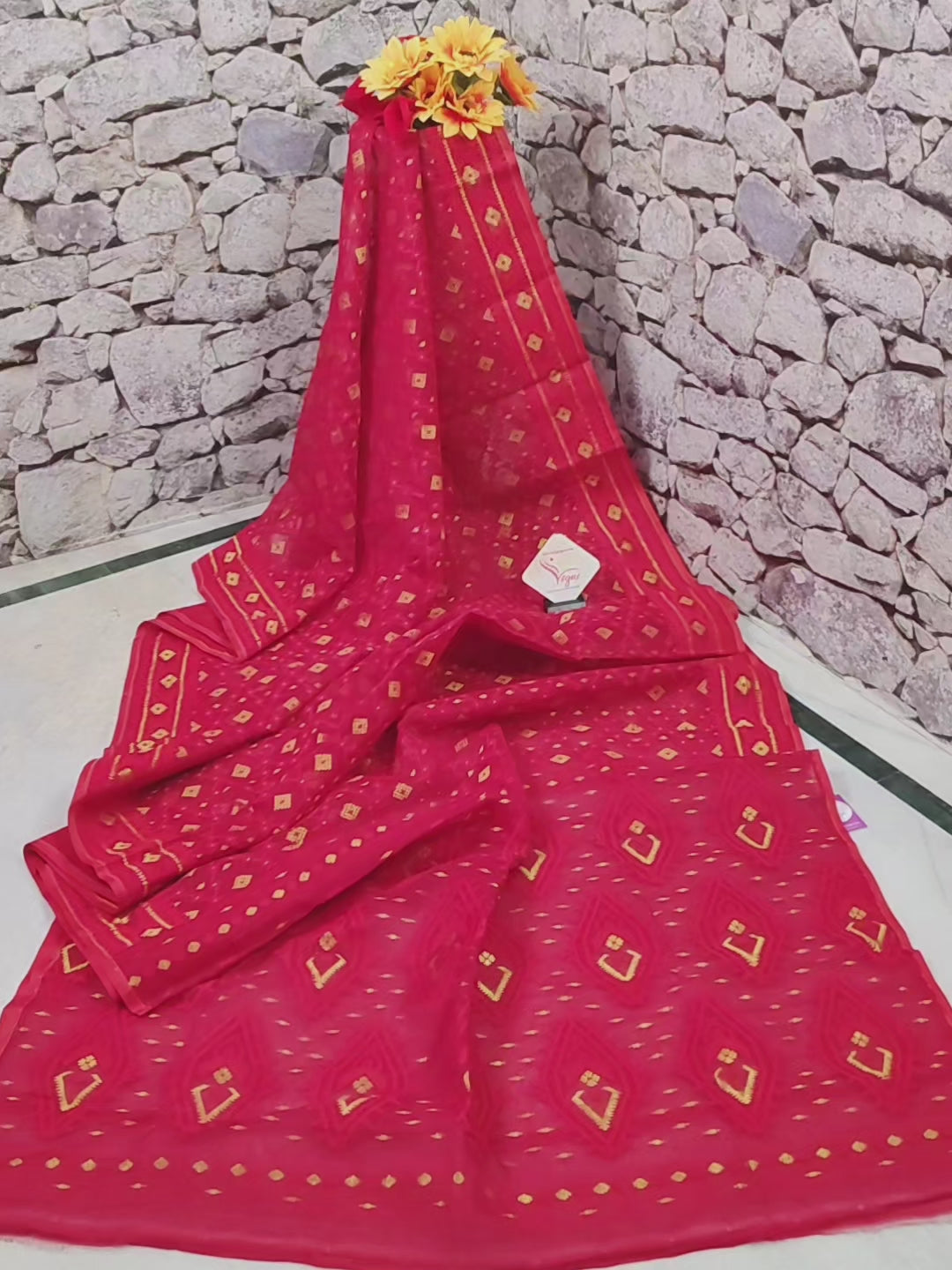 Make a dazzling statement in this Crimson Red Jamdani Saree that matches your vibrant energy! Lovingly handwoven, it showcases intricate Jamdani weaving across the body, pallu, and border, creating a wearable masterpiece.