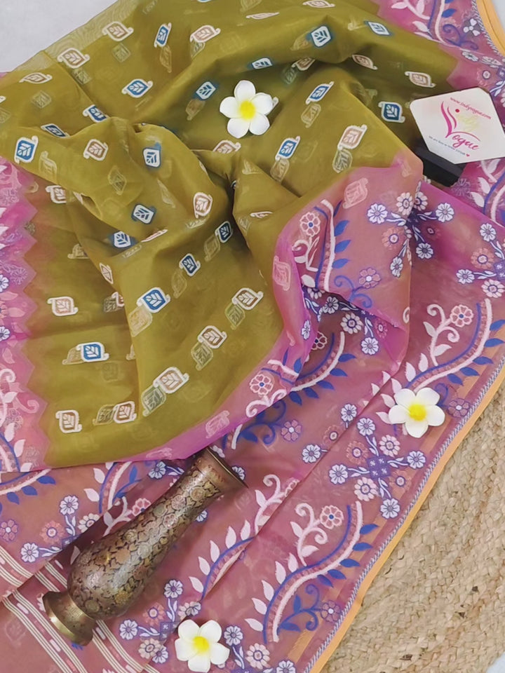 Jamdani Saree in Sap Green Color with Allover Meenakari Buti and Pre Stitched Designer Blouse