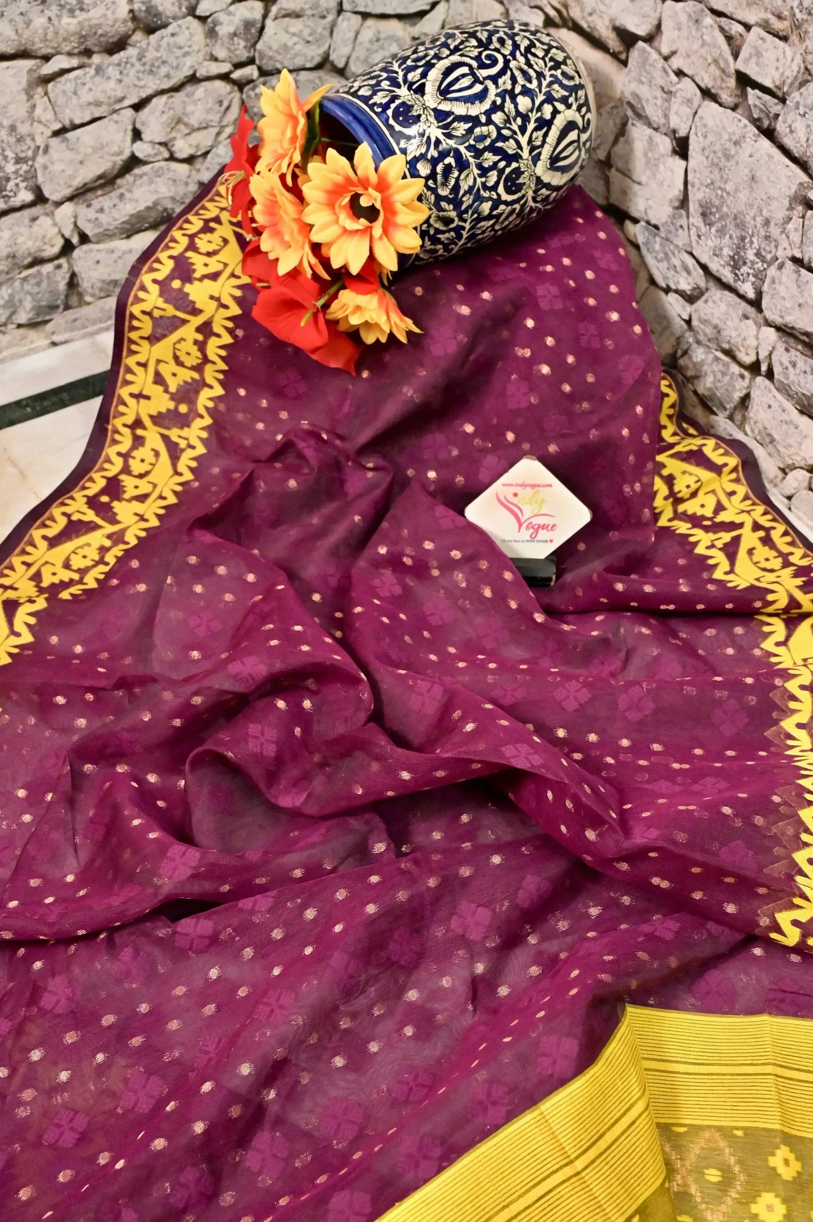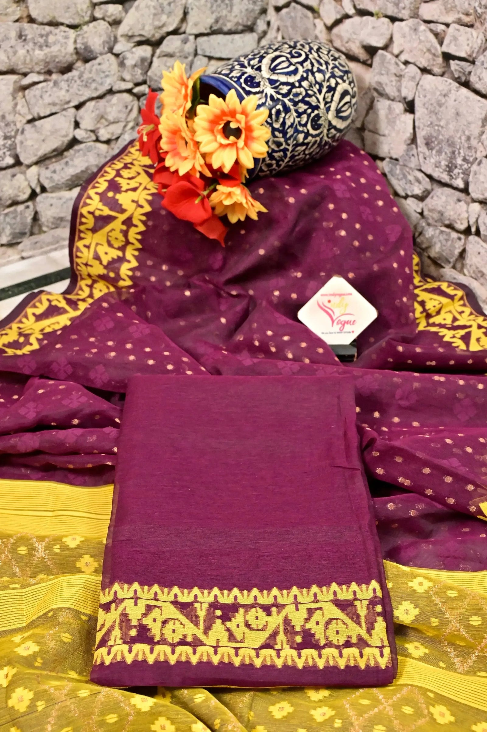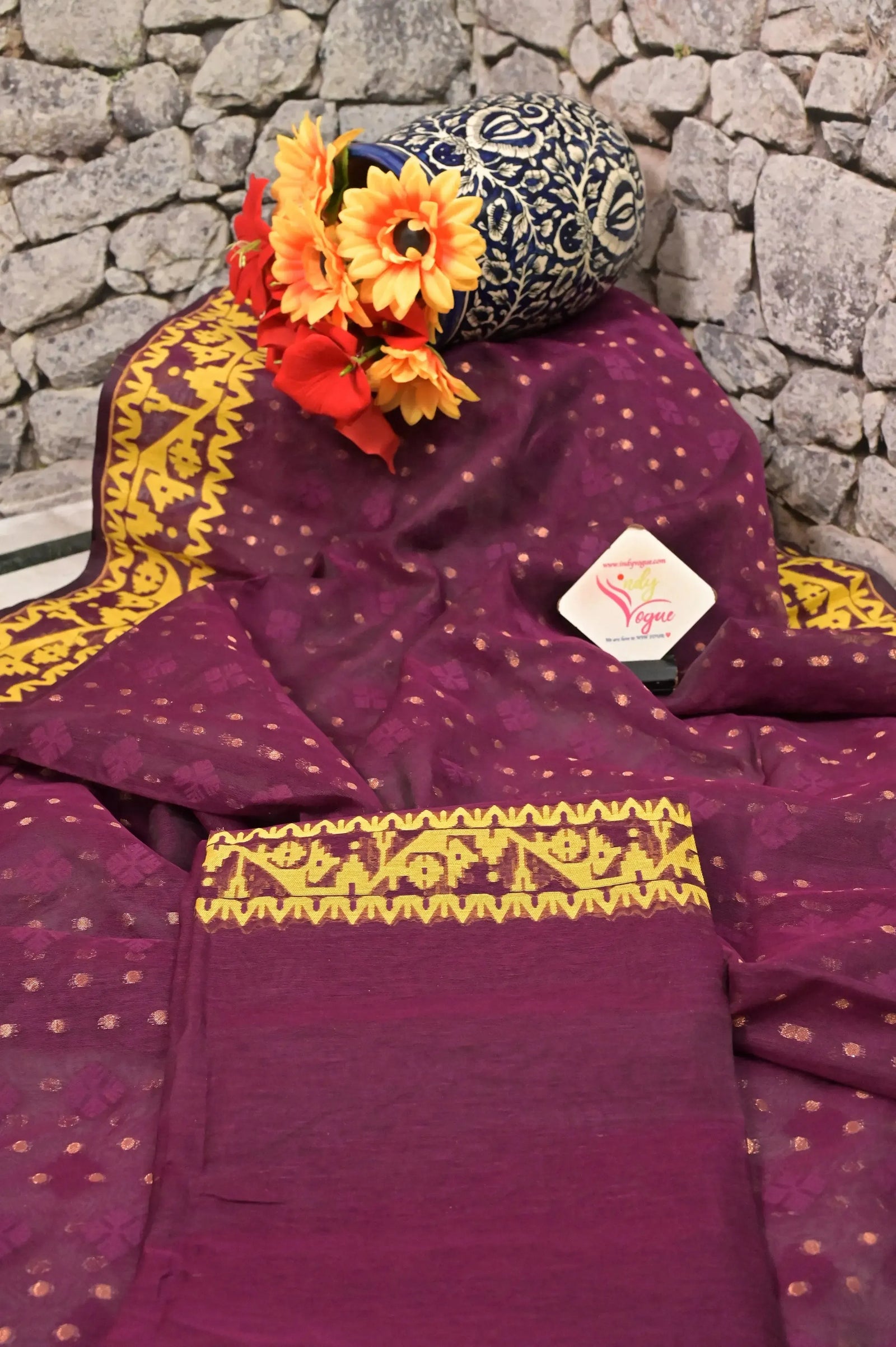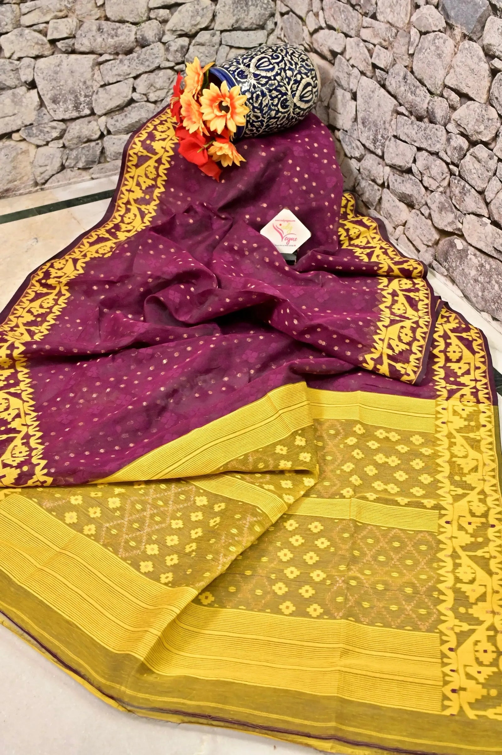 Jamdani Saree in Wine Color with Jamdani Weaving Work in Yellow Color