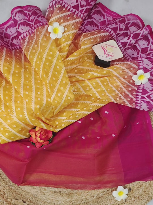 Discover the magic of traditional craftsmanship in this radiant Jamdani Saree, where yellow and magenta hues blend beautifully with intricate weaving techniques.