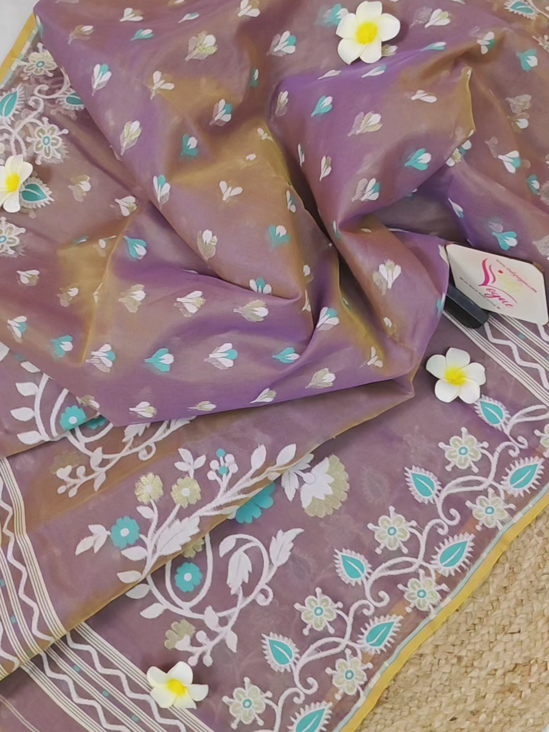 Make a statement with this lively Yellow and Purple Dual-Tone Jamdani Saree that mirrors your spirited energy! Expertly handwoven, it showcases intricate self-weaving Jamdani designs across the body, pallu, and border, turning every detail into art.