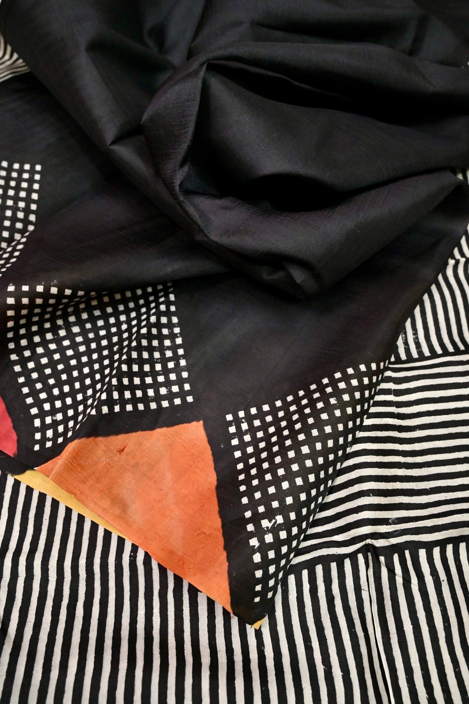 A jet black color beauty with a digital print design on the border, and body and the pallu with the geometirc motif pattern make this bishnupuri silk fascinating among all-age buyers. Try out this fusion collection only with us.