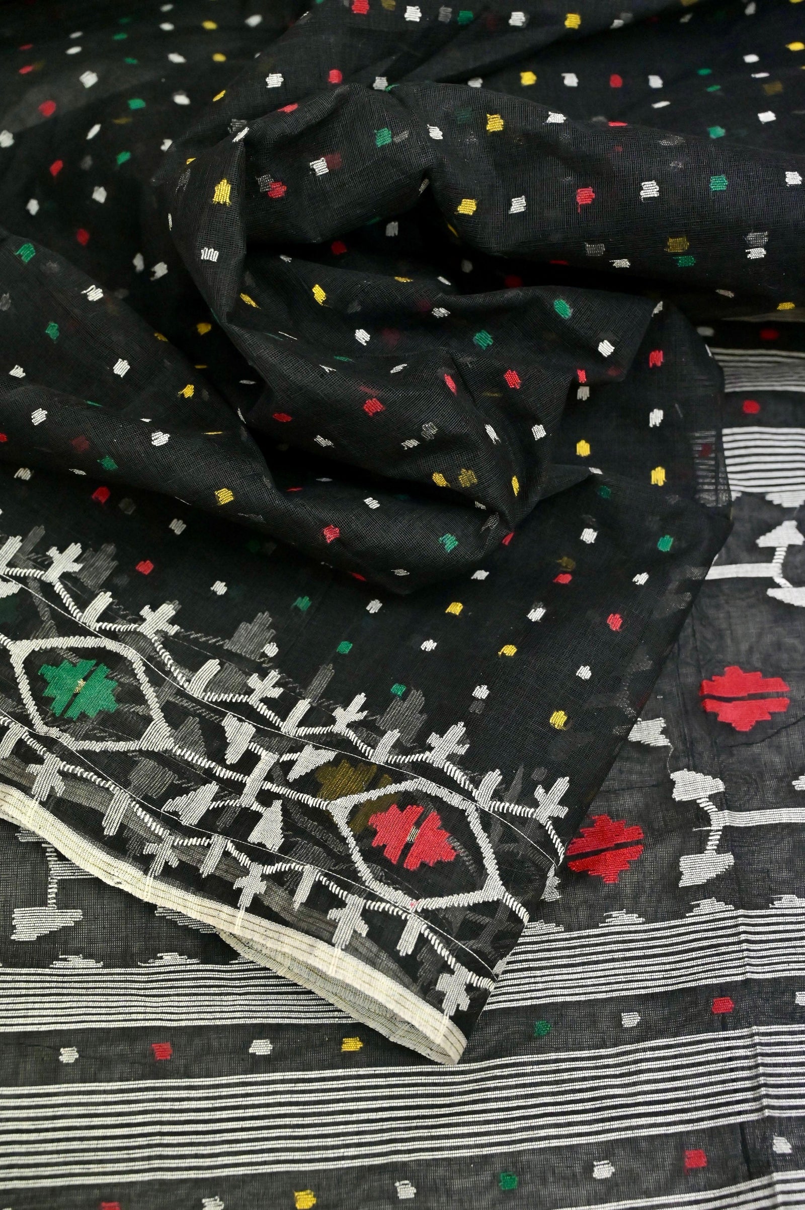 Choose the top weave of jamdani from our inventory. You can try this jet-black color of pure Bangladeshi dhakai jamdani with the retouch of the traditional self jamdani weaving in multiple color buti work on the pallu, body, and border to make this saree one of the classiest choices.