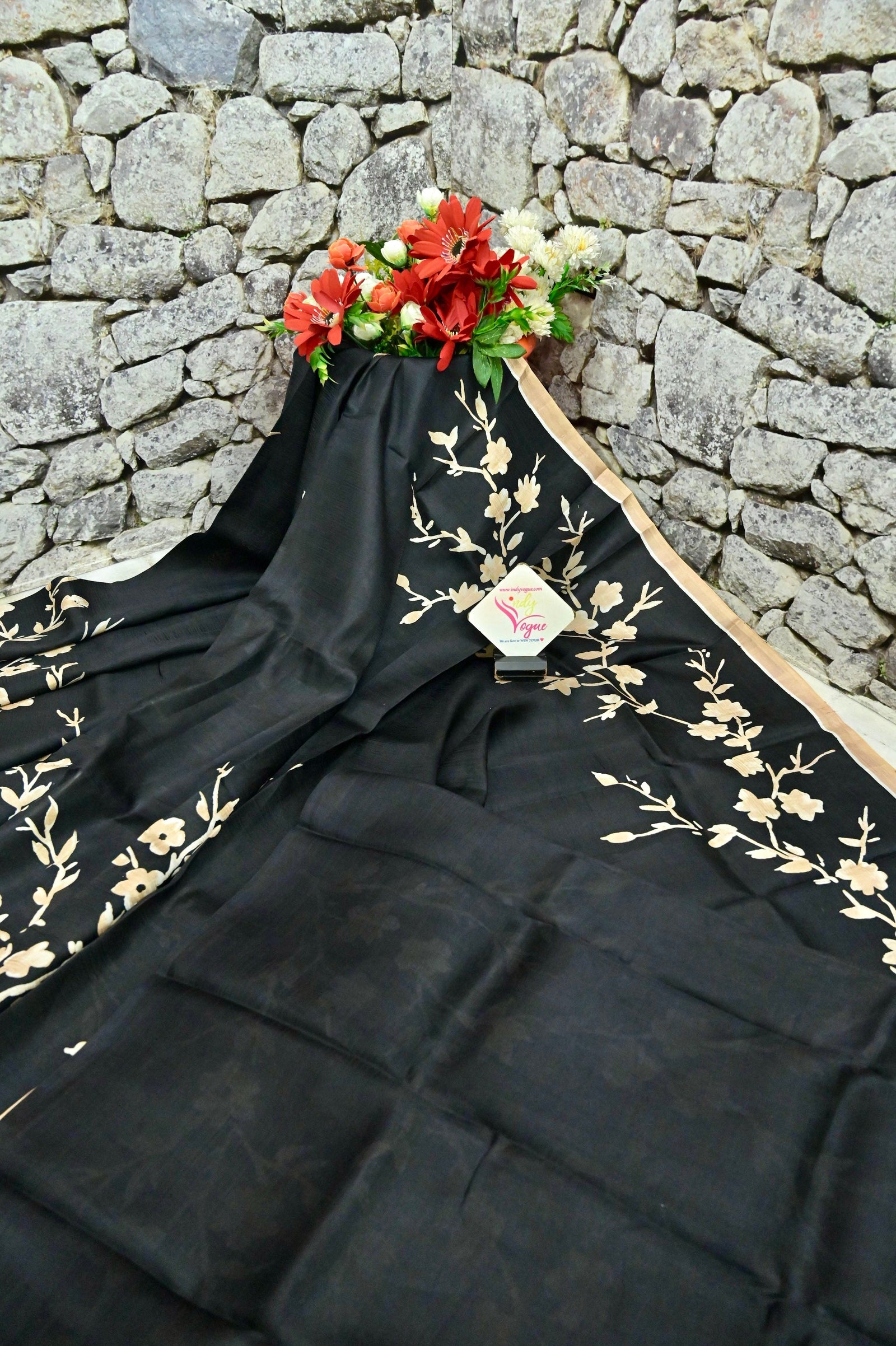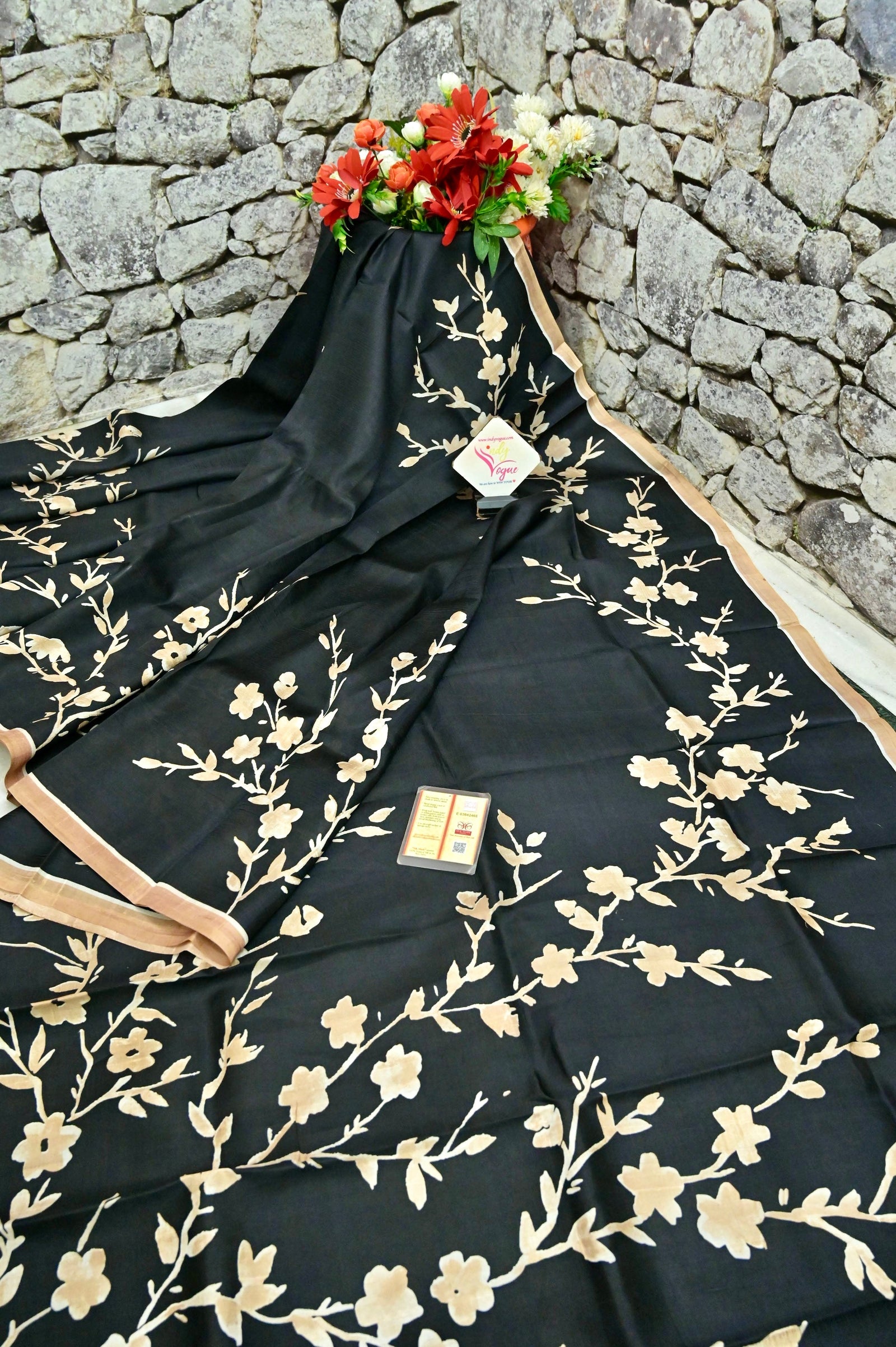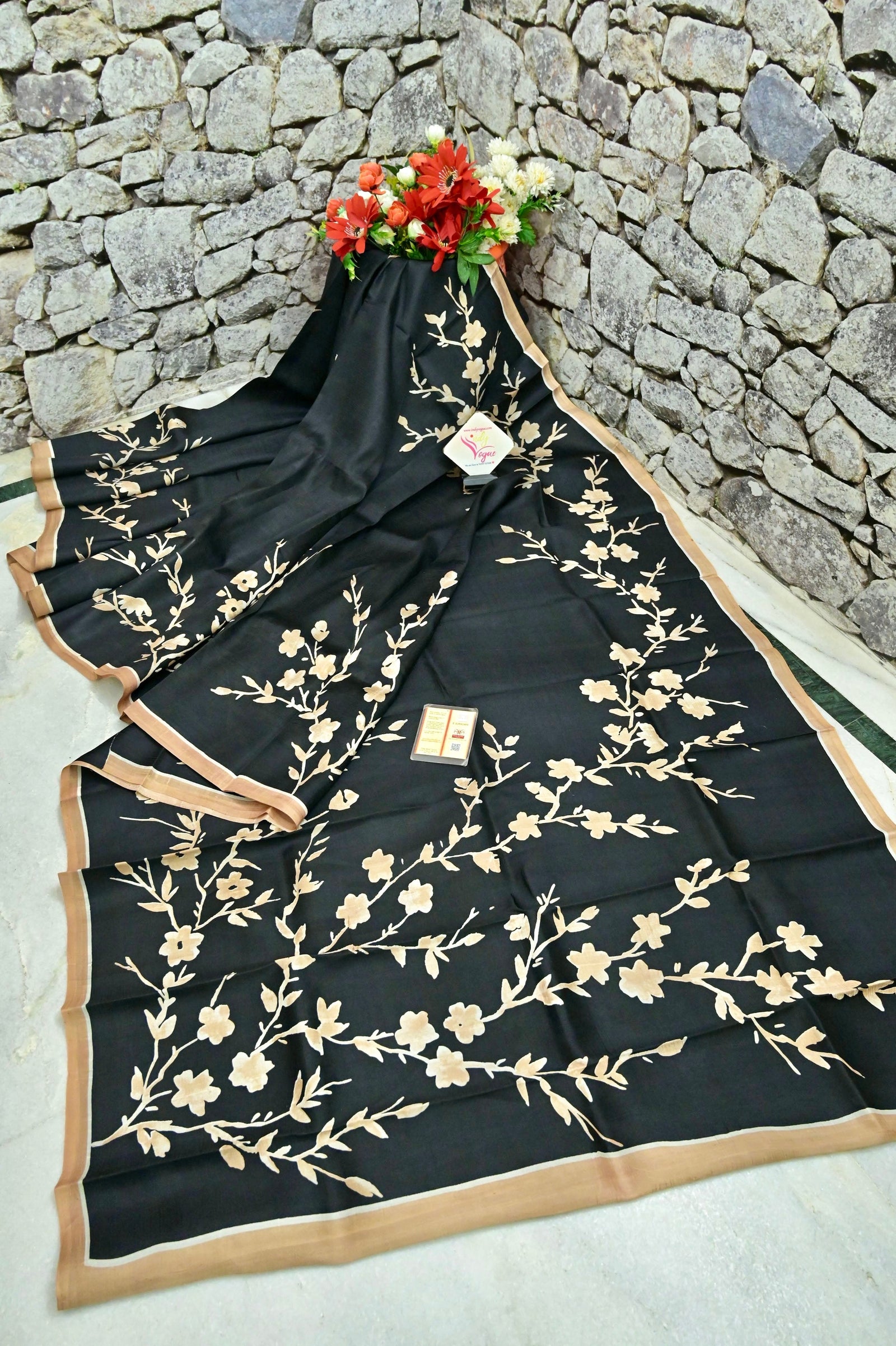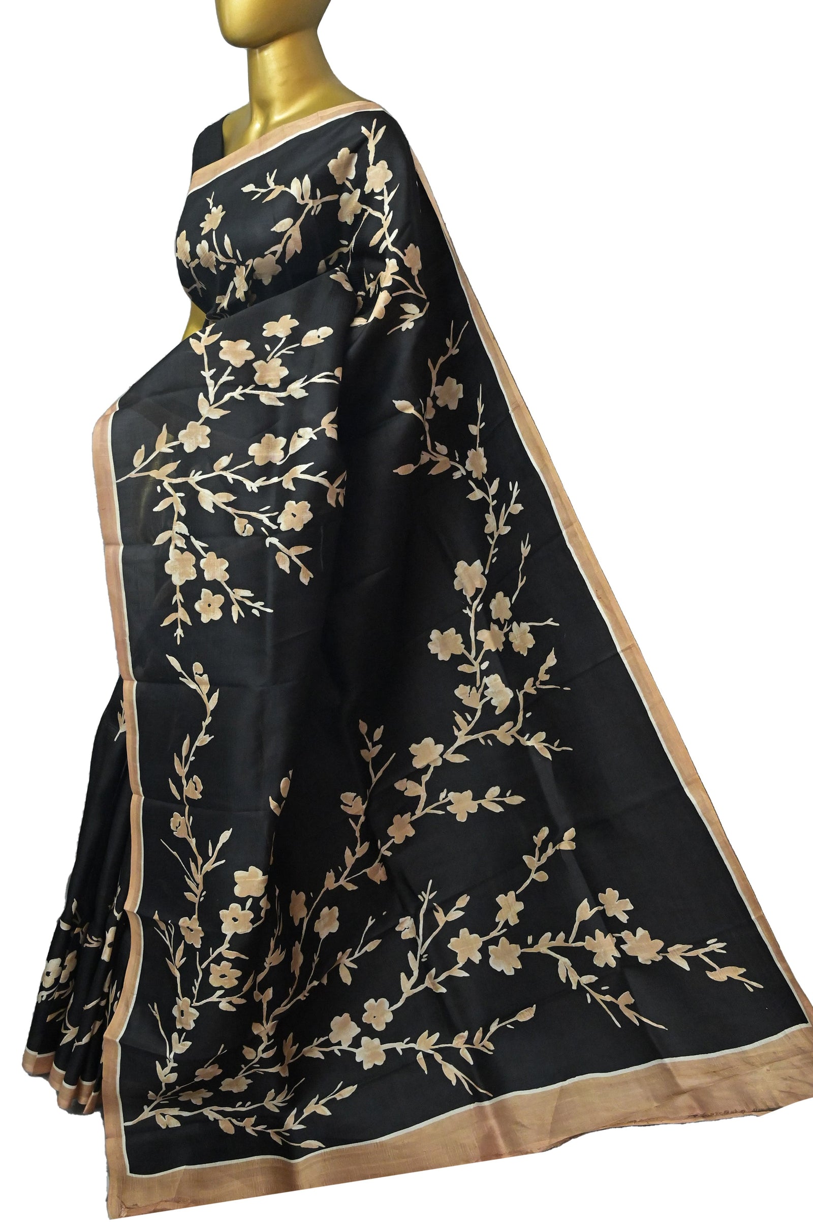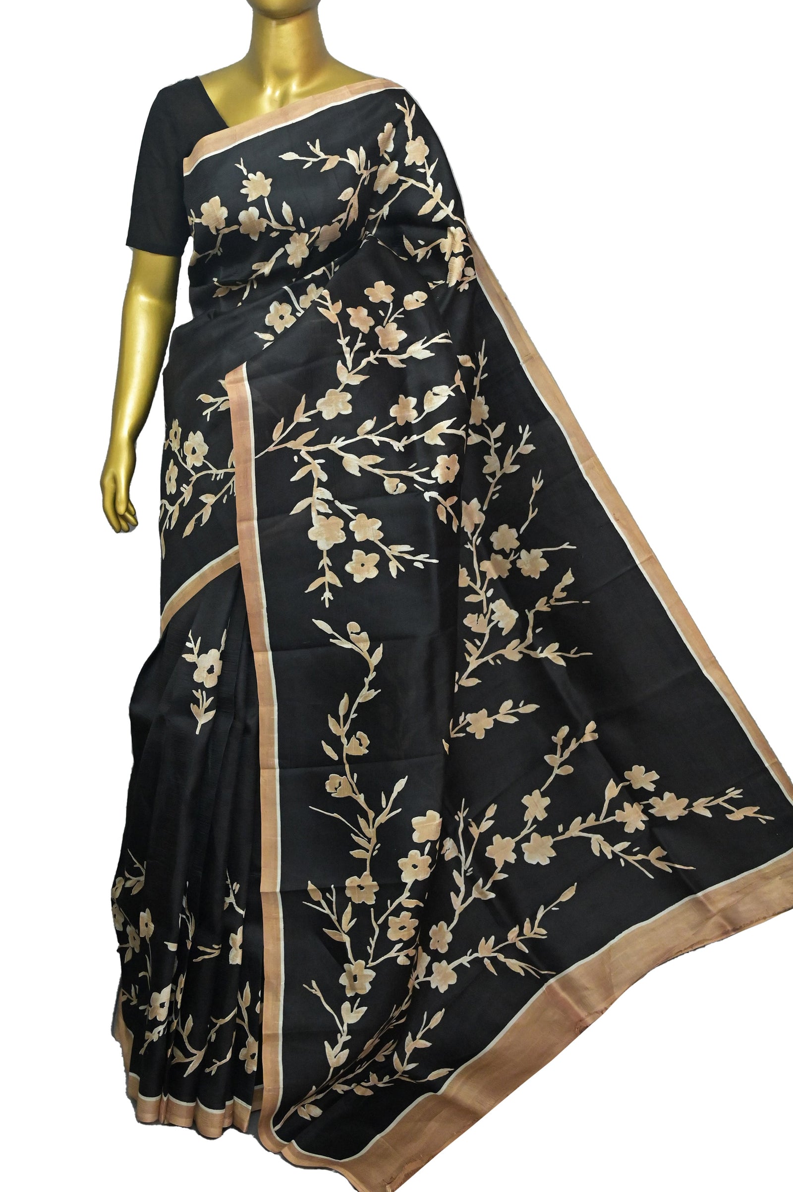 Jet Black Color Pure Bishnupur Silk Saree with Block Print Work