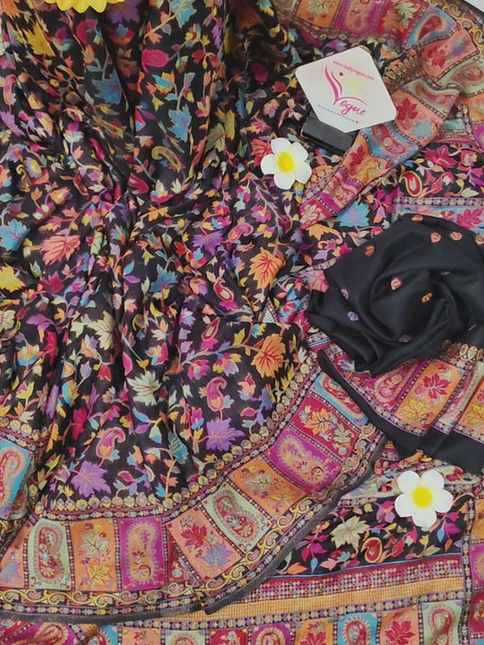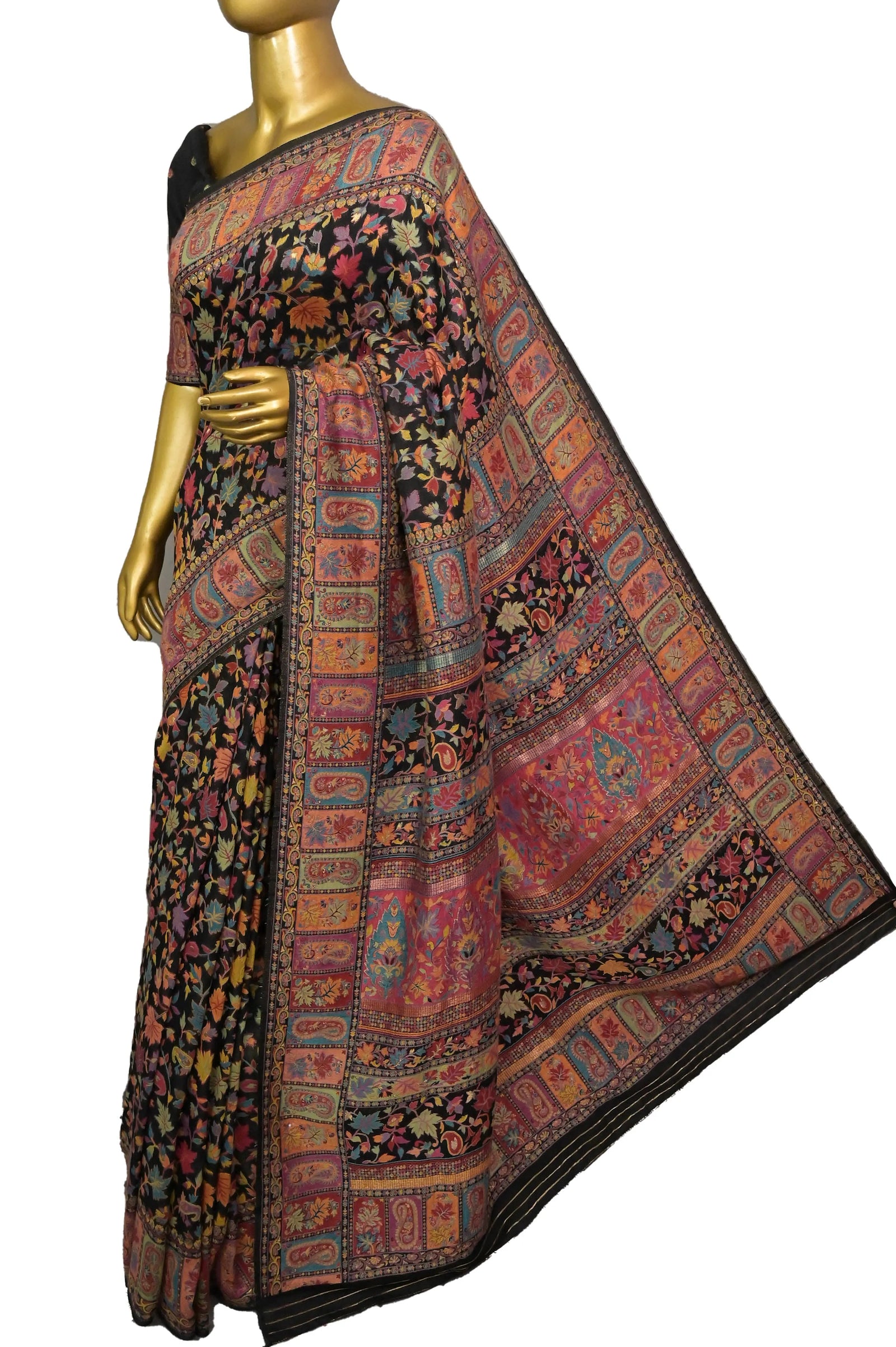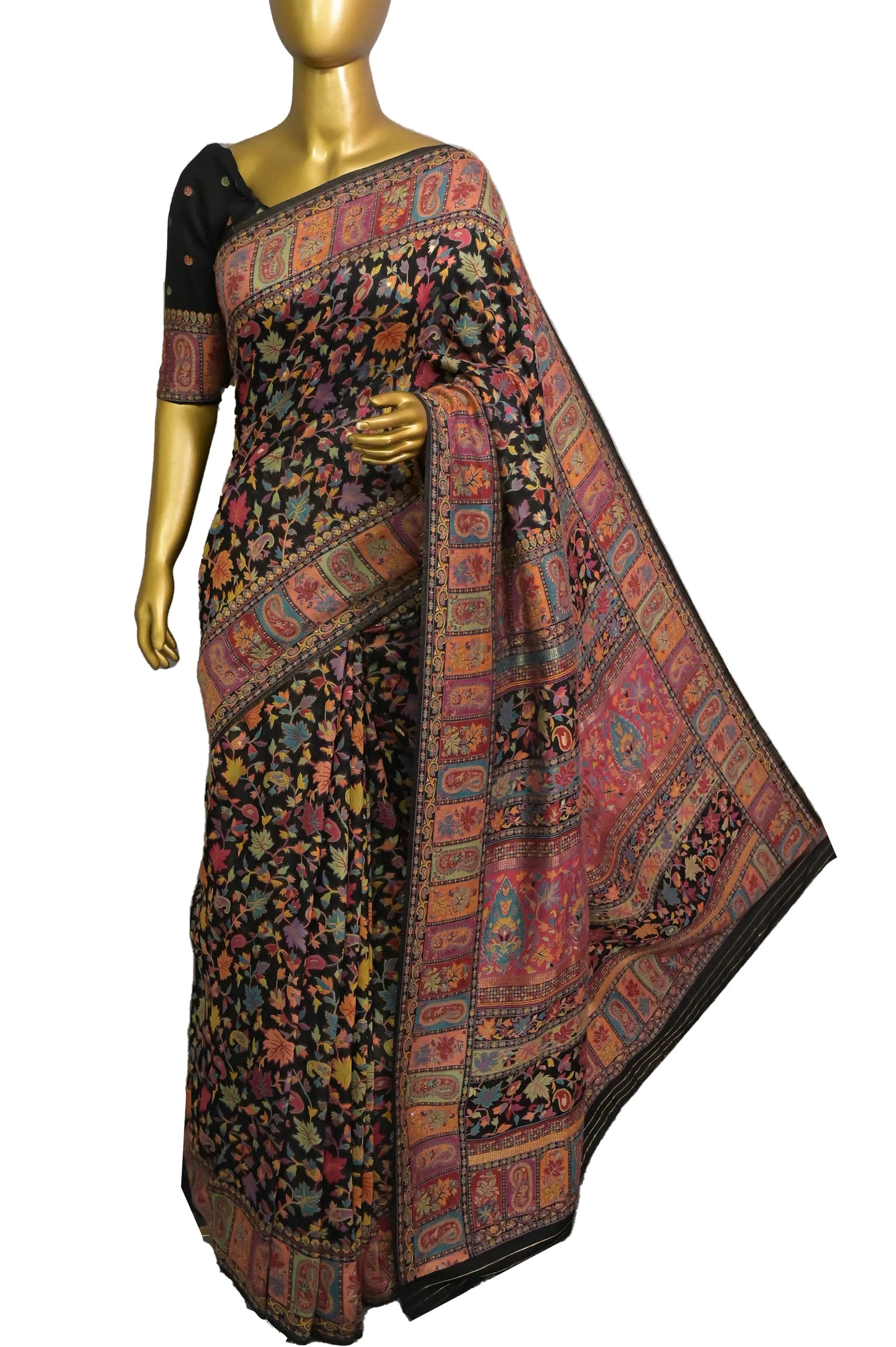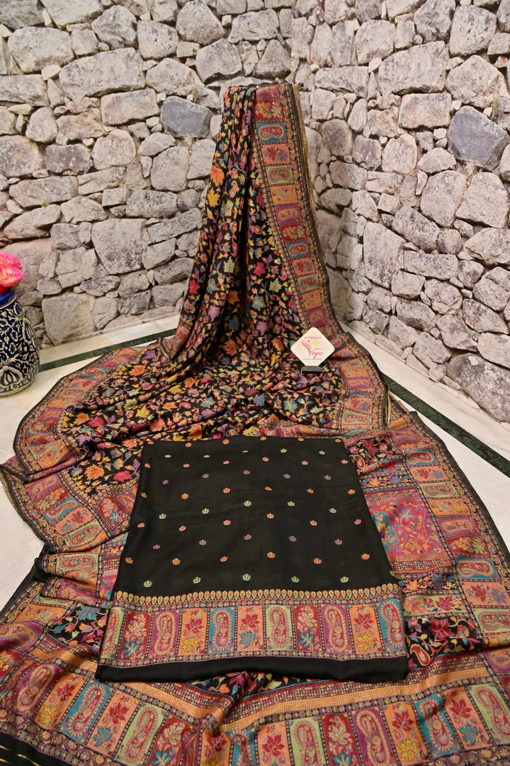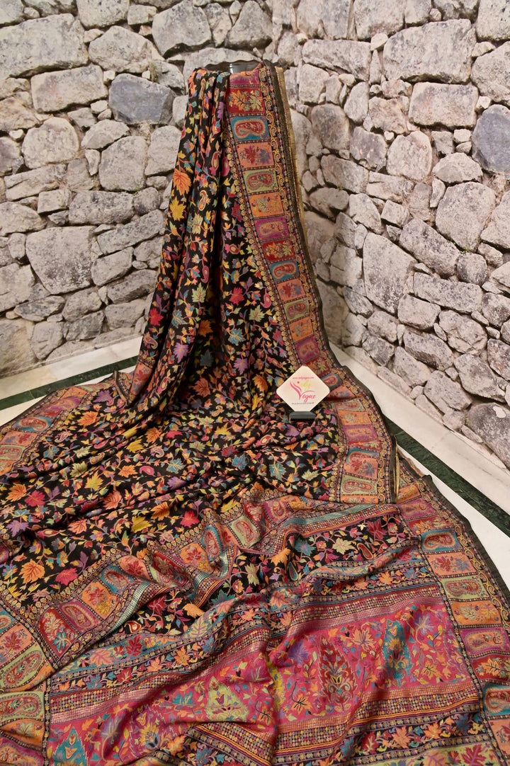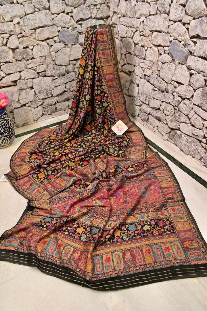 This gorgeous Kani silk saree dazzles in a sleek, asphalt black, adorned with lively multicolored threads and sparkling zari accents. Inspired by the classic Kashmiri weaving craft, it blends traditional charm with a modern, fun vibe. Get set to steal the spotlight every time you wear it!