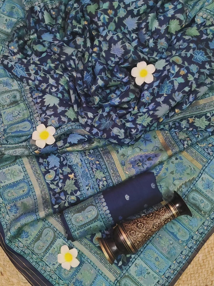 Prepare to be captivated by our Kani Silk Saree, where black and blue dance together in pure elegance. This six-yard wonder showcases exquisite thread and zari work that channels the timeless beauty of Kashmiri Pashmina craftsmanship.