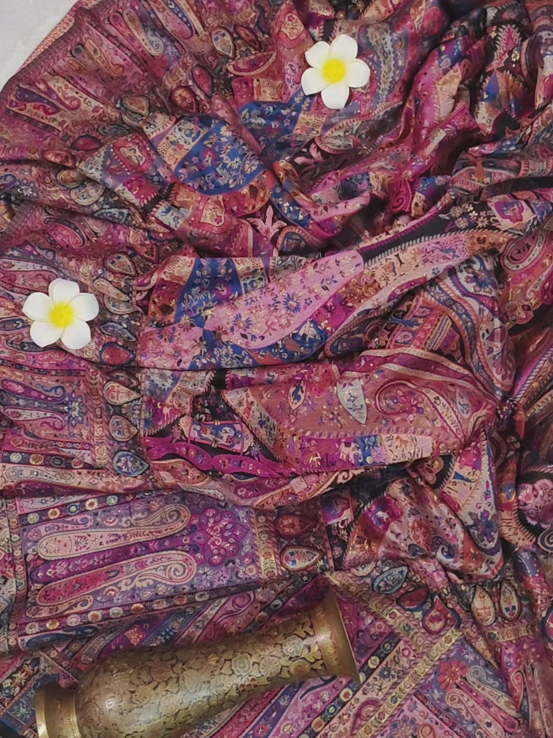 Inspired by the classic Kani silk pashmina style, this saree flaunts intricate meenakari—an age-old art of enameling that gives each thread a vibrant, colorful shine. Imagine delicate floral patterns and elegant motifs, handwoven with precision, adding depth and drama to the rich black canvas.