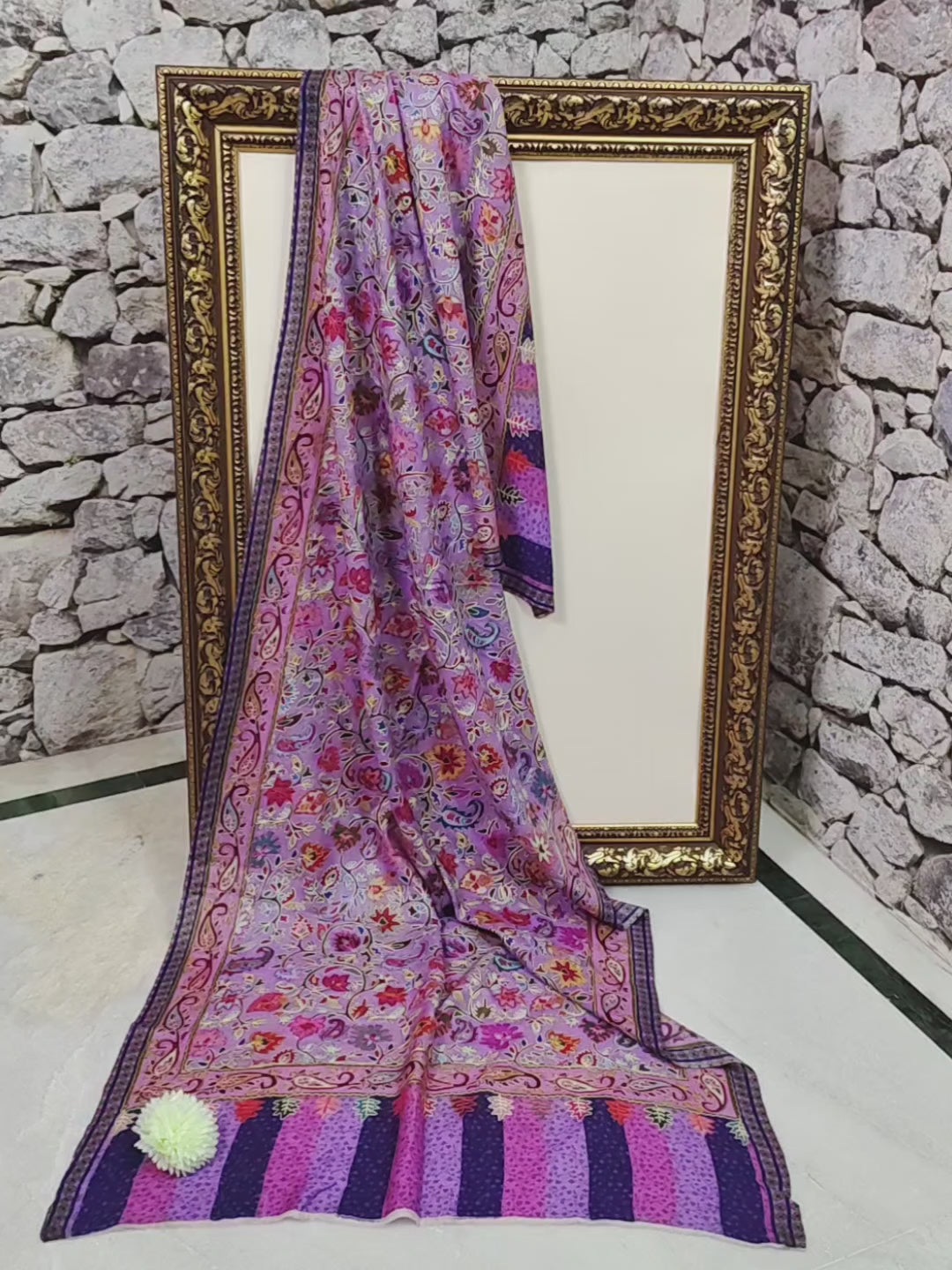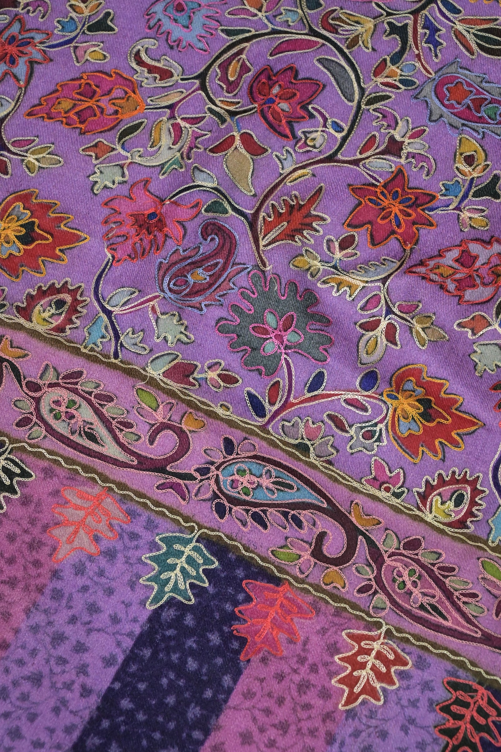 Spice up your outfit with our lavender and multicolored pure pashmina shawl, adorned with Kalamkari print and Ari embroidery for a touch of artistic flair. Stay comfortable and classy with this essential accessory for the winters.