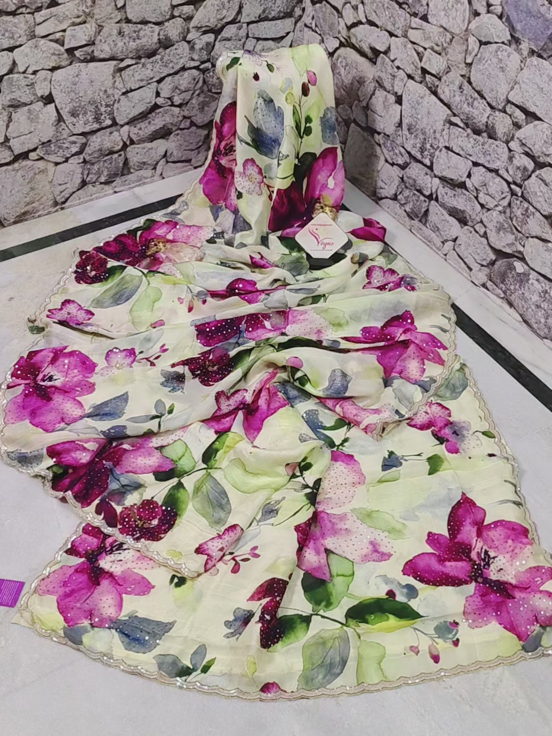 Lemon Cream Color Tussar Satin Silk Saree with Digital Print and Sequin Embroidery with Scallop Border