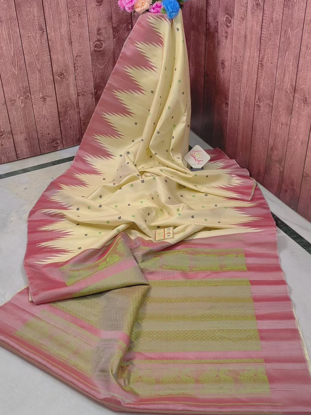 Light Creamish Yellow Color Zero Zari Gadwal Saree with Multicolored Buti and Contrast Temple Border