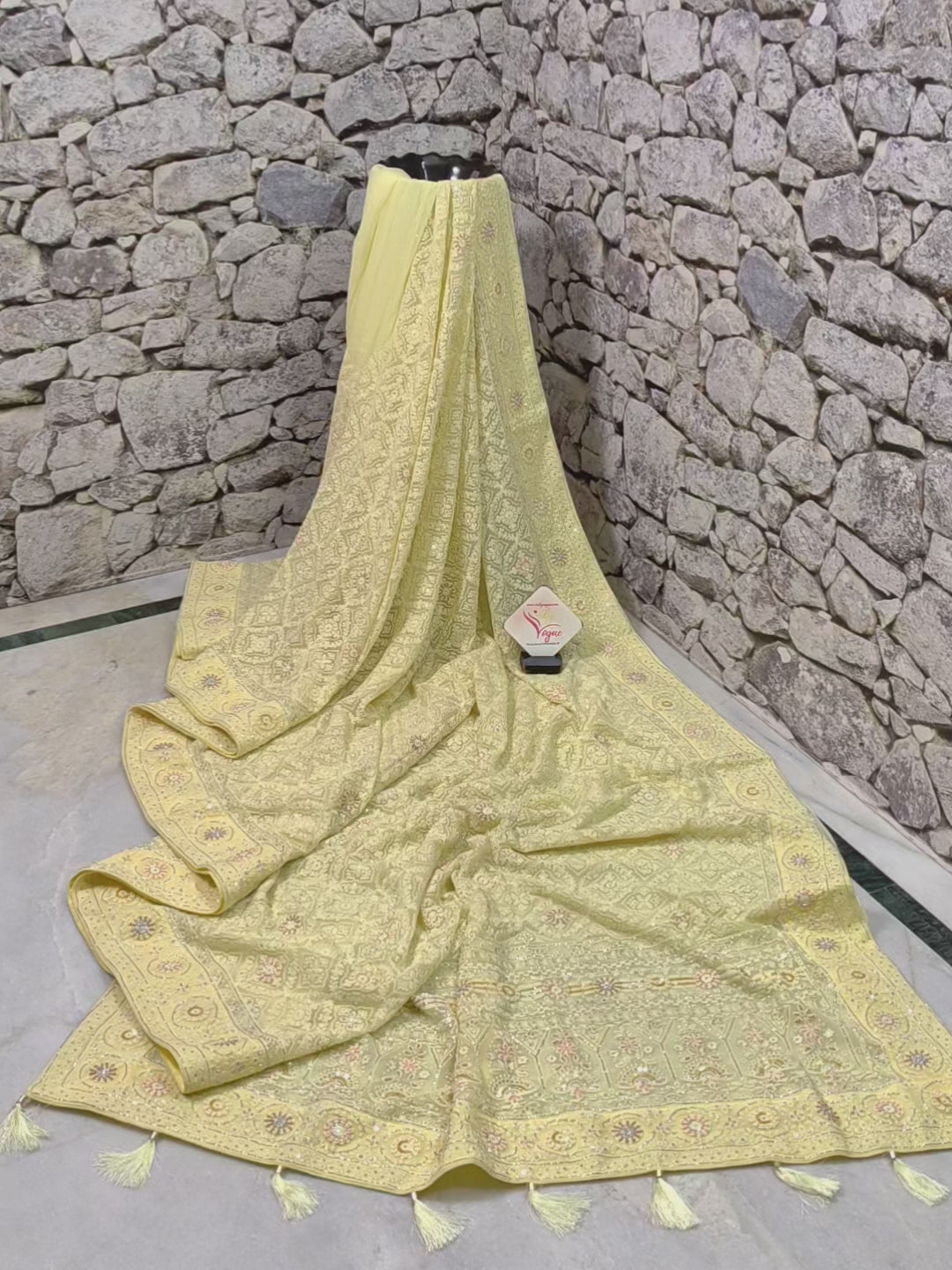 Light Lemon Yellow Color Georgette Chikankari Saree with Multicolored Hand Embroidery Work