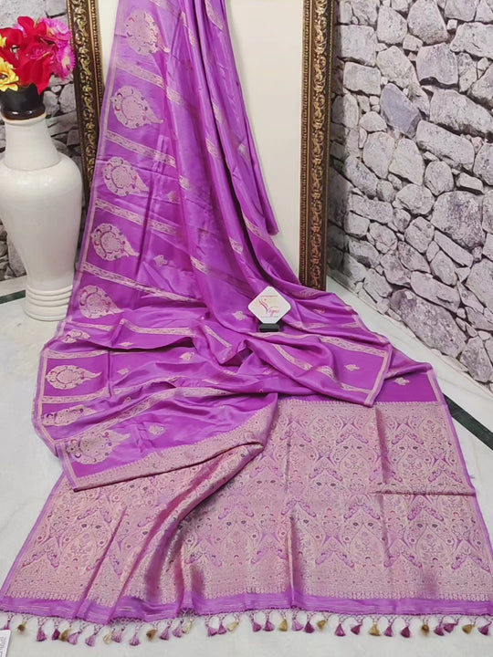 Step into the spotlight with this lavender Matka tissue silk saree that dances with every move. Golden zari stripes catch the light, while meenakari work sparkles throughout, adding a festive glow.