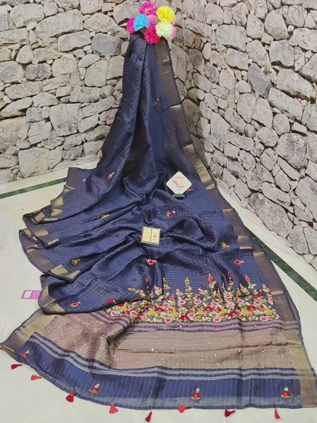 Shop this navy blue color excellent piece of linen silk with zari check work along with French knot and beautiful work of hand Parsi and Kantha embroidery done throughout the body of the saree with a bullion knot to bring out the perfect gorgeous look.