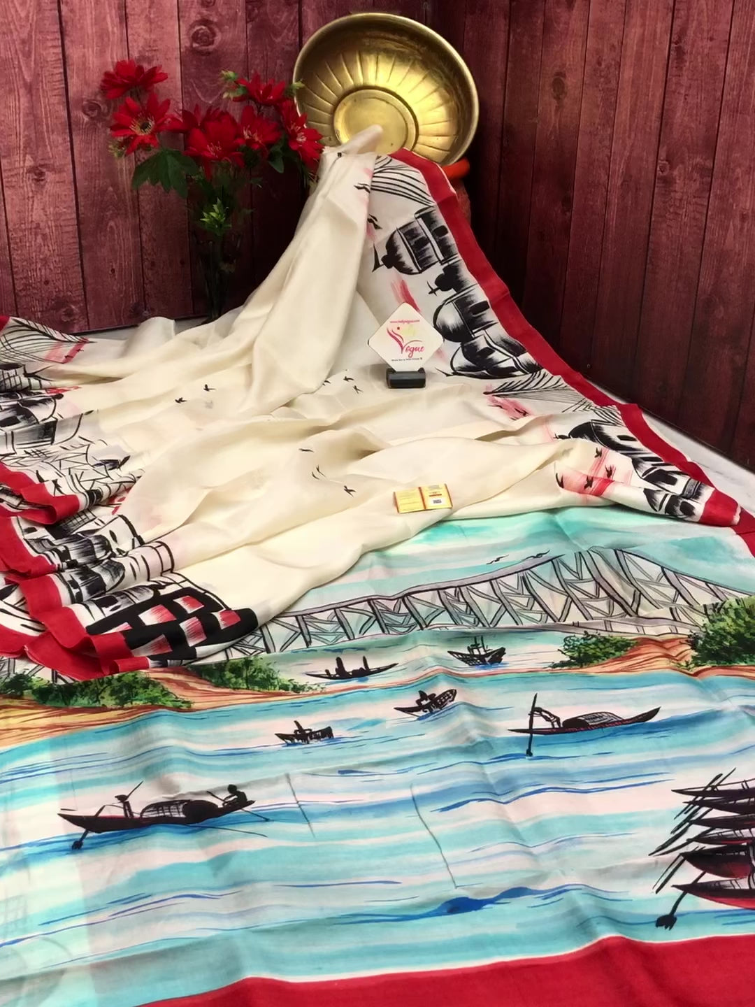 Are you ready to change your saree wardrobe with something different? The urban hand painting of Kolkata scenes - let's take an example of this one - paints the scenic beauty of the flowing Ganges and the iconic boats rowing on the river and under the Howrah Bridge. What can be more elevating that this cityscape? Hand-painted beautifully in multiple colors on this off-white and red silk mark saree.