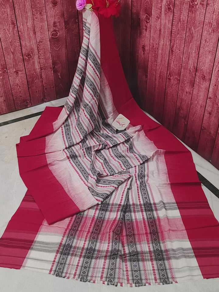 Elevate your style with this one-of-a-kind saree in off-white and red with multiple other colors, crafted from pure Dhaniakhali Khadi cotton. With a bold black, white, and red kalka motif stripe design and lively bold red borders, this saree perfectly blends classic and contemporary elements for a playful yet sophisticated look suitable for any occasion.