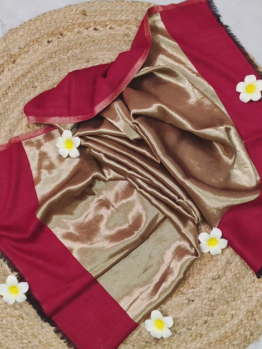 Step into refined winter style with this exquisite maroon and golden Pashmina stole, crafted to make every outfit feel instantly elevated. The beautifully reversible shimmer design lets you switch between rich maroon depth and soft golden glow, giving you versatile elegance in one wrap.