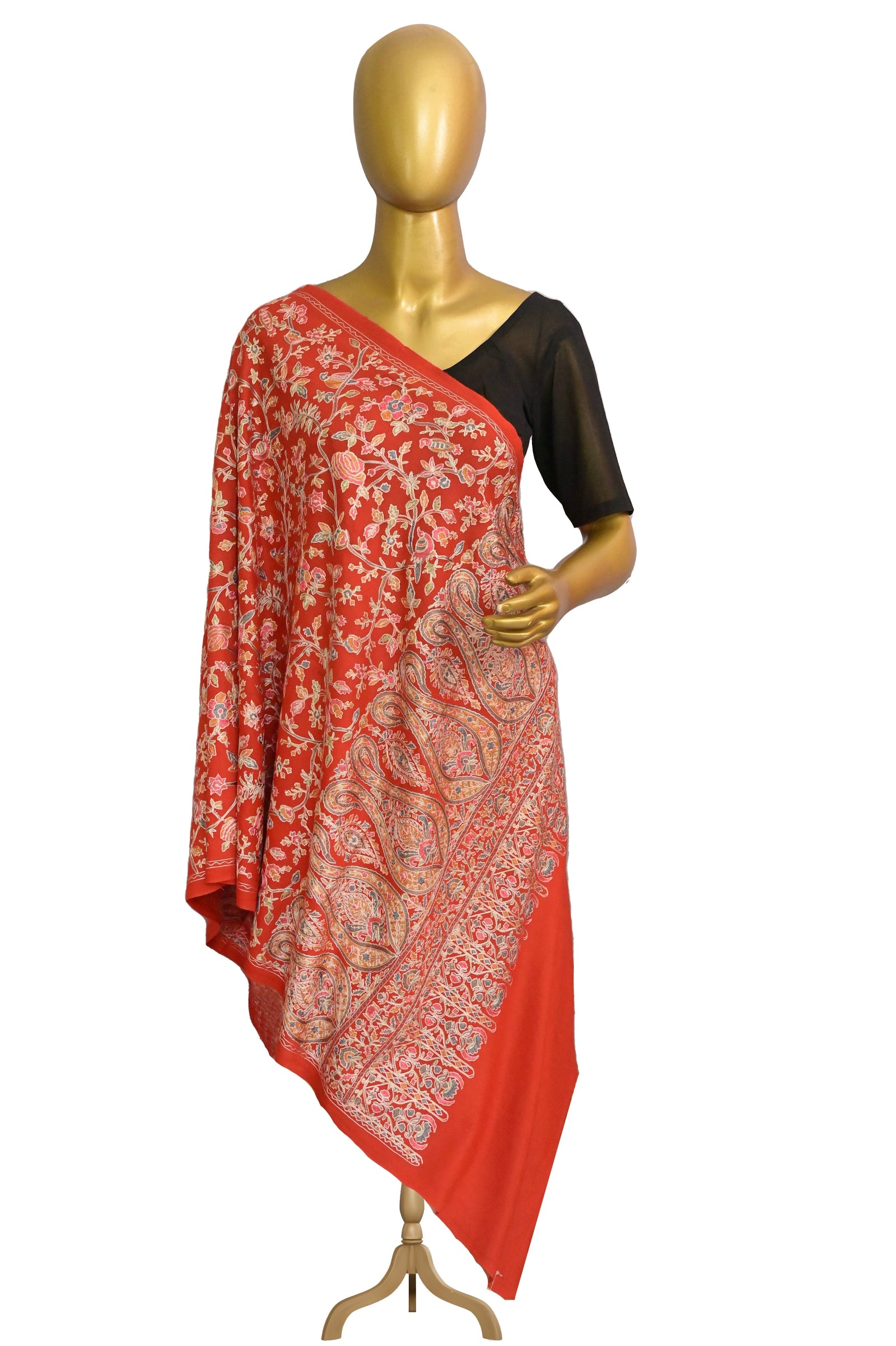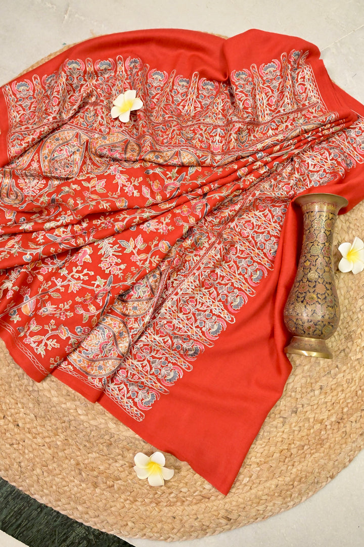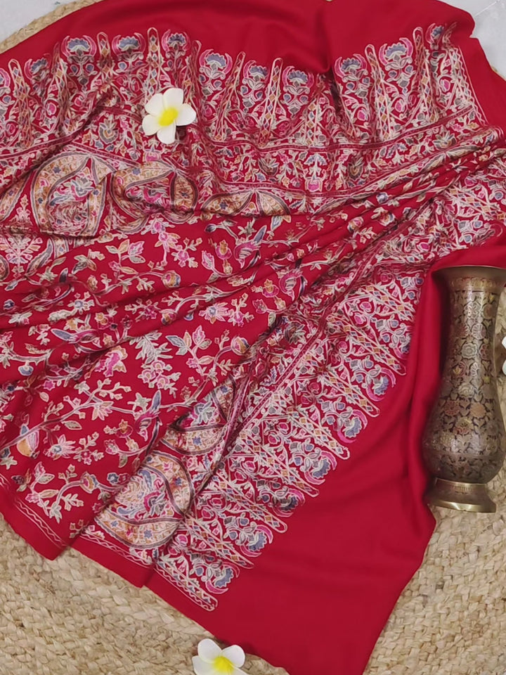 Share the warmth of pure elegance with our red Pashmina stole, adorned with all-over fine Ari embroidery crafted meticulously using luxurious silk thread. This piece blends warmth, artistry, and heritage into one timeless accessory. Soft to the touch yet rich in detail, it elevates any outfit — festive, formal, or casual — with graceful sophistication. Perfect for the woman who appreciates craftsmanship and comfort in every fold.