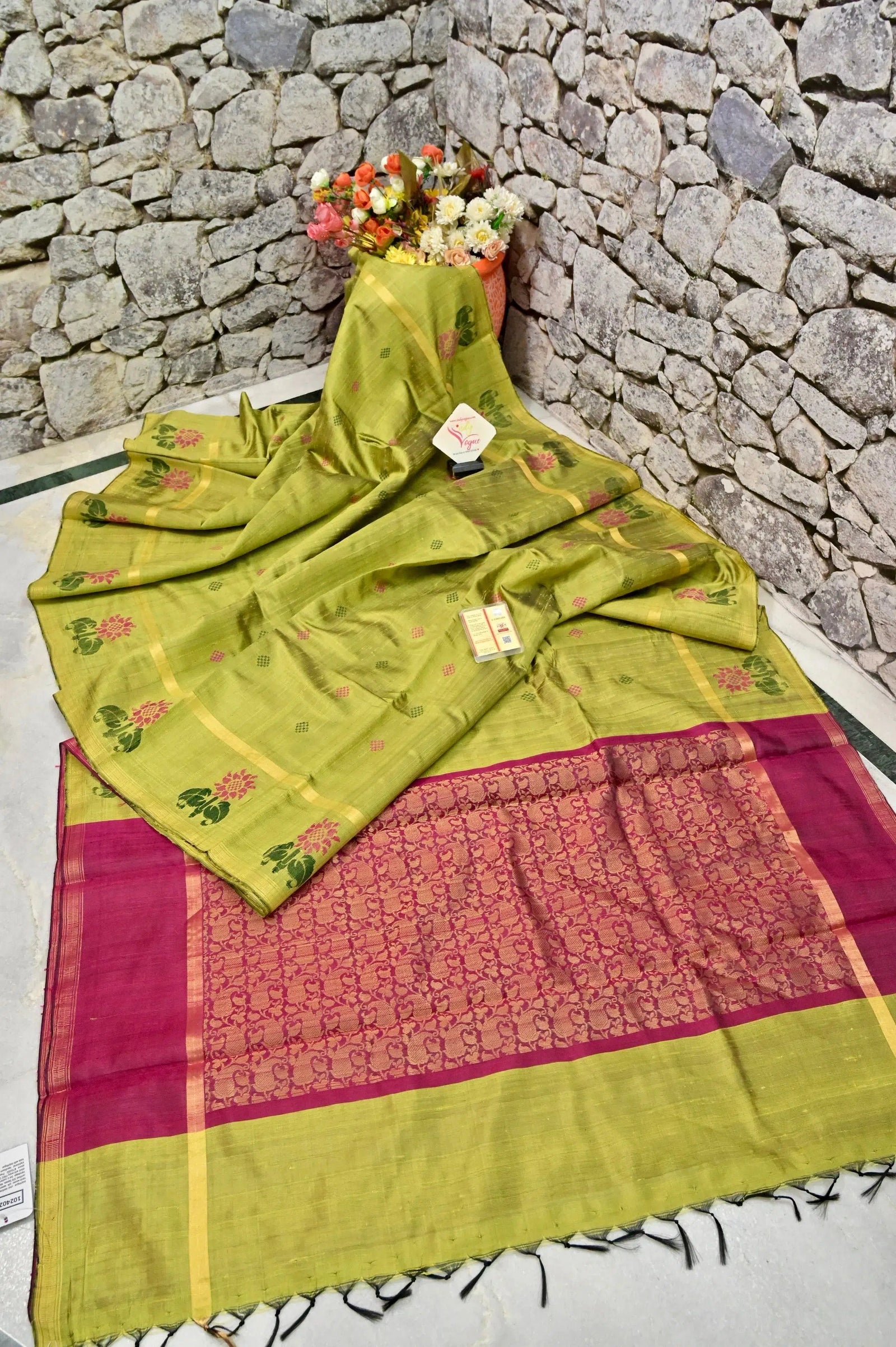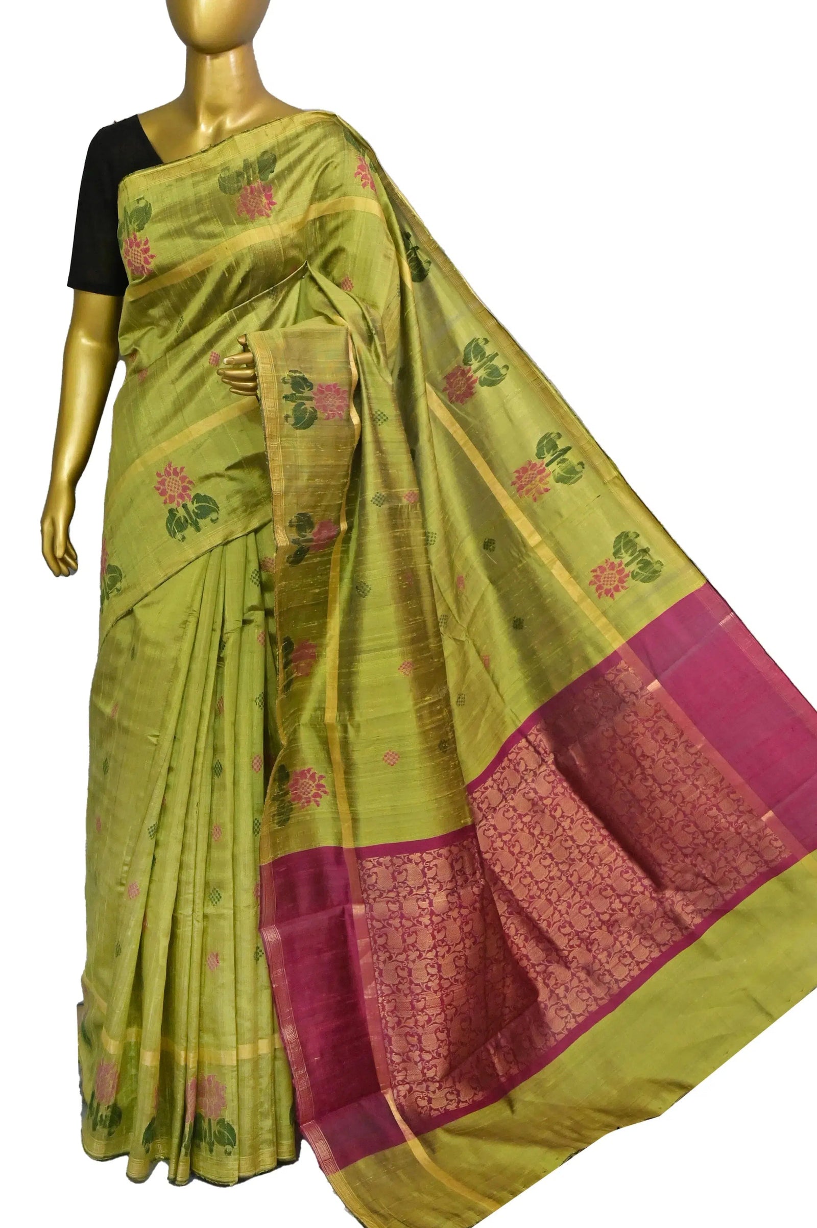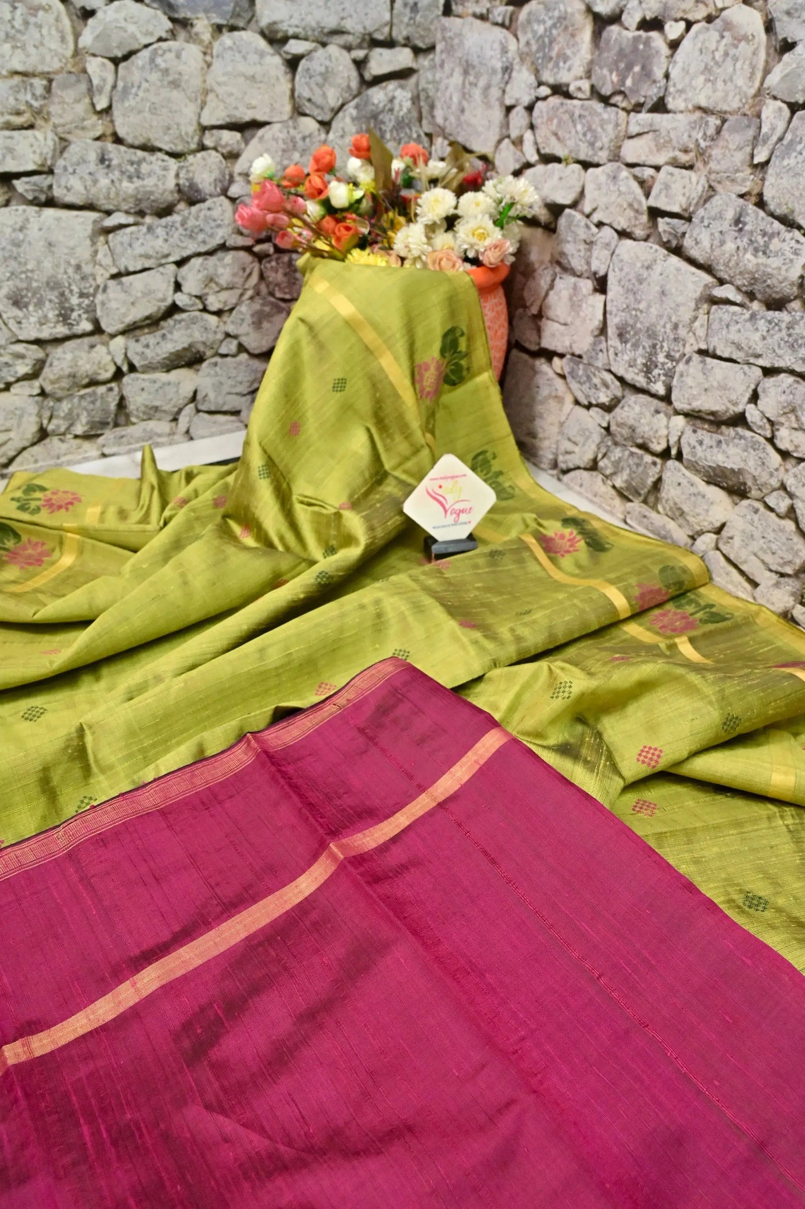 Pista Geeen and Rani Color Pure Raw Silk Saree with Floral Motif in Gap Border