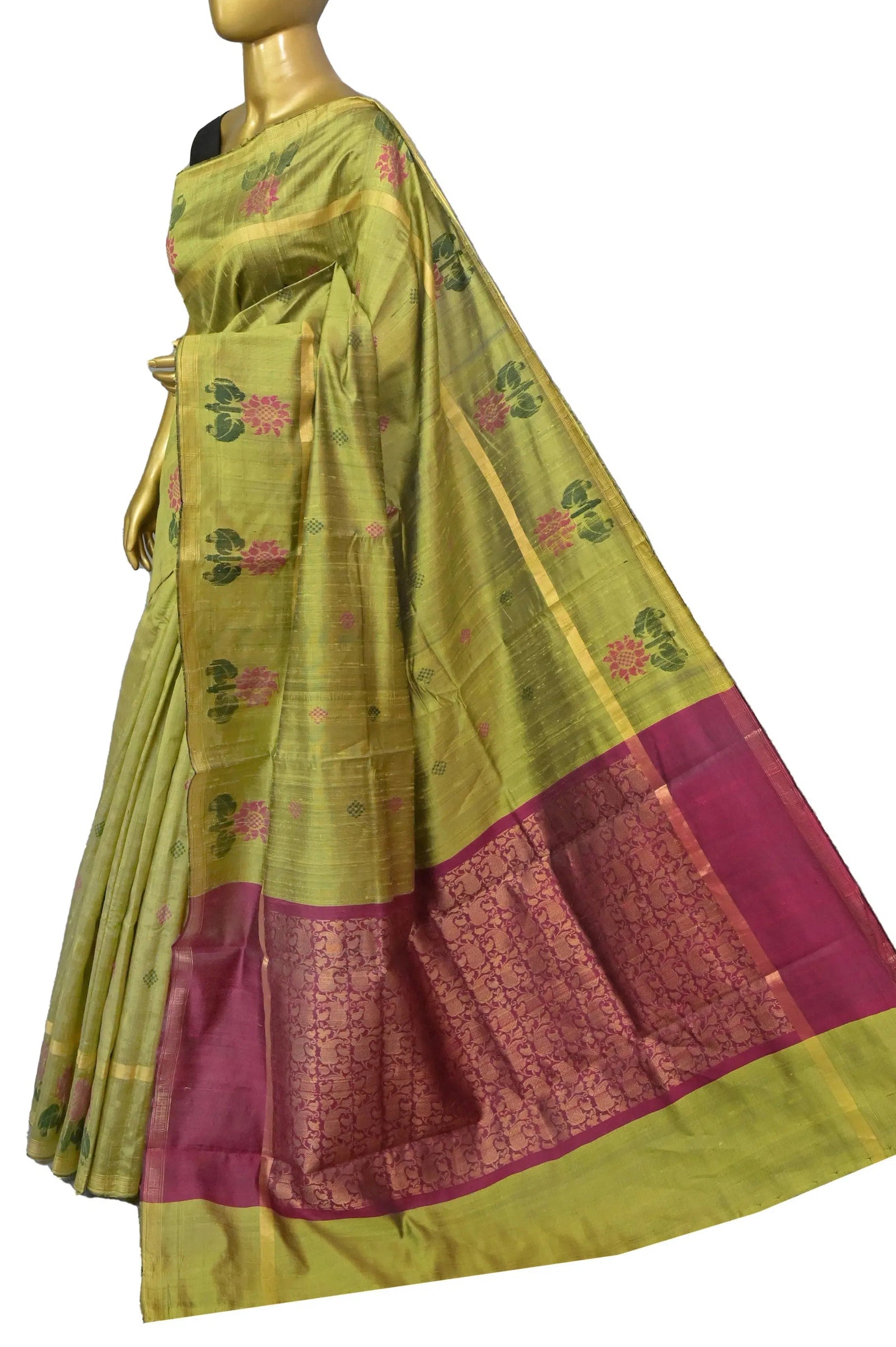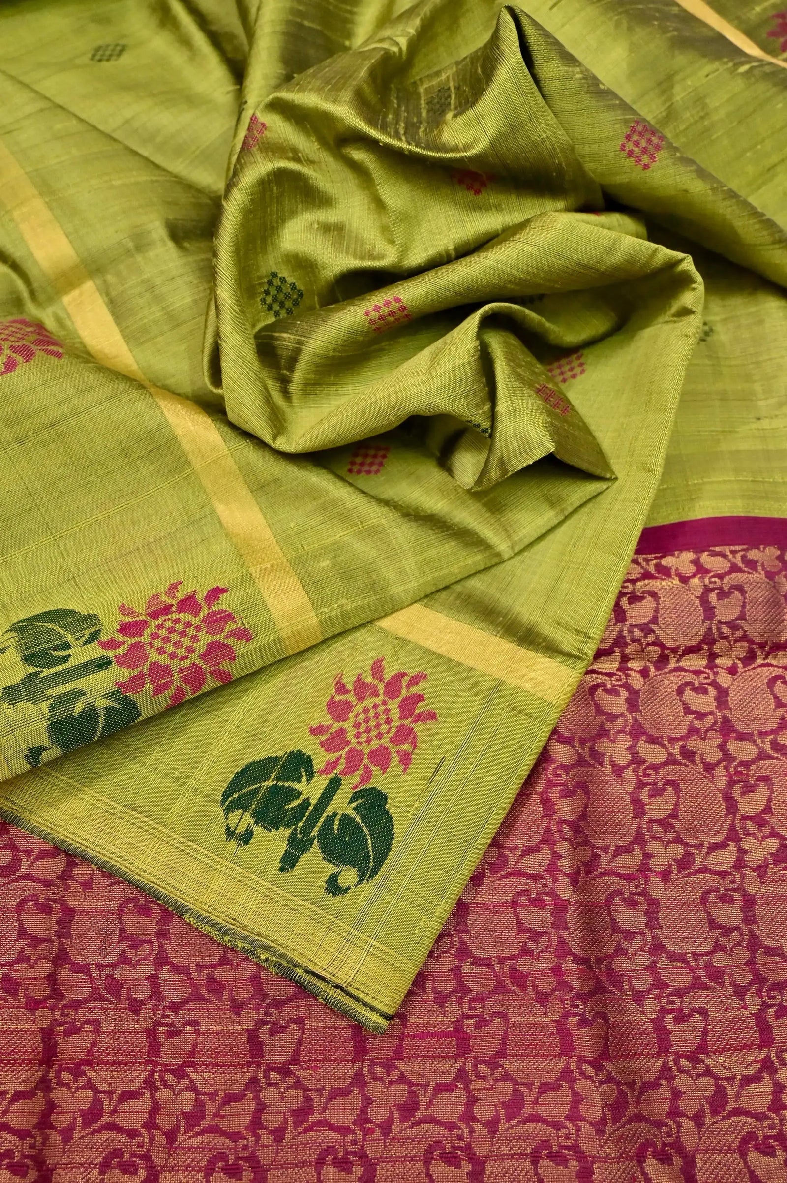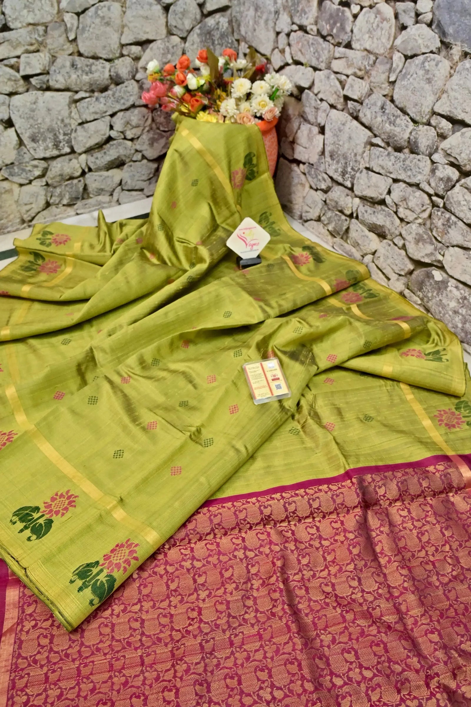 Pista Geeen and Rani Color Pure Raw Silk Saree with Floral Motif in Gap Border