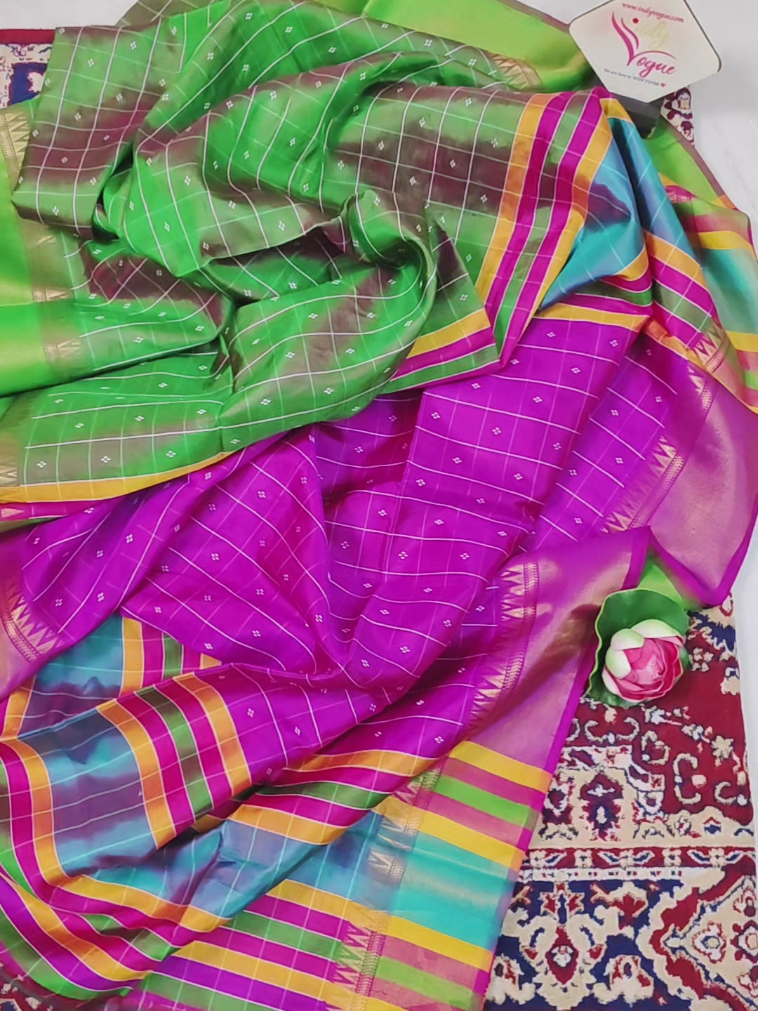 Pure Bishnupur Katan Saree in Magenta and Green Dual Tone with Allover Thread Checks Weaving and Butta Work