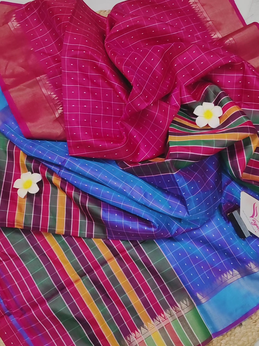This Pure Bishnupur Katan (Kalakshetra) saree in vibrant reddish magenta is your ticket to making a bold statement! Featuring intricate thread checks woven throughout and delicate butta work, this Kalakhetra masterpiece demands attention with its fearless color palette.