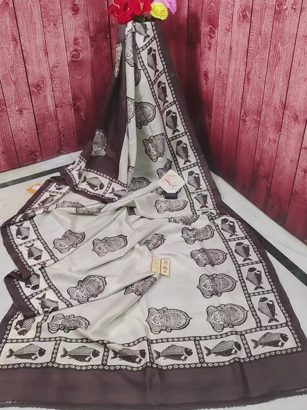 Celebrate the fusion of art and tradition with this exquisite Pure Bishnupur Silk Saree in a striking combination of deep brown and off-white. Adorned with intricate hand-done block prints, this masterpiece pays homage to Kerala’s celebrated dance theatre—Kathakali. The saree features bold motifs of iconic Kathakali masks, reflecting the drama and vibrancy of the performance, along with the symbolic meen (fish) motif, representing prosperity and abundance in Indian culture.
