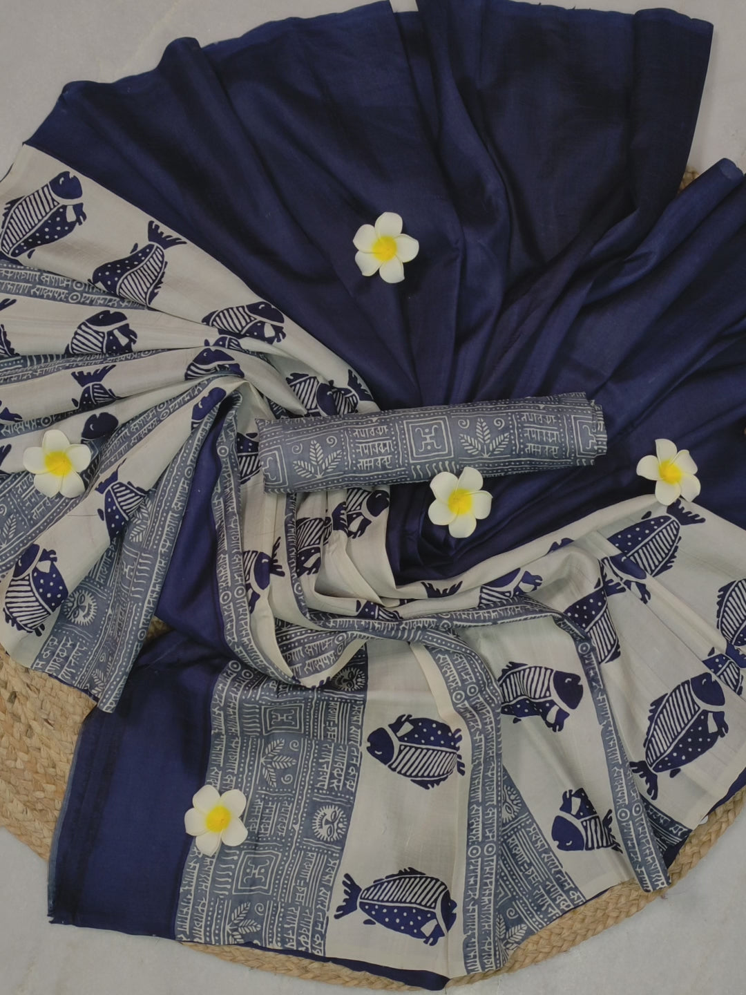 This stunning space blue color pure Bishnupur Silk saree is a must-have addition to your wardrobe. Adorned with delicate hand block prints in classic navy blue on the white broad pallu in a geometric, floral, and script print pattern.