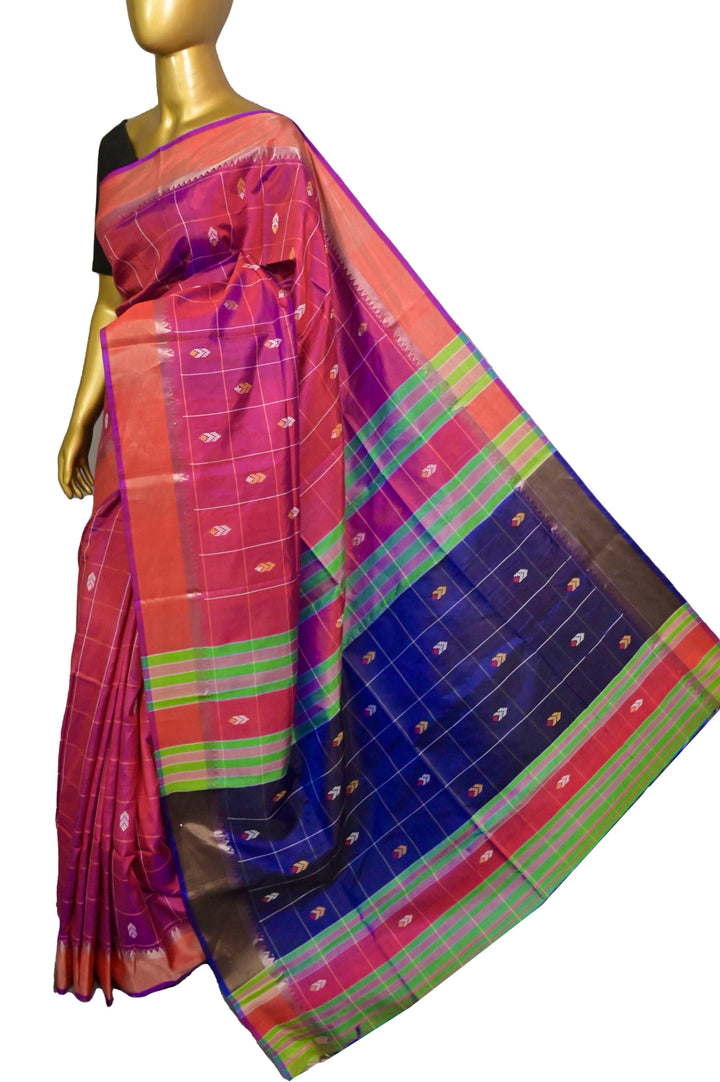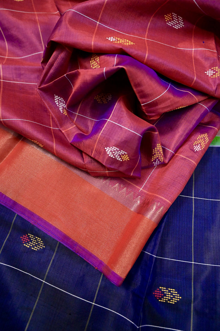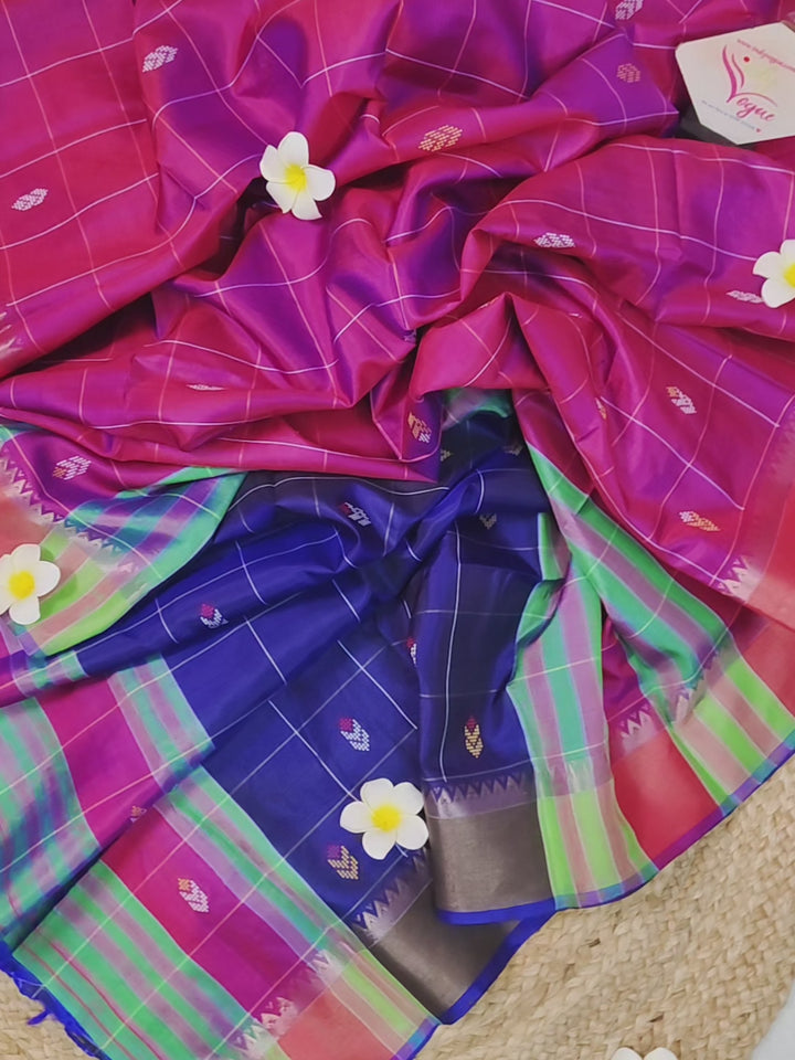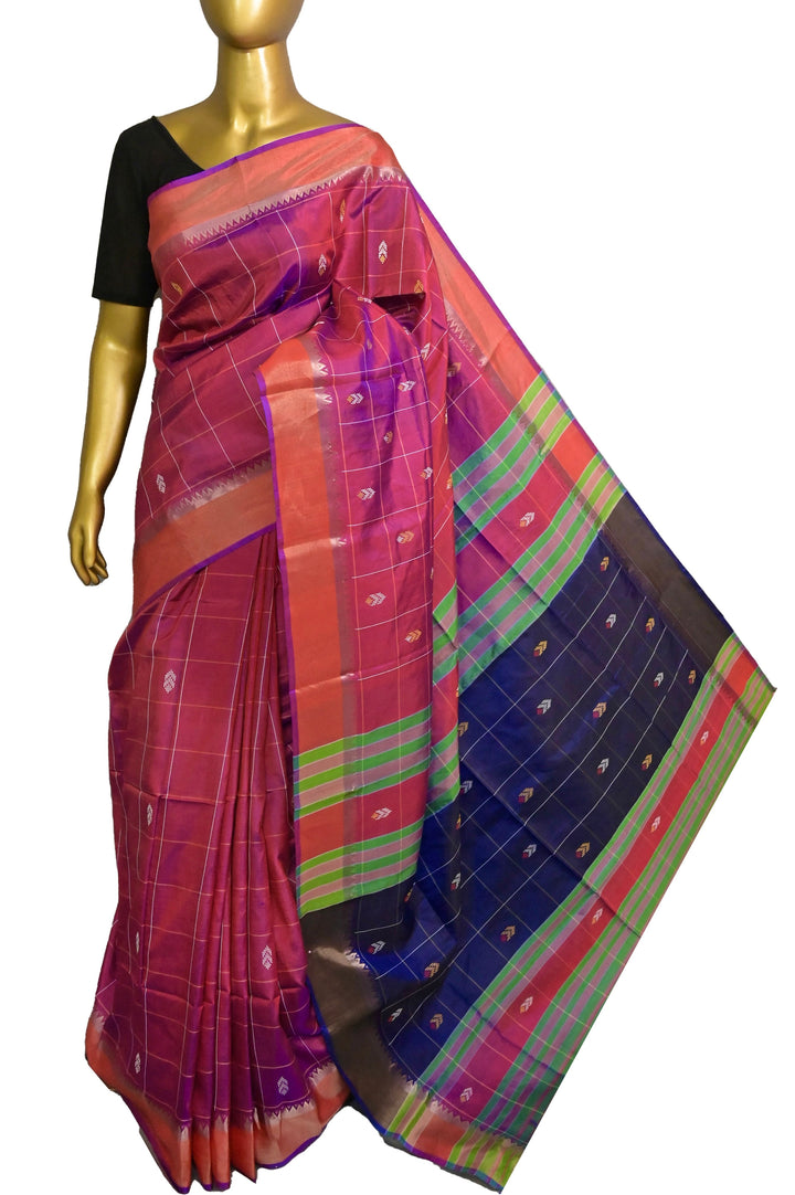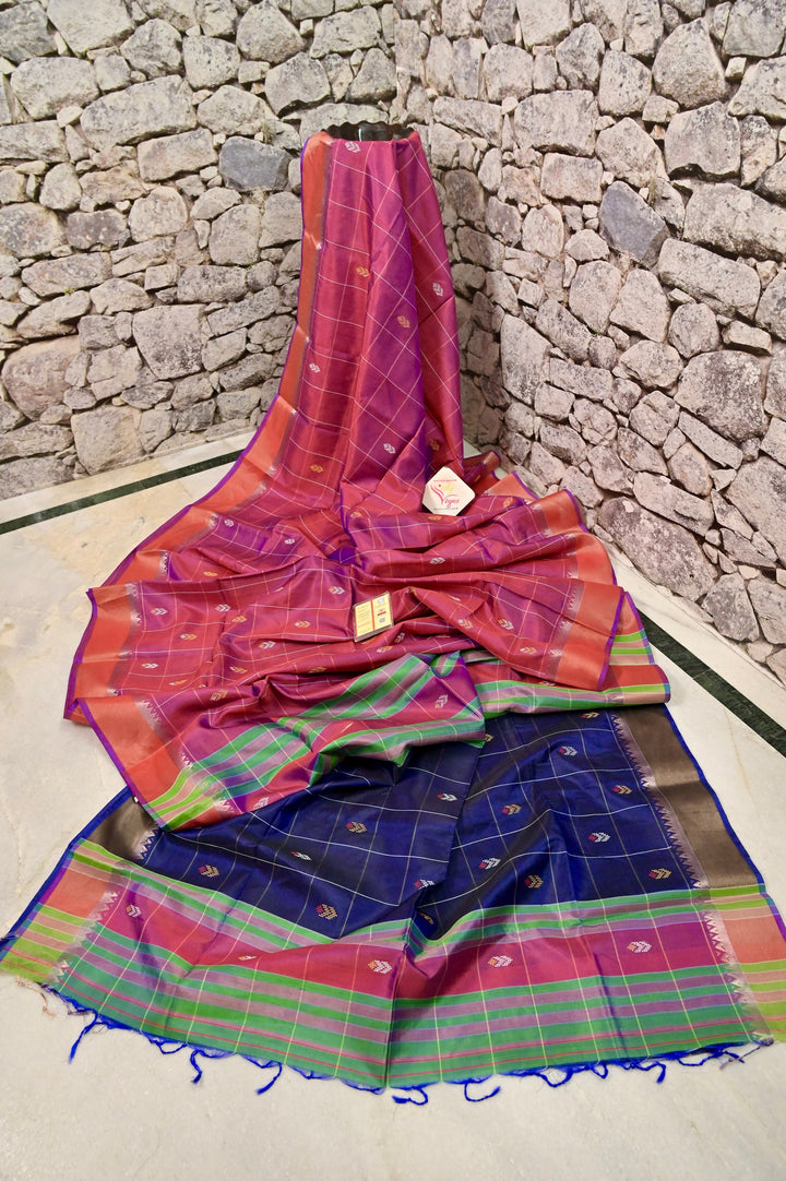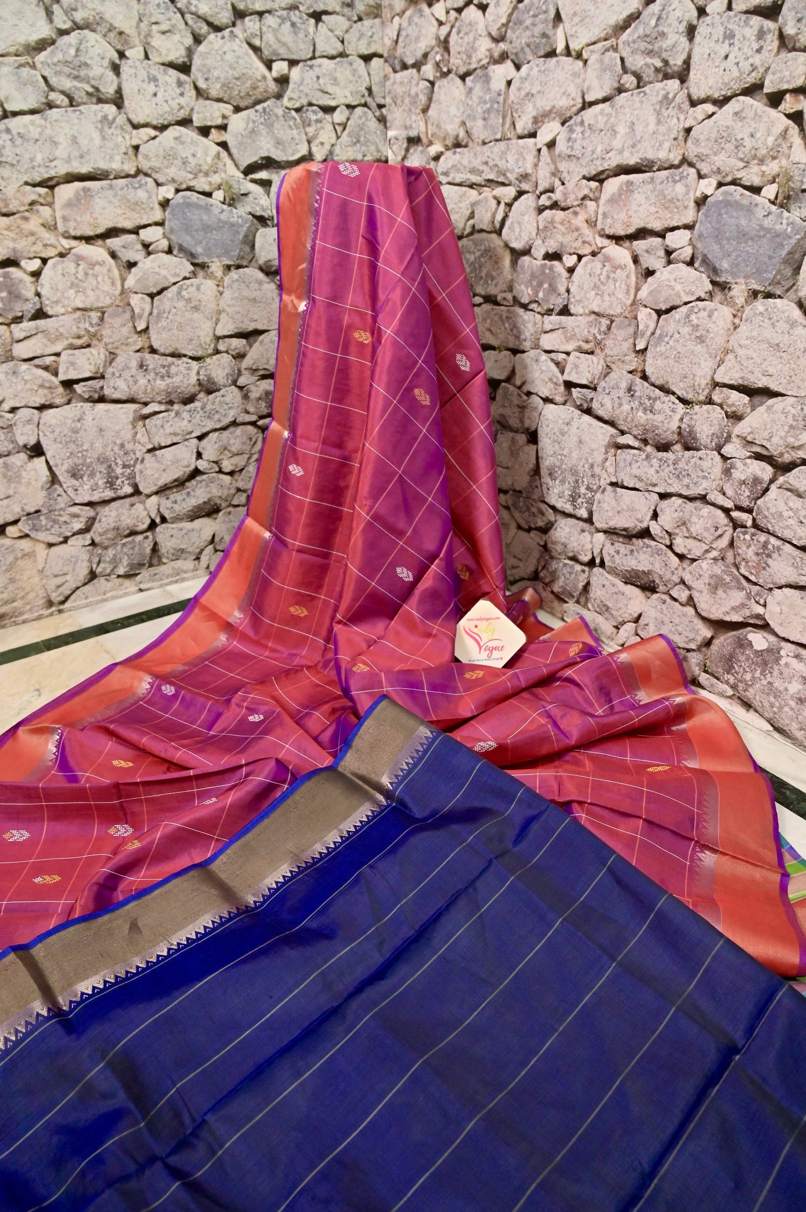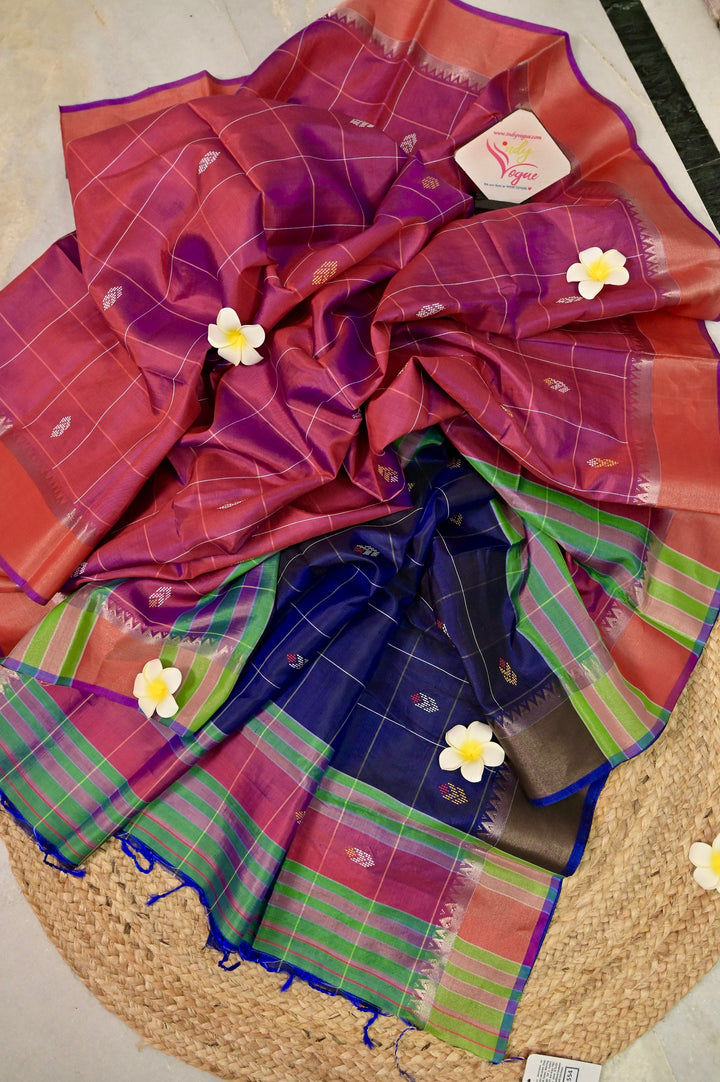 Pure Bishnupuri Katan Silk Saree in Blue and Magenta Dual Tone with Allover Thread Checks and Butta with Zari Border