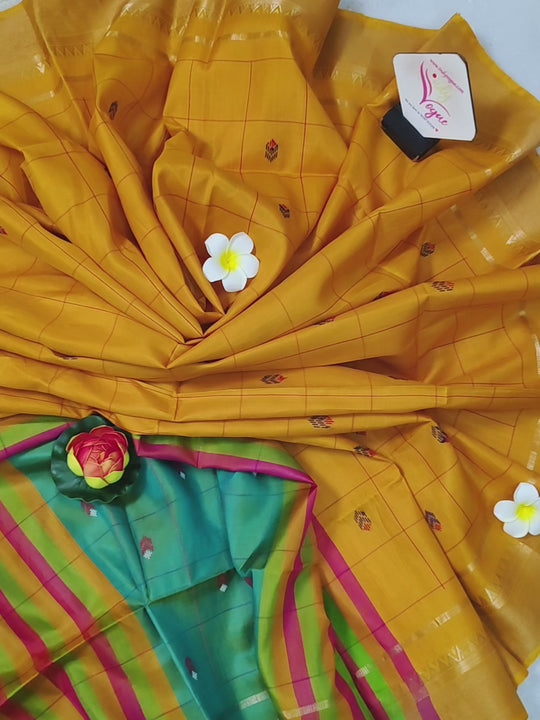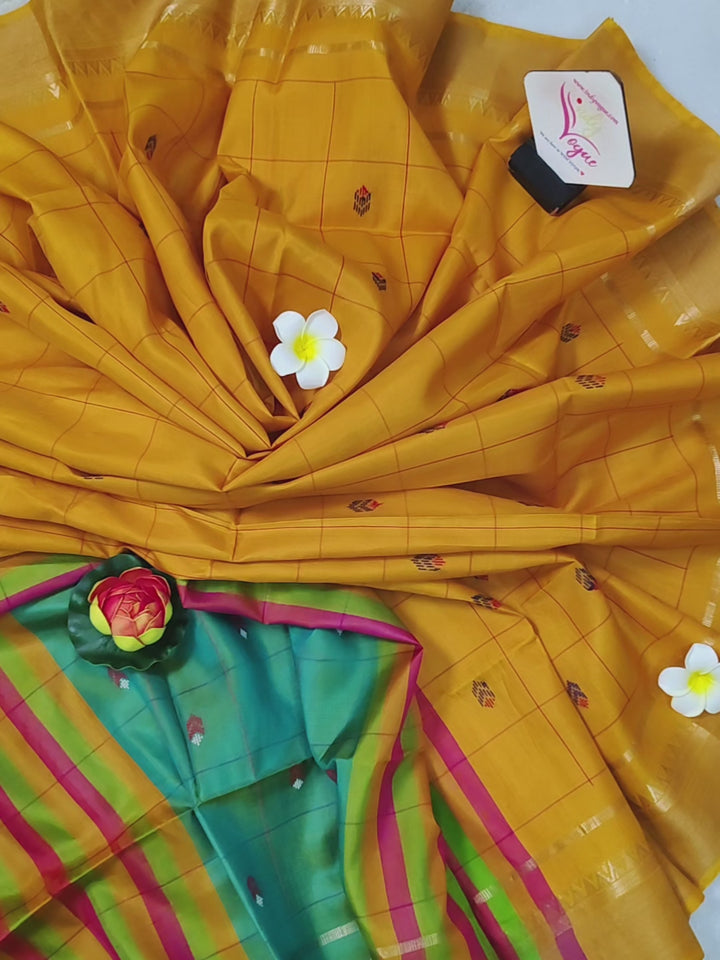 Pure Bishnupuri Katan Silk Saree in Golden Yellow Dual Tone with Allover Thread Checks and Butta with Zari Border