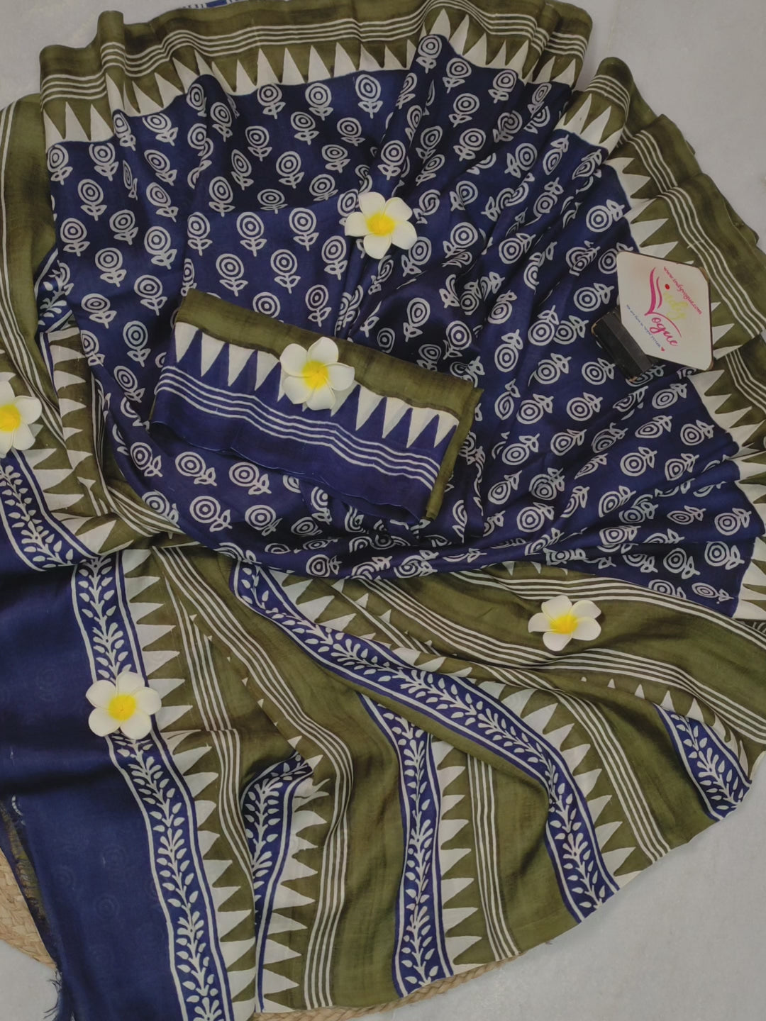 Pure Bishnupuri Silk Saree in Blue and Mehendi Green Color with Block Print Work
